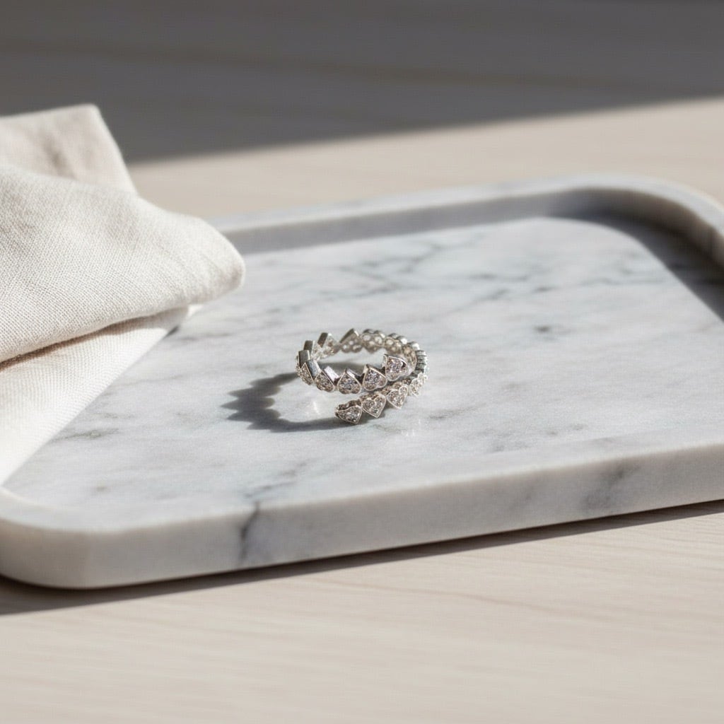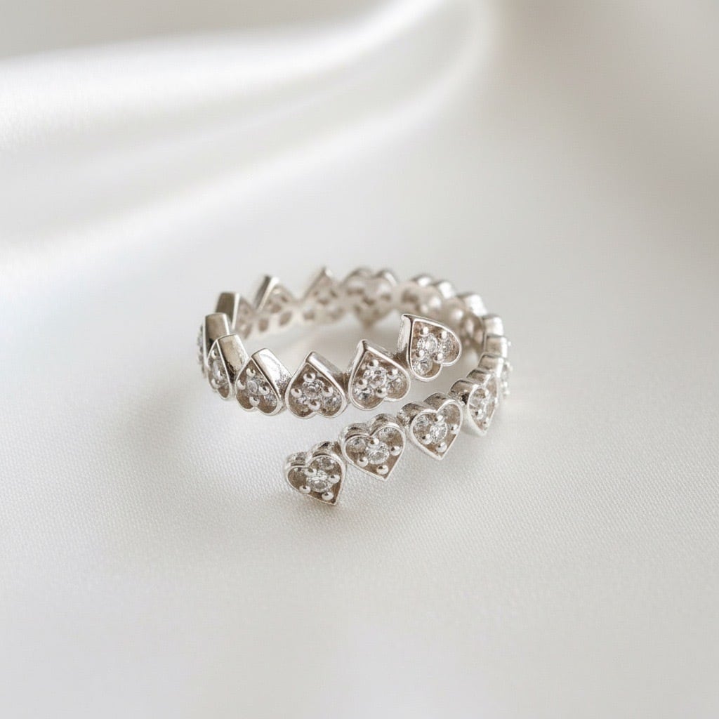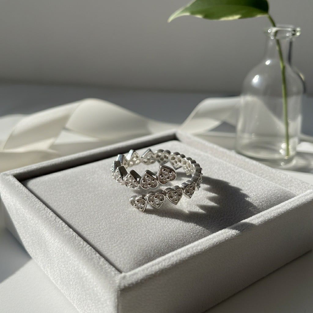 繊細に連なるハートモチーフにキュービックジルコニアを丁寧にセットした、上品で華やかなデザインのリング。ひとつひとつのハートが光を受けてきらめき、指先にやさしい存在感を添えます。