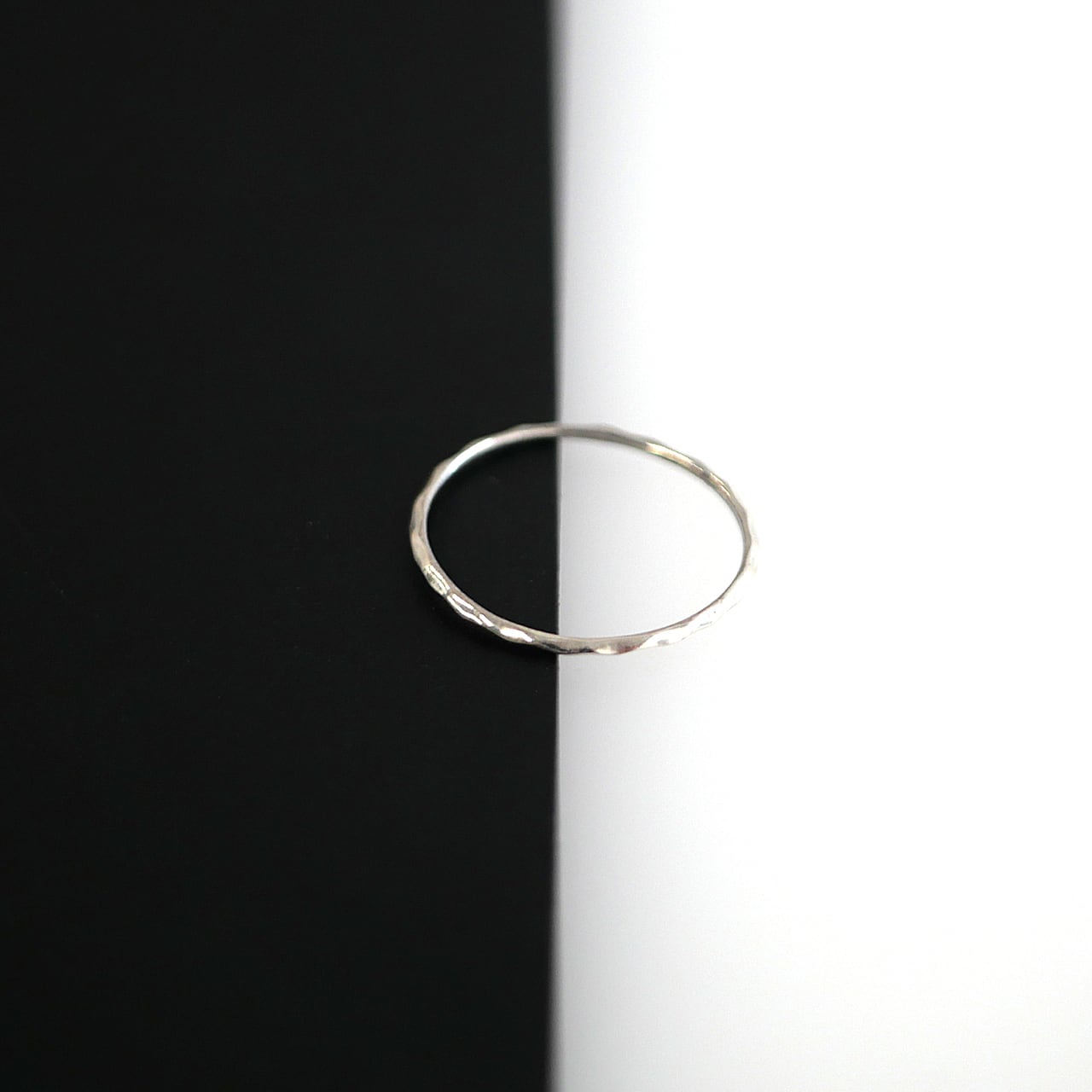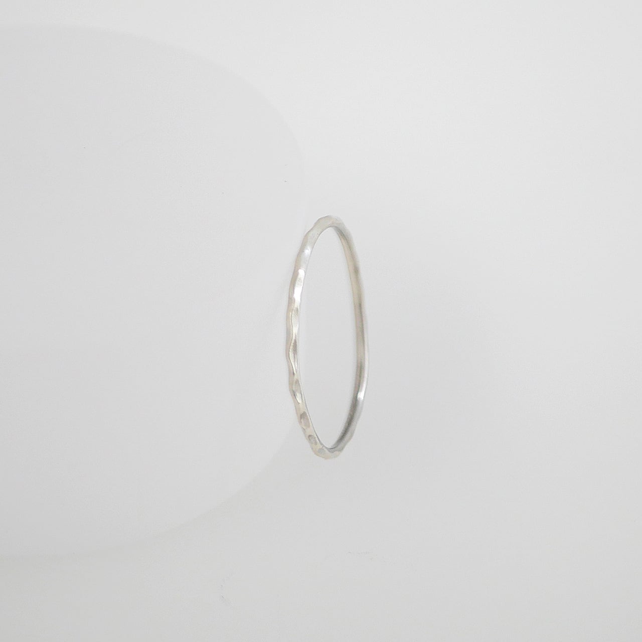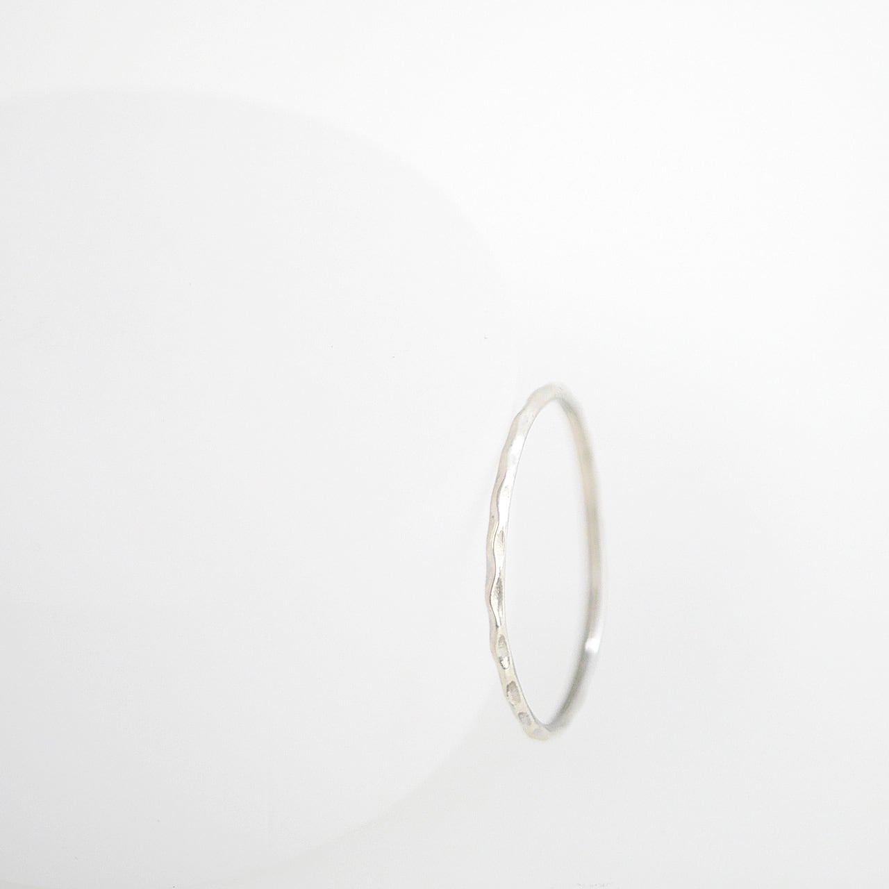 繊細なラインが美しく輝く、シルバー925製の極細リング。約1mm幅の華奢なフォルムに、手仕事で施された凹凸のテクスチャーがさりげない光をまといます。単体ではミニマルに、重ね付けすれば指先に奥行きを生み出すデザイン。