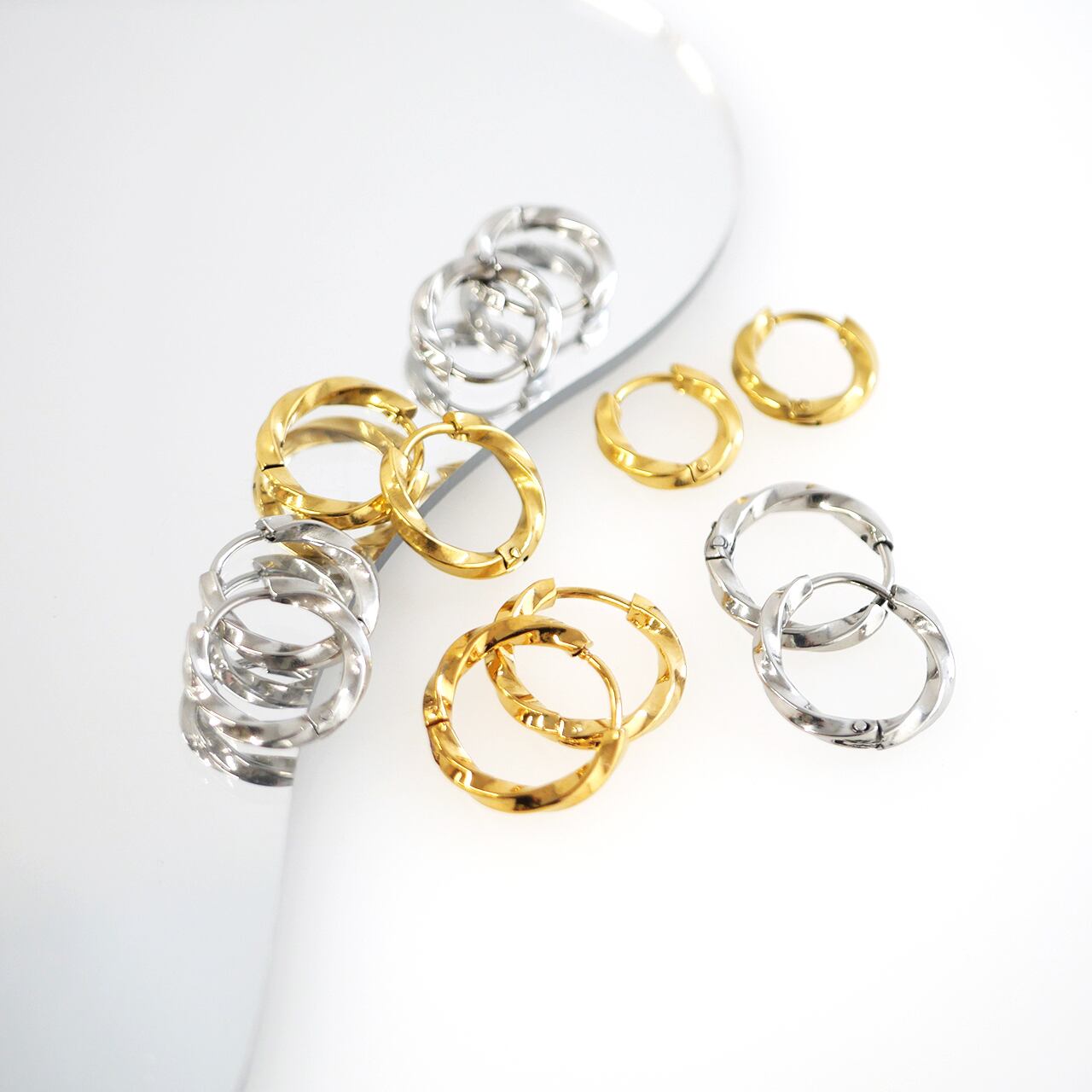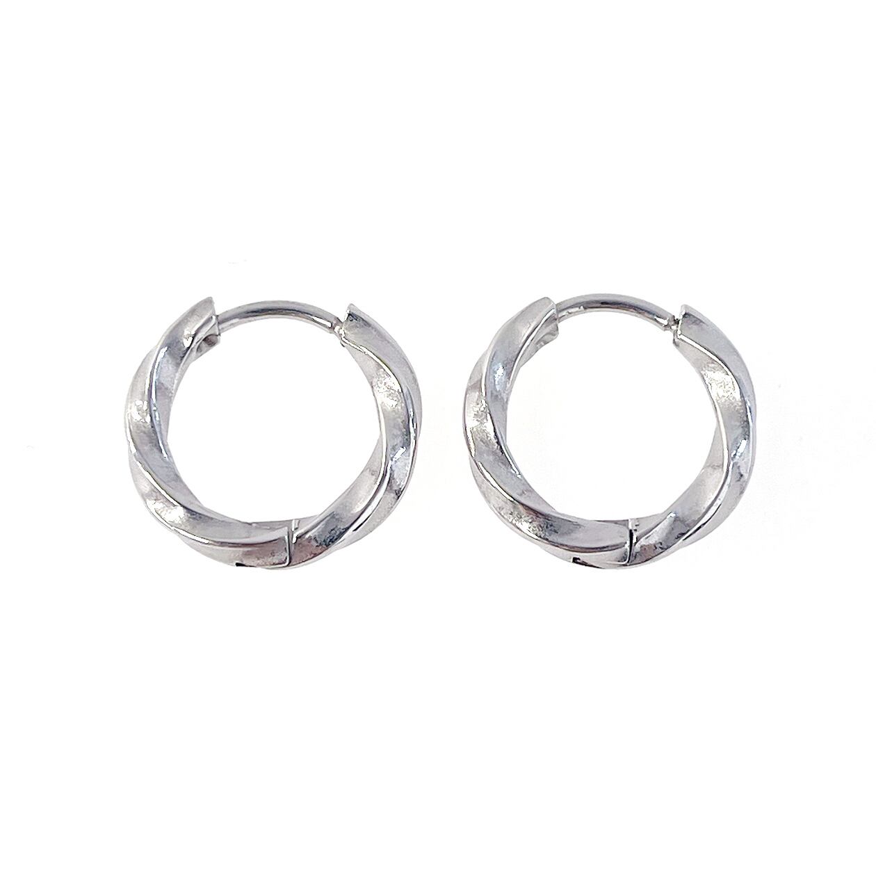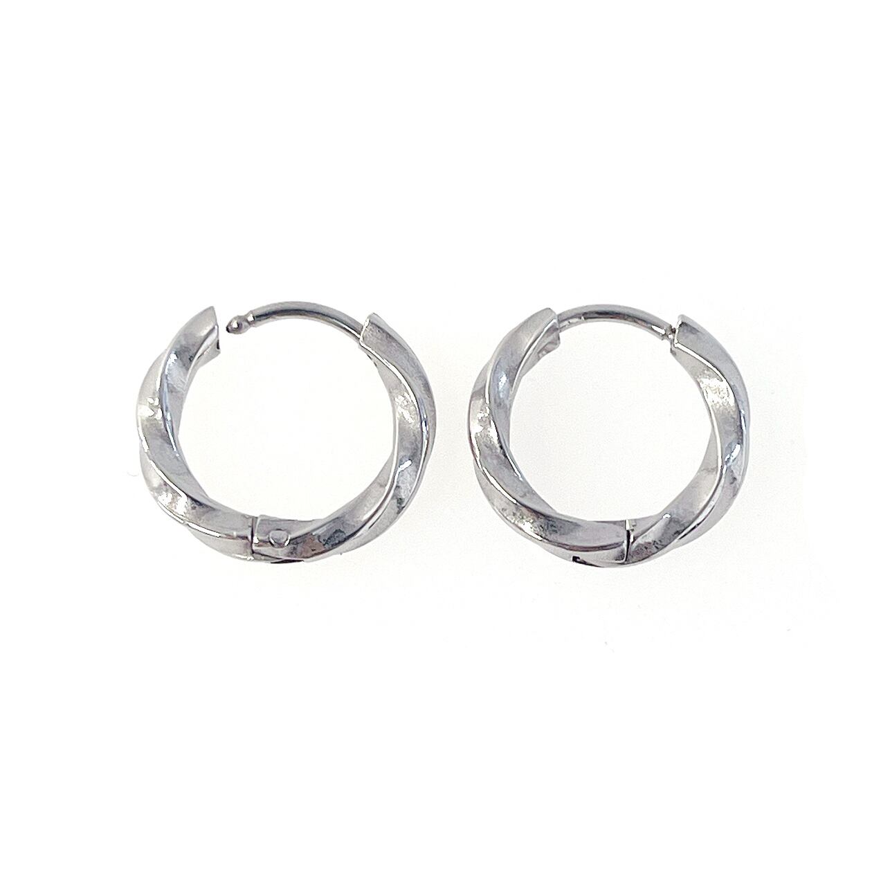 ほどよいボリュームとツイストデザインが魅力の、サージカルステンレス製フープピアス。角度によって光を受けて輝く立体的なフォルムが、顔まわりを上品に彩ります。サイズは外径約13mm・15mm・17mmの3サイズ展開。シンプルながら存在感のあるデザインで、デイリーにもフォーマルにも合わせやすい万能アイテムです。