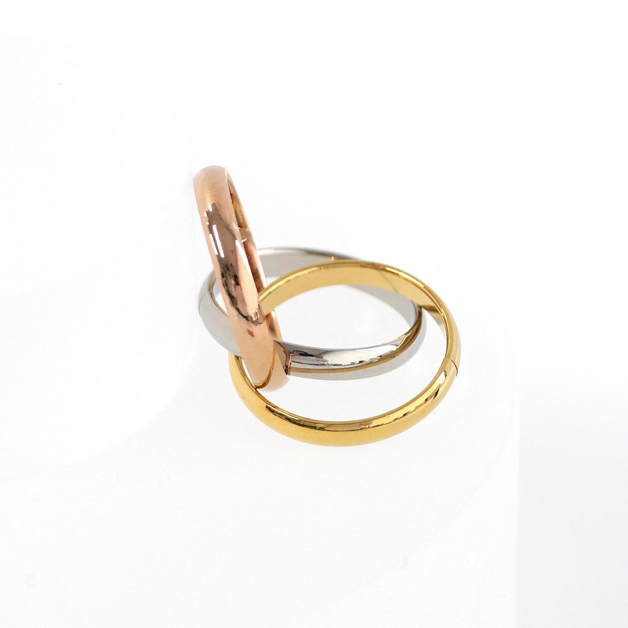ゴールド、シルバー、ピンクゴールドの3色のリングが重なり合う、サージカルステンレス製のトリニティリング。動くたびにそれぞれのカラーがきらめき、指先に上品なニュアンスを添えます。丸みを帯びた滑らかなフォルムが、重なっても軽やかな印象に。シンプルで飽きのこないデザインは、デイリーにも特別な日にもマッチします。