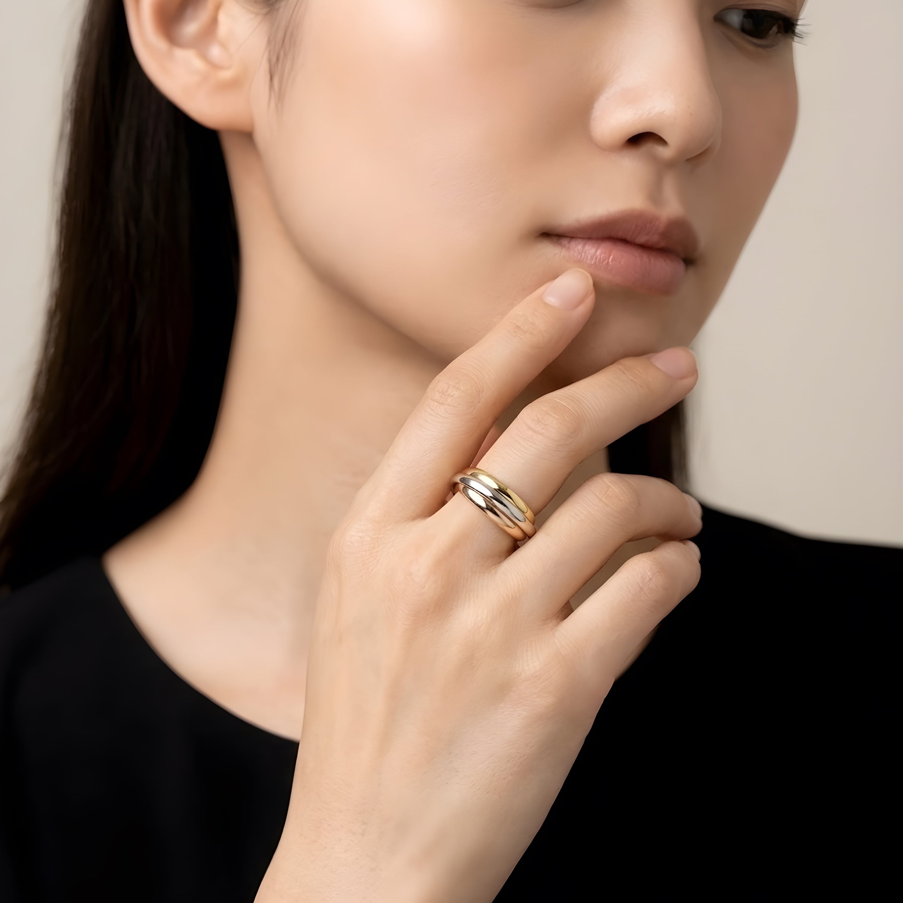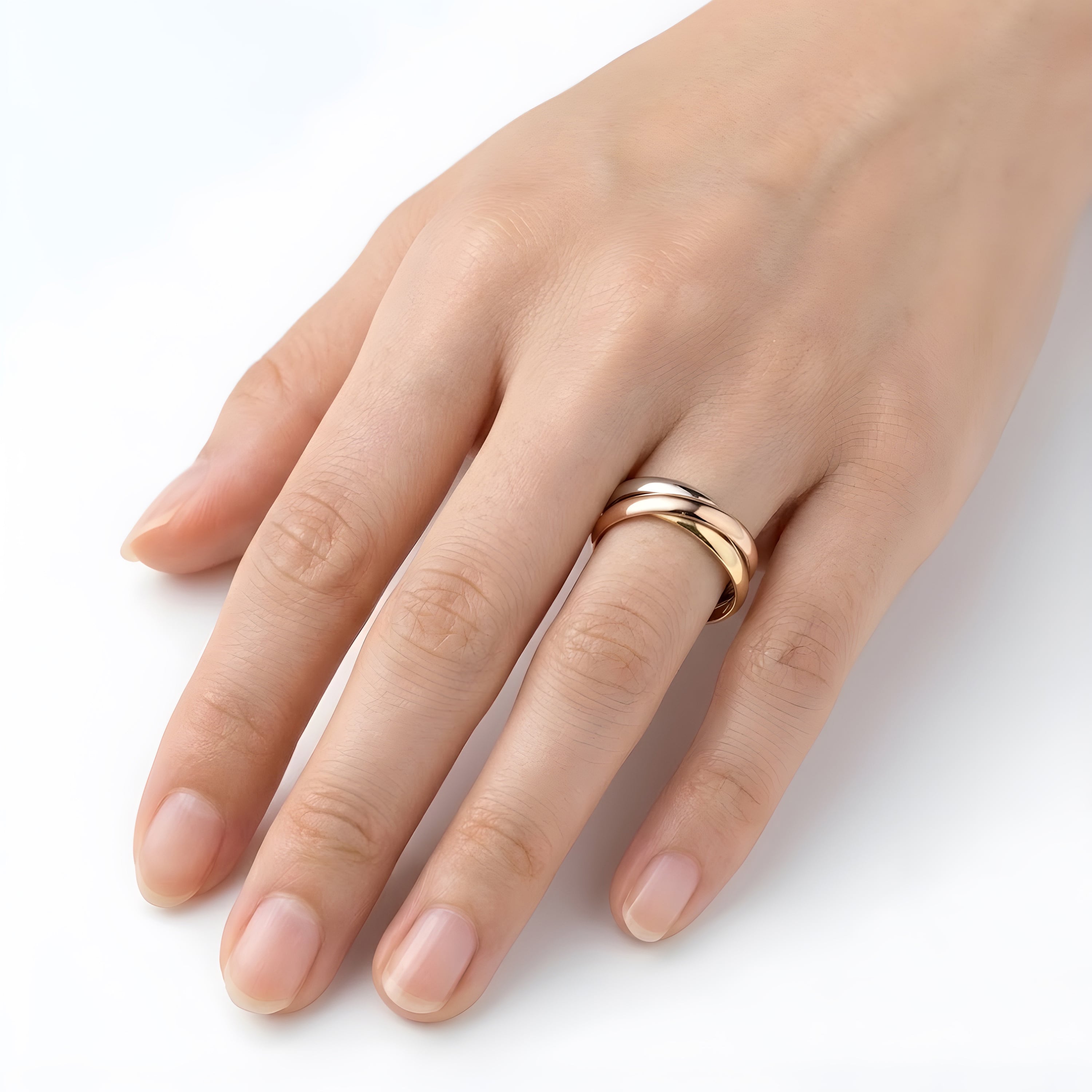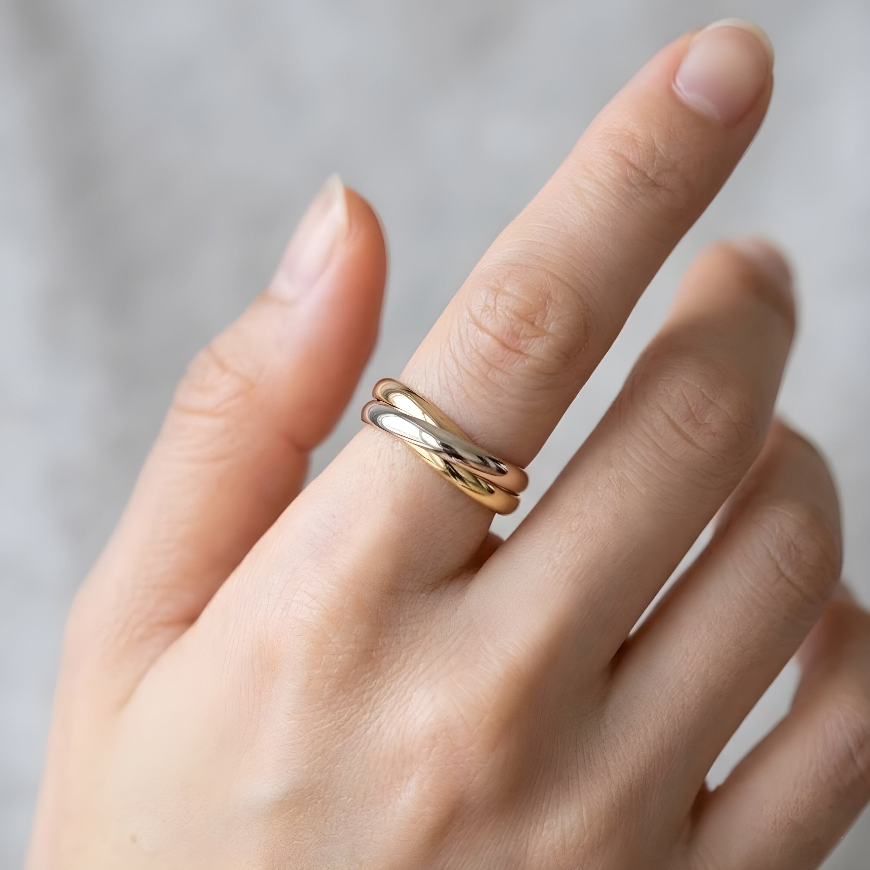 ゴールド・シルバー・ピンクゴールドの3色のリングが重なり合う、サージカルステンレス316L製のトリニティリング。