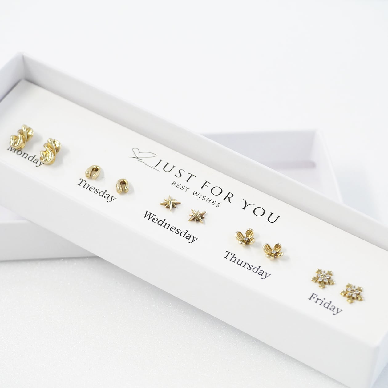 毎日を華やかに彩る、数量限定のホリデーシーズン限定ピアスセット。月曜から金曜まで、5つのデザインが楽しめる特別なコレクションです。立体ツイスト・小さなプチデザイン・星モチーフ・小花モチーフ・雪の結晶モチーフなど、どれも繊細で上品な輝きを放つデザイン。その日の気分やコーディネートに合わせて選べる、贅沢なセット内容です。