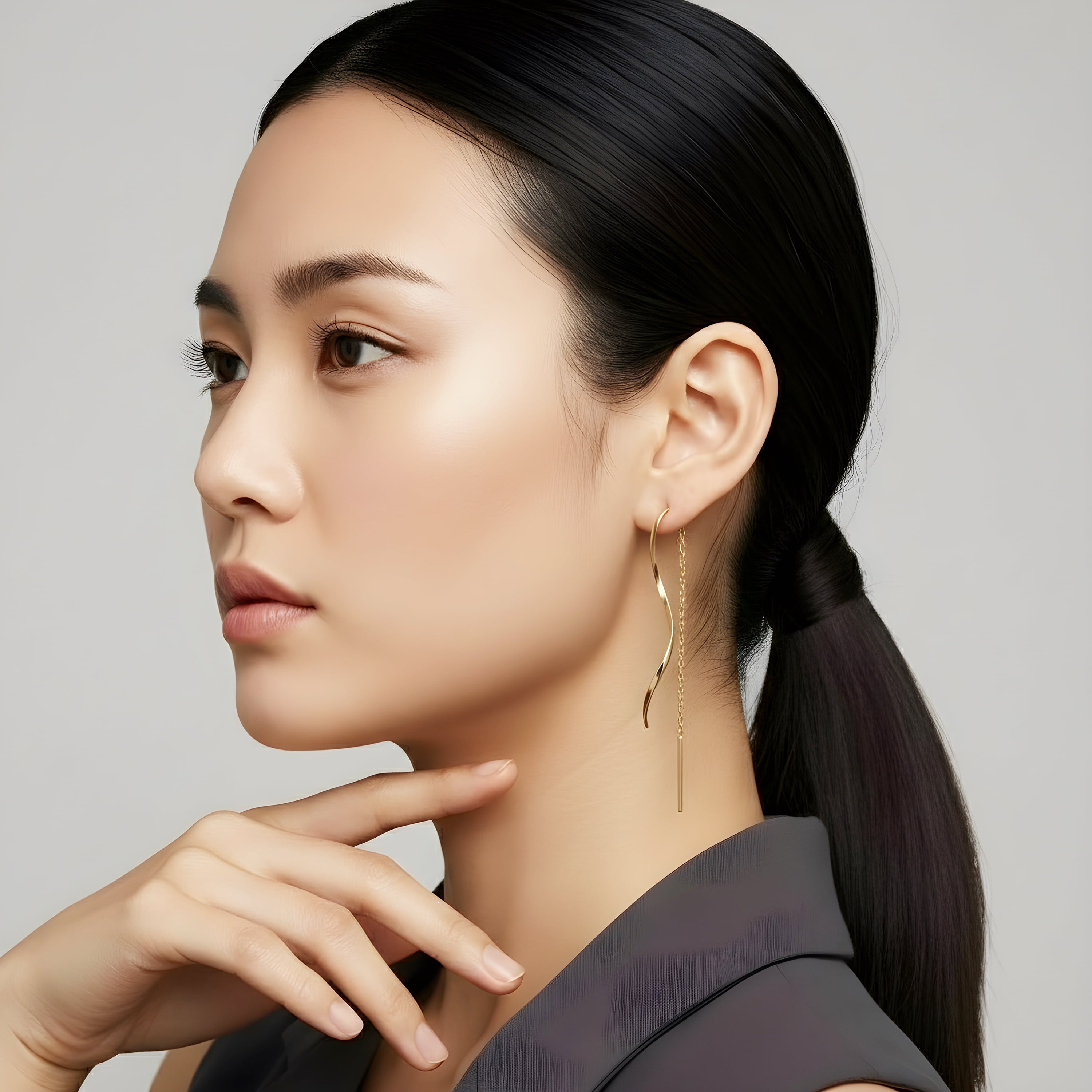 顔まわりをすっきりと見せる縦ラインシルエットで、上品さと存在感を両立。