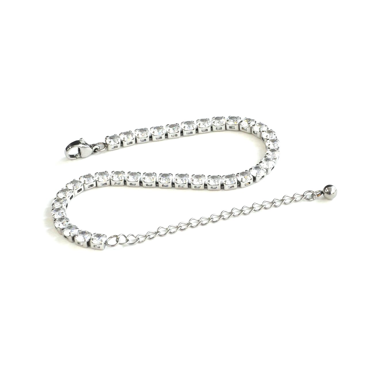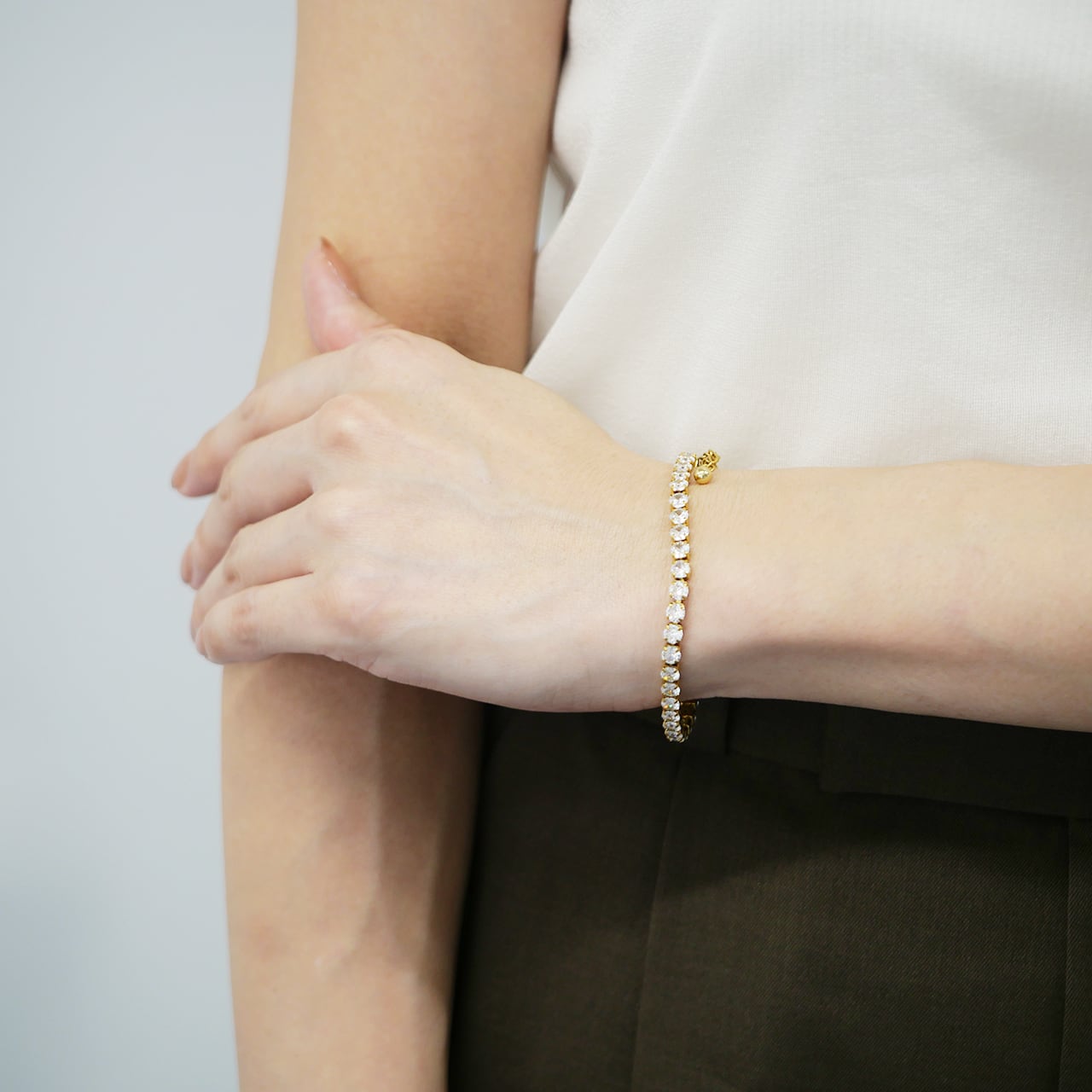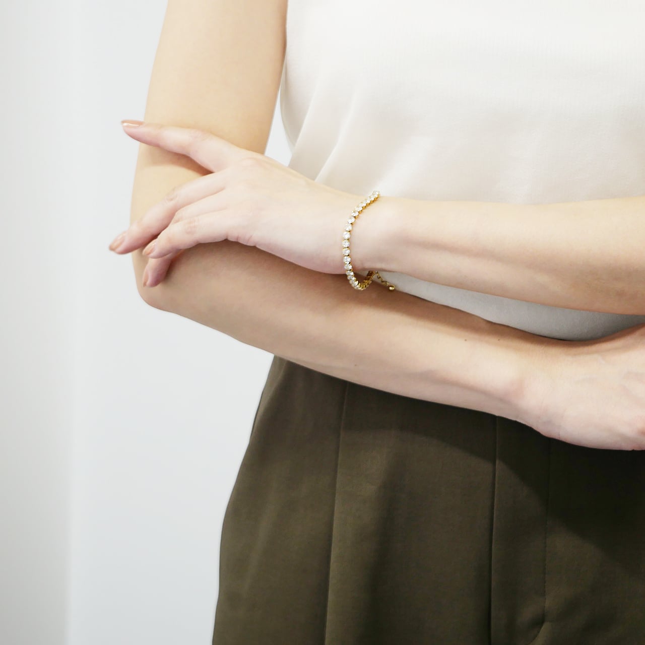 一粒一粒のキュービックジルコニアが上品に輝く、サージカルステンレス316L製のブレスレット。光を受けて手元を華やかに彩り、シンプルながらもエレガントな存在感を放ちます。水や汗に強く変色しにくいため、日常使いにもおすすめ。アジャスター先端のボールモチーフが、後ろ姿にも上品なアクセントを添えるデザイン。贈り物にも最適なアイテムです。