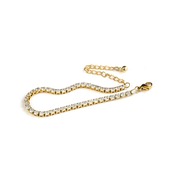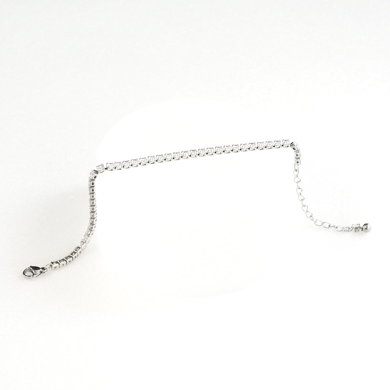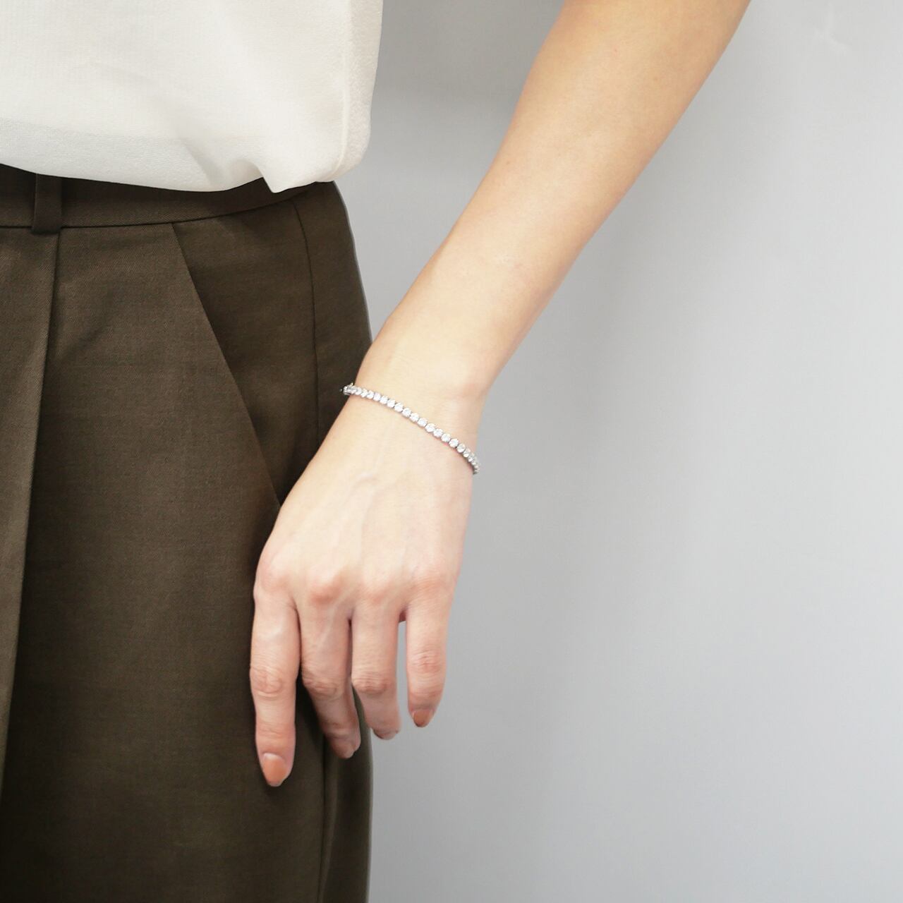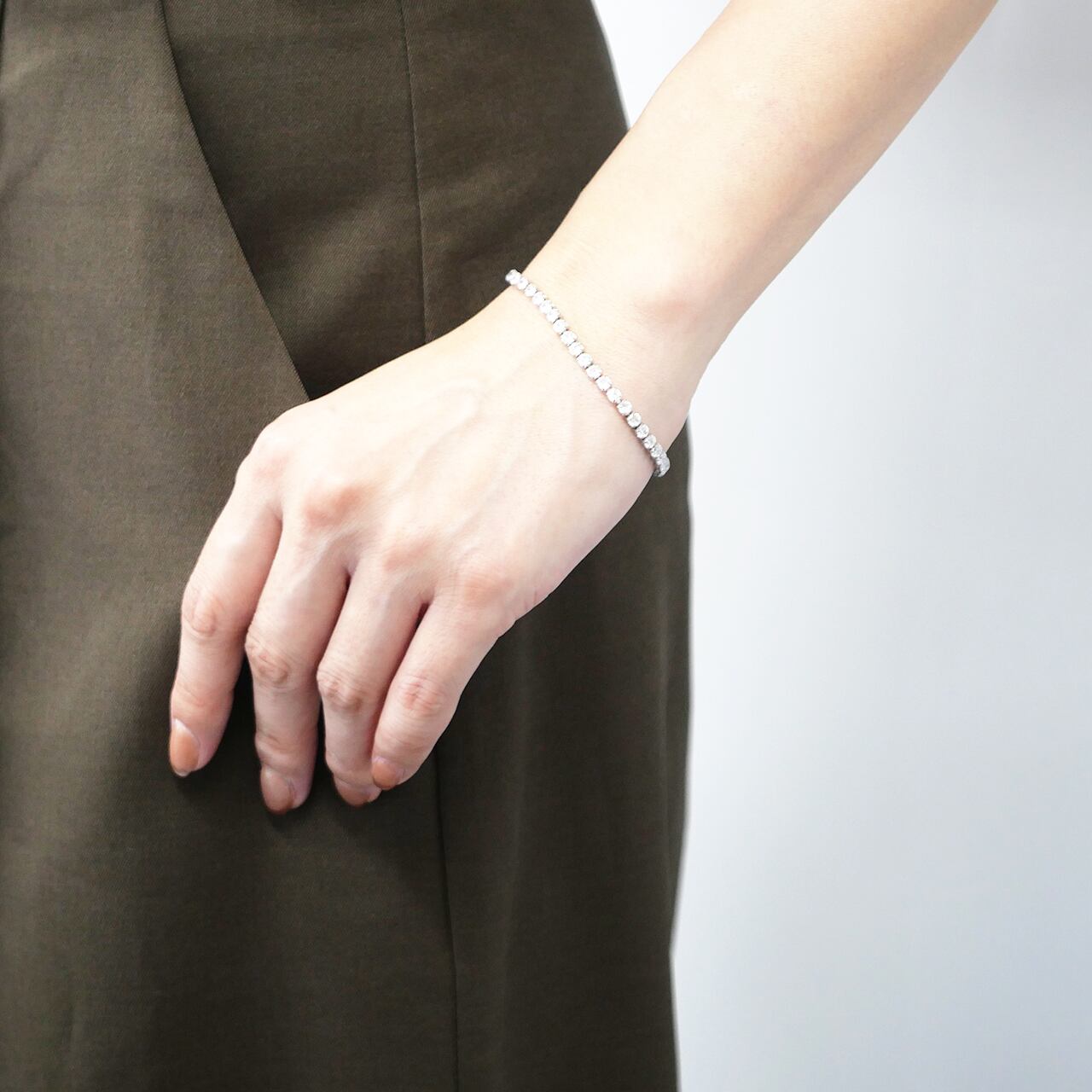 上品な輝きを放つキュービックジルコニアを贅沢に連ねた、サージカルステンレス316L製のブレスレット。一粒一粒が光を美しく反射し、手元を華やかに彩ります。幅約3mmの華奢で繊細なデザインは、さりげないきらめきで上品な印象を演出。金属アレルギーに配慮した素材を使用しており、水や汗にも強くつけっぱなしにも安心です。先端のボールモチーフ付きアジャスターが、後ろ姿にもエレガントなアクセントを添えます。18Kゴールドとステンレスシルバーの2色展開。