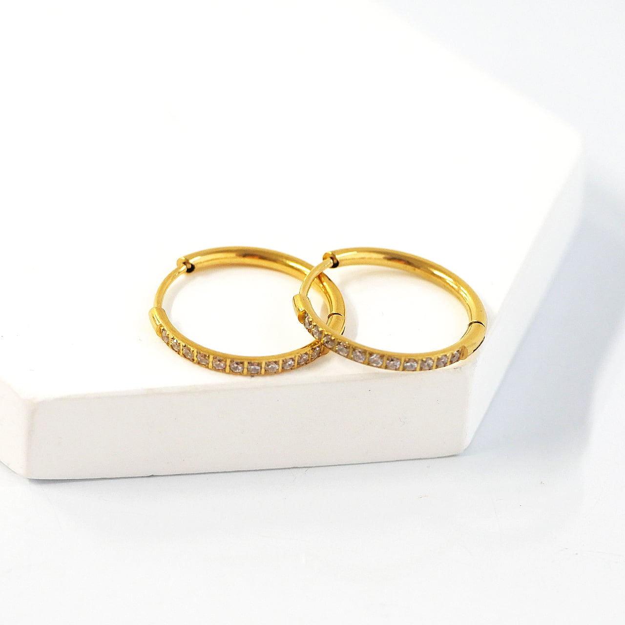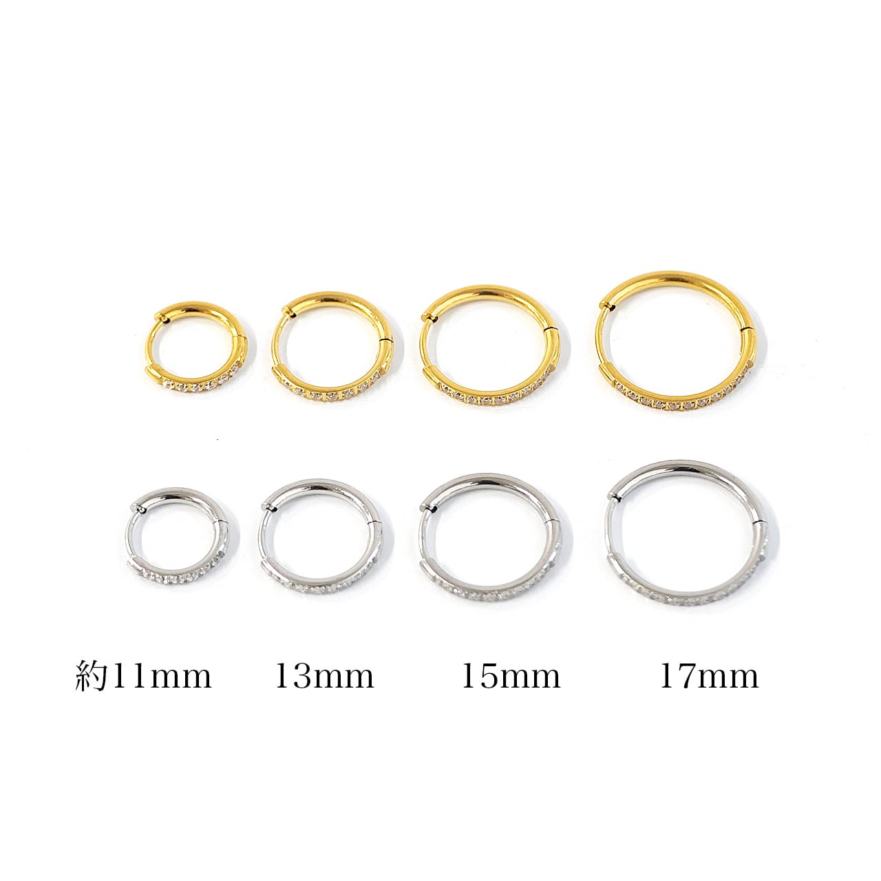 繊細にきらめくキュービックジルコニアを丁寧にセットした、サージカルステンレス316L製のフープピアス。外径約17mmの程よいボリュームがあり、耳元に上品な存在感を添えます。太さ約1.6mmのスリムなラインが軽やかで、デイリーからフォーマルまで幅広く活躍。金属アレルギーに配慮した素材を採用し、水や汗にも強く長く愛用いただけます。18Kゴールドとステンレスシルバーの2色展開。重ねづけにもおすすめのワンタッチタイプピアスです。