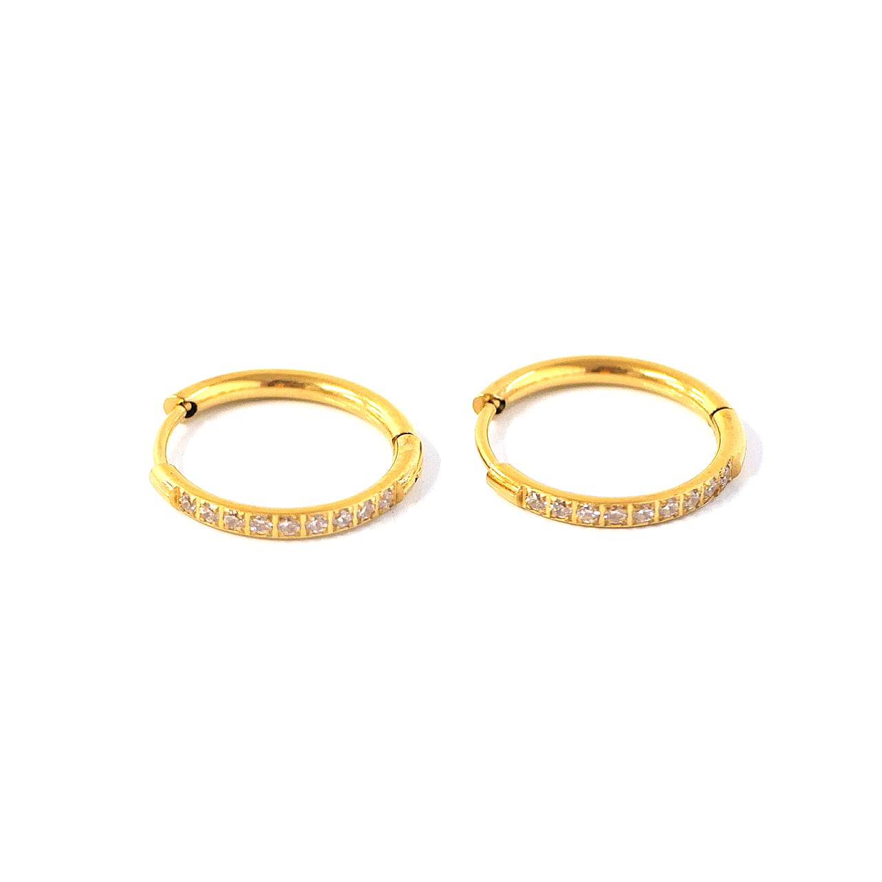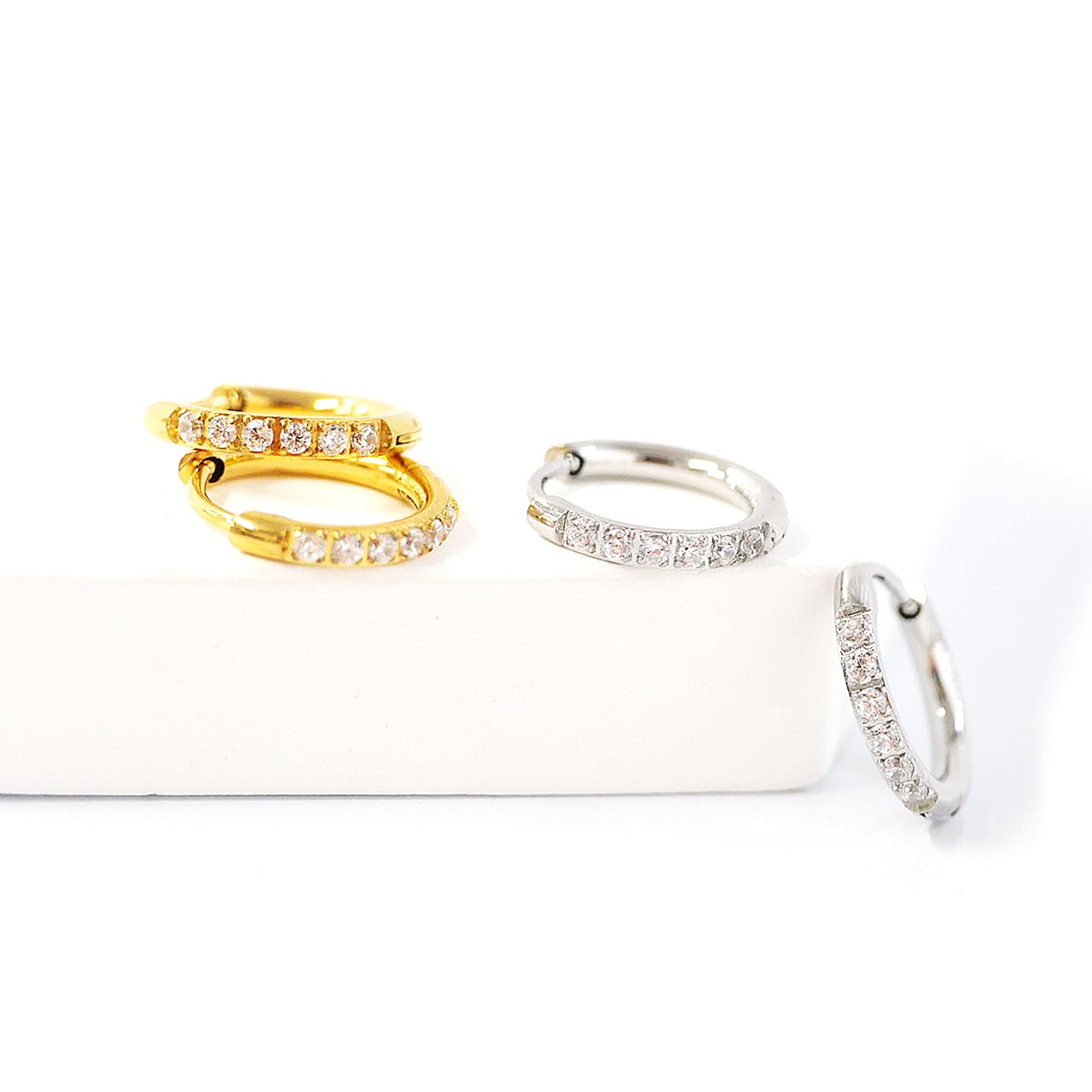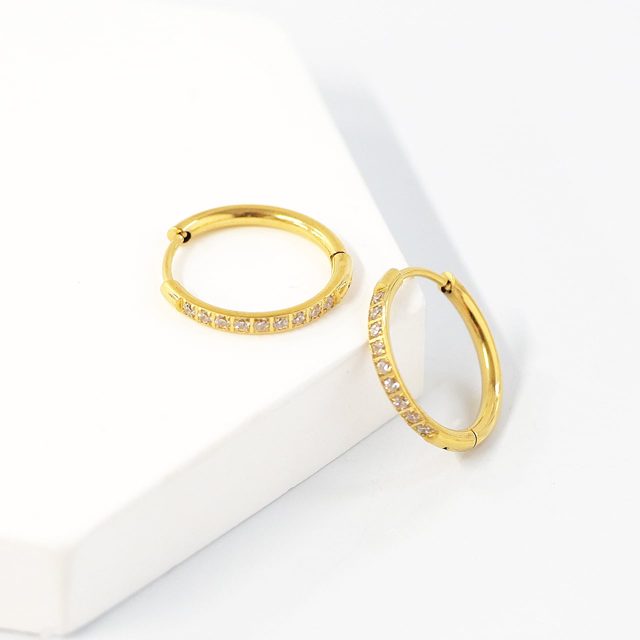 繊細に輝くキュービックジルコニアを丁寧にセットした、サージカルステンレス316L製のフープピアス。外径約15mmの程よい存在感があり、耳元を上品に引き立てます。太さ約1.6mmのスマーフォルムが洗練された印象を与え、日常使いからフォーマルまで幅広く活躍。金属アレルギーに配慮した素材を採用し、水や汗にも強くお手入れも簡単です。18Kゴールドとステンレスシルバーの2色展開で、重ねづけやギフトにもおすすめのワンタッチピアスです。