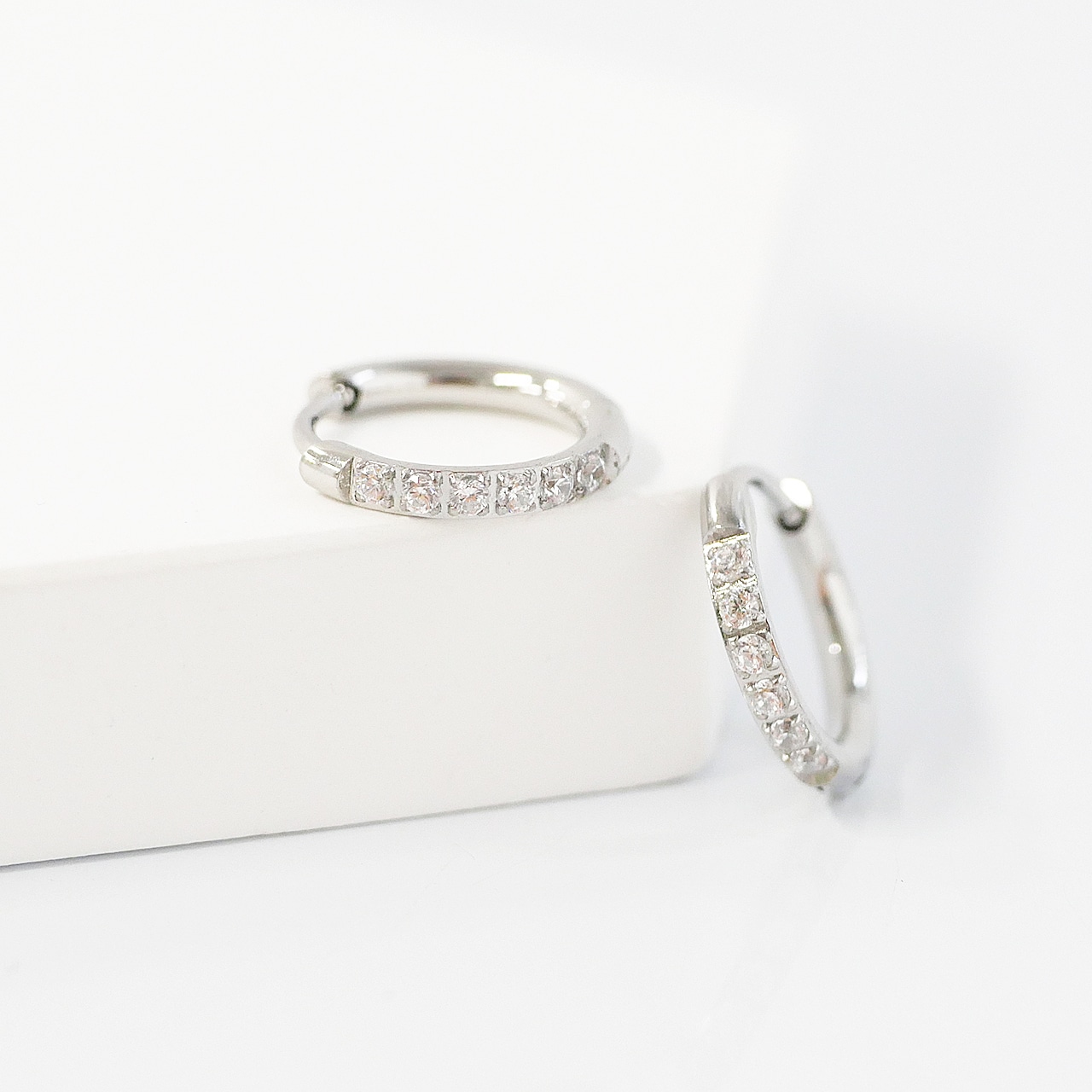 繊細な輝きを放つキュービックジルコニアをセットした、サージカルステンレス316L製のフープピアス。外径約11mmのコンパクトサイズで、耳元を上品に彩ります。太さ約1.6mmの華奢なフォルムが洗練された印象を与え、日常使いからフォーマルシーンまで幅広く活躍。金属アレルギーに配慮した素材を採用し、水や汗にも強く、長時間の着用にも安心です。18Kゴールドとステンレスシルバーの2色展開。重ねづけにもおすすめのワンタッチタイプピアスです。