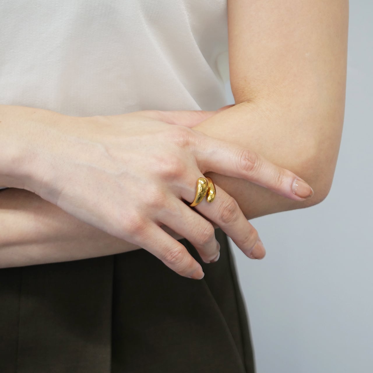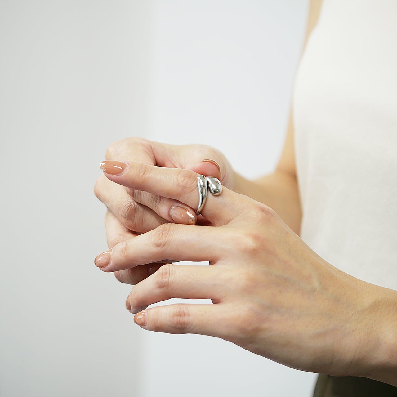 しずくのように柔らかく流れるフォルムが美しい、サージカルステンレス製のドロップリング。