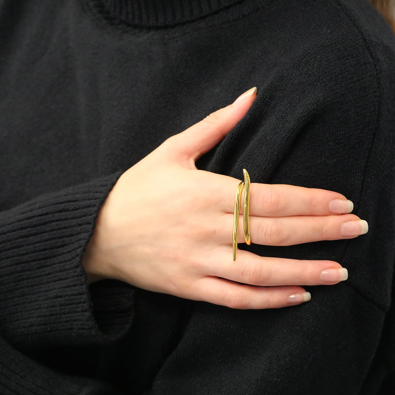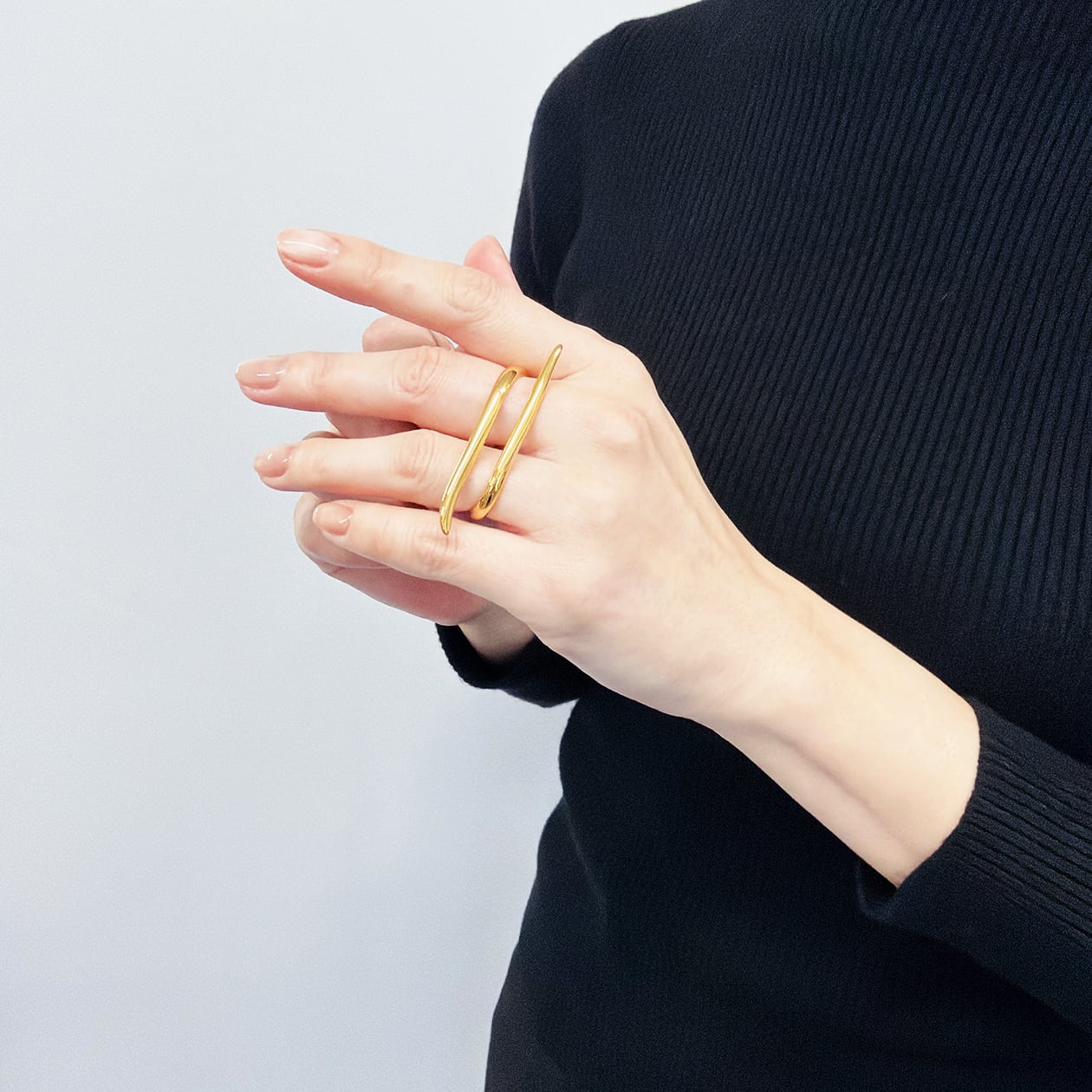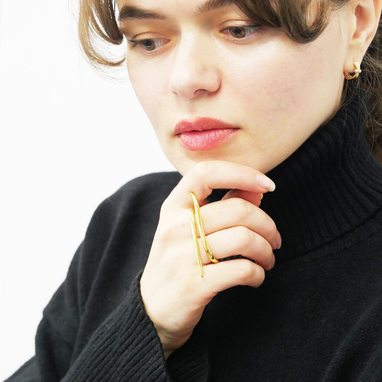2本の指にかけて着用する、立体的でアートピースのようなダブルフィンガーリング。