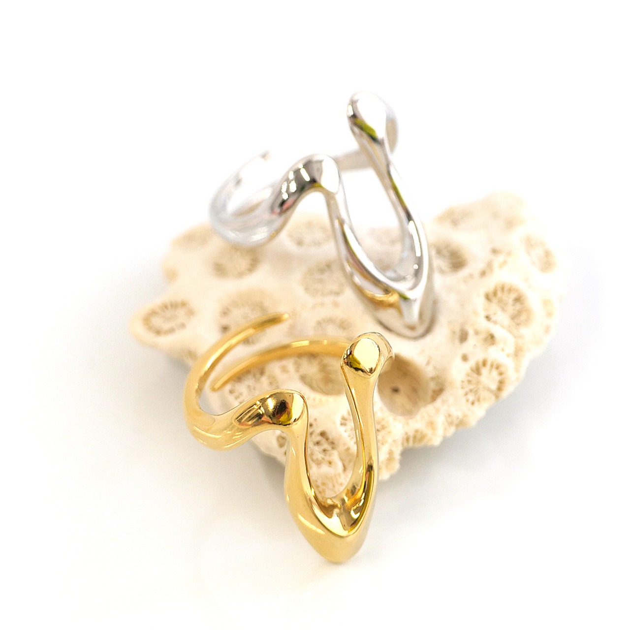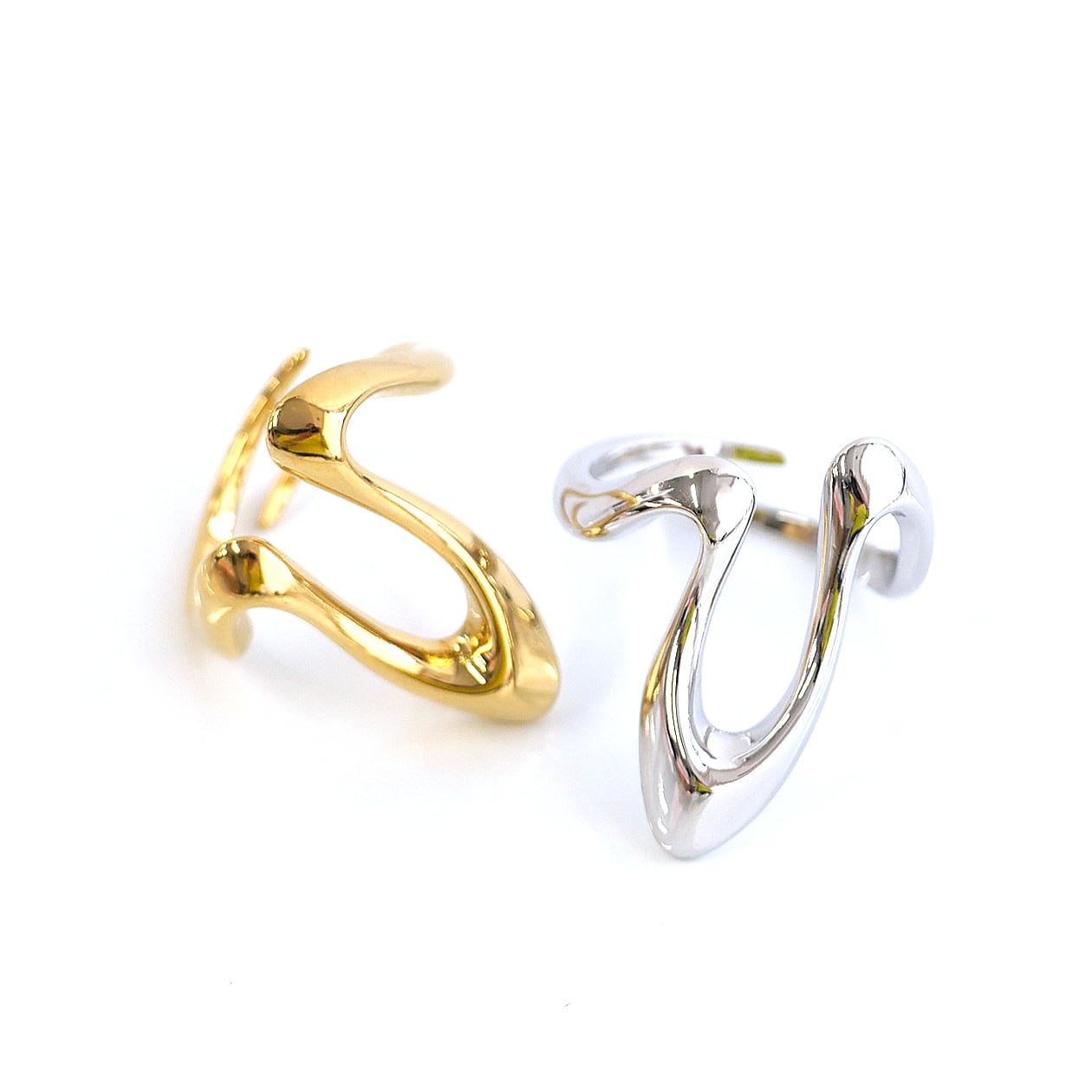 流れるラインが美しく交差する、アートのようなフォルムが魅力のオープンリング。滑らかな立体シルエットが指元をすっきりと見せ、シンプルなスタイルにひとさじの個性を添えます。角度によって表情が変わるモダンなデザインは、デイリーにも特別な日にも活躍。ゴールド・シルバーの2色からお選びいただけます。ひとつ着けるだけで手元をスタイリッシュに仕上げてくれる、上品で存在感のあるアイテムです。