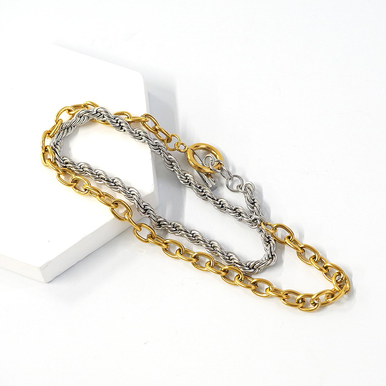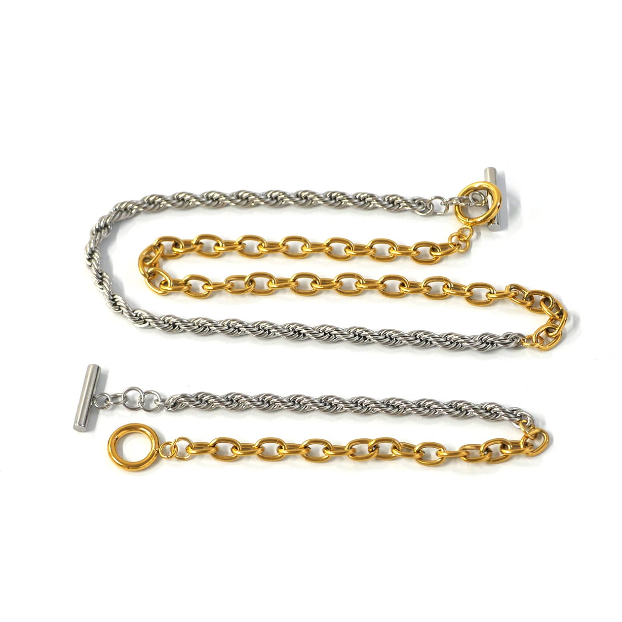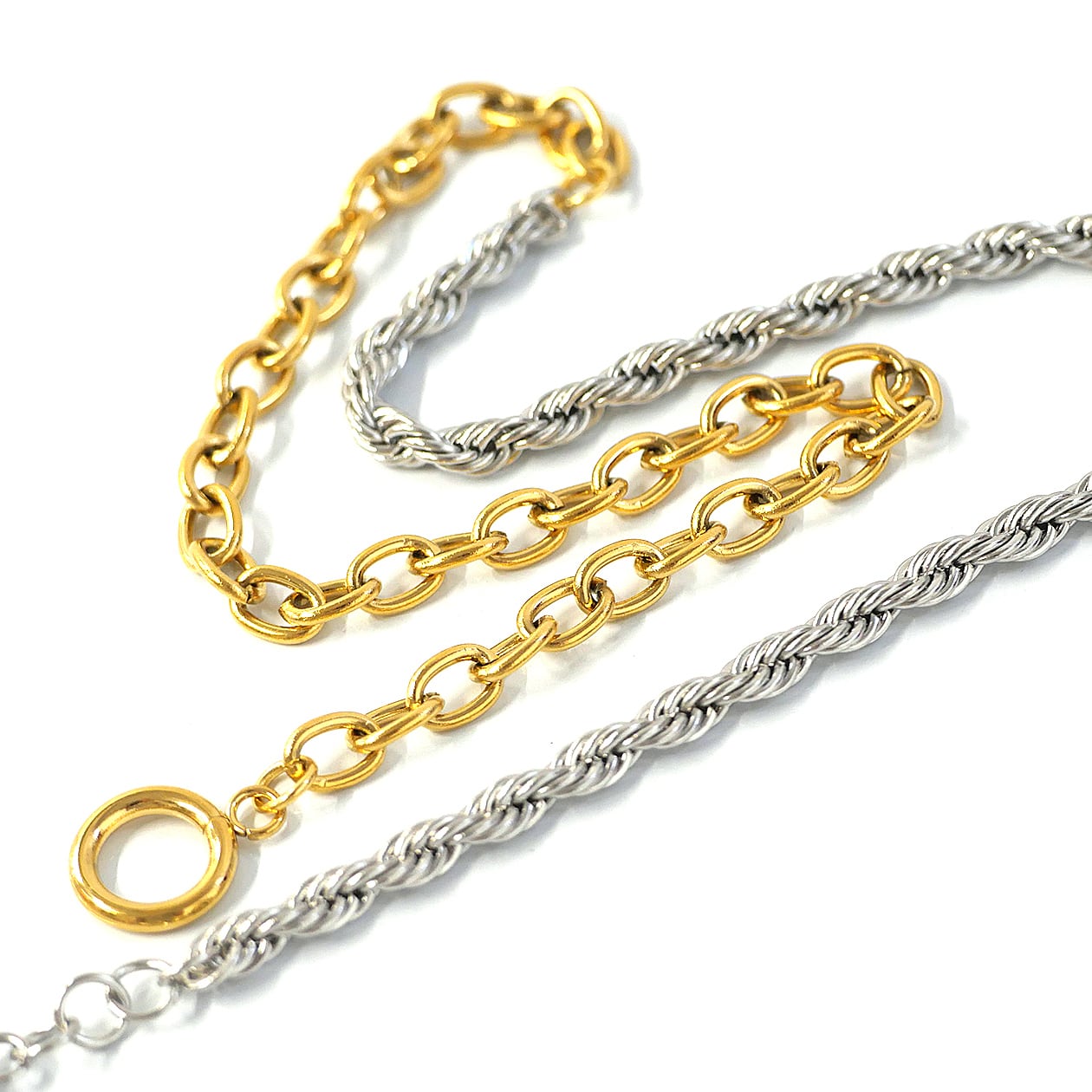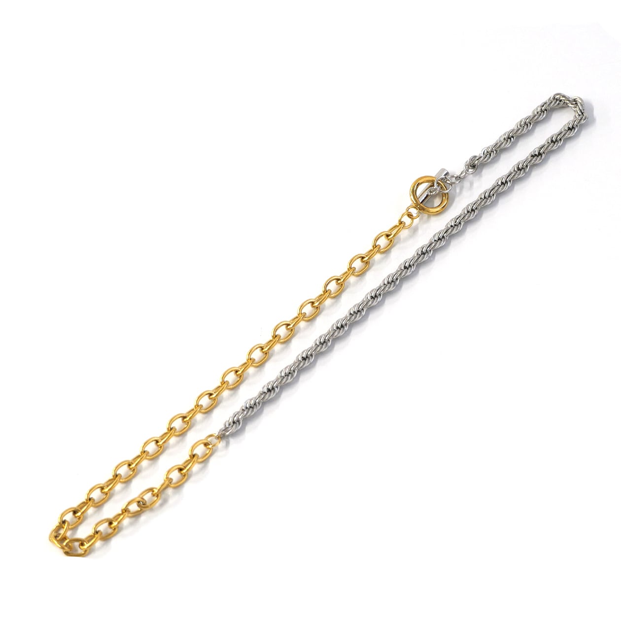 ゴールドのボリュームチェーンと、シルバーのロープチェーンを組み合わせたデザインが、上品さと存在感を併せ持つスタイルを演出します。