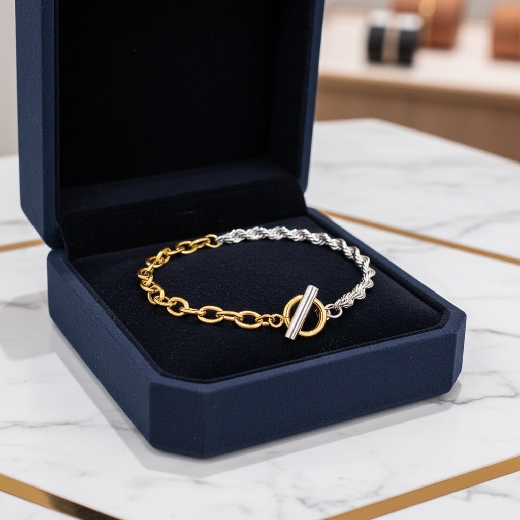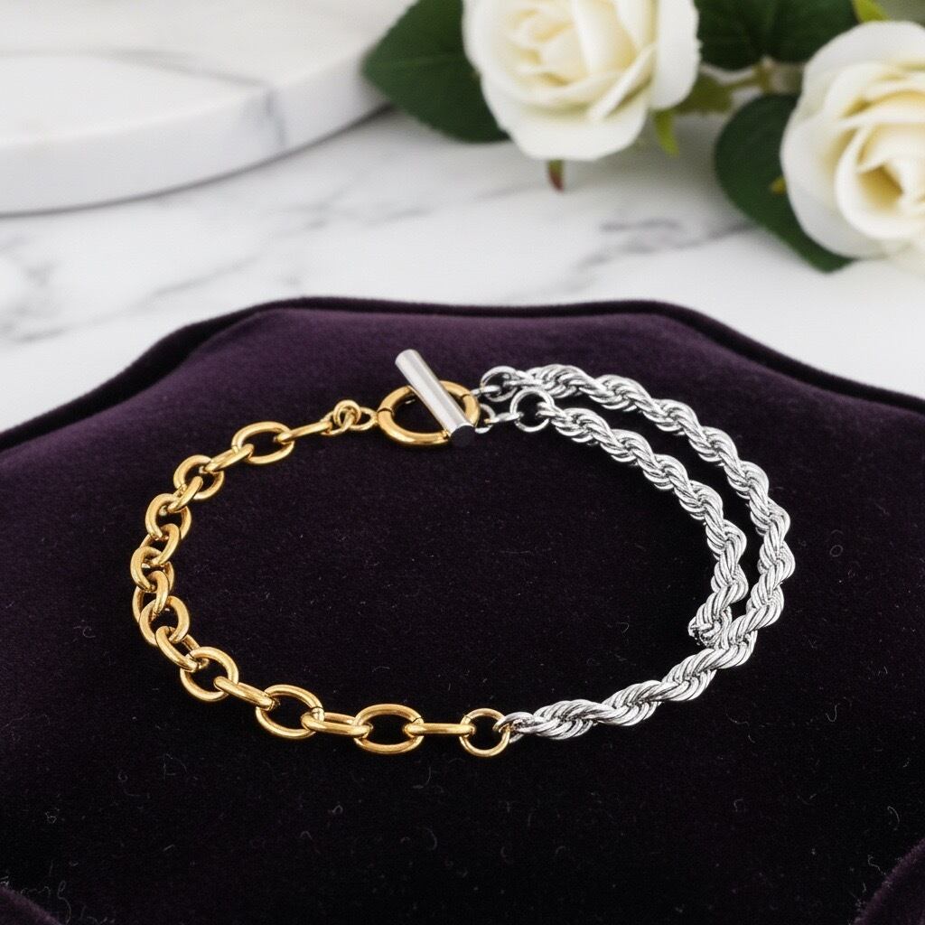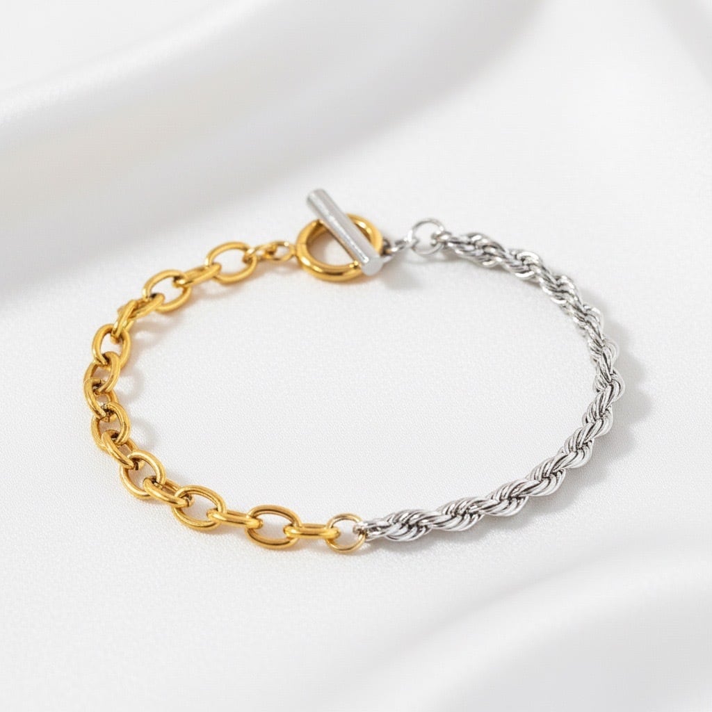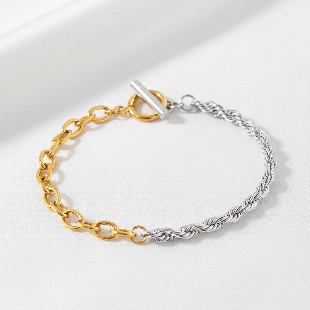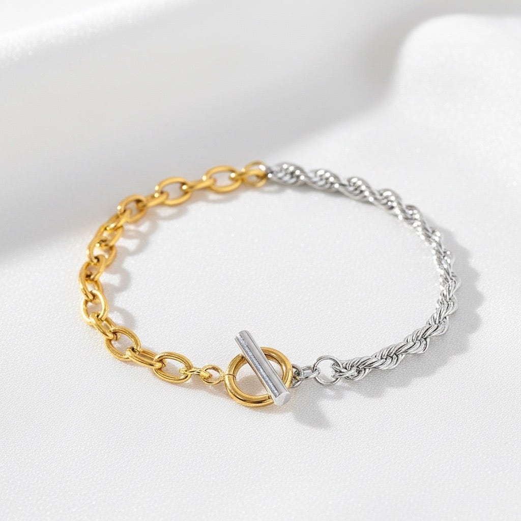 異なる表情のチェーンを組み合わせた、モードで立体感のあるツートーンデザインのブレスレット。片側には繊細なツイストチェーン、もう片側には存在感のあるゴールドチェーンを配置し、手元にコントラストのある表情を与えます。異なる質感がバランスよく調和し、シンプルな装いにも自然なアクセントを添えてくれるデザイン。Tバータイプの留め具が程よいポイントになり、着け外しがしやすいのも魅力です。