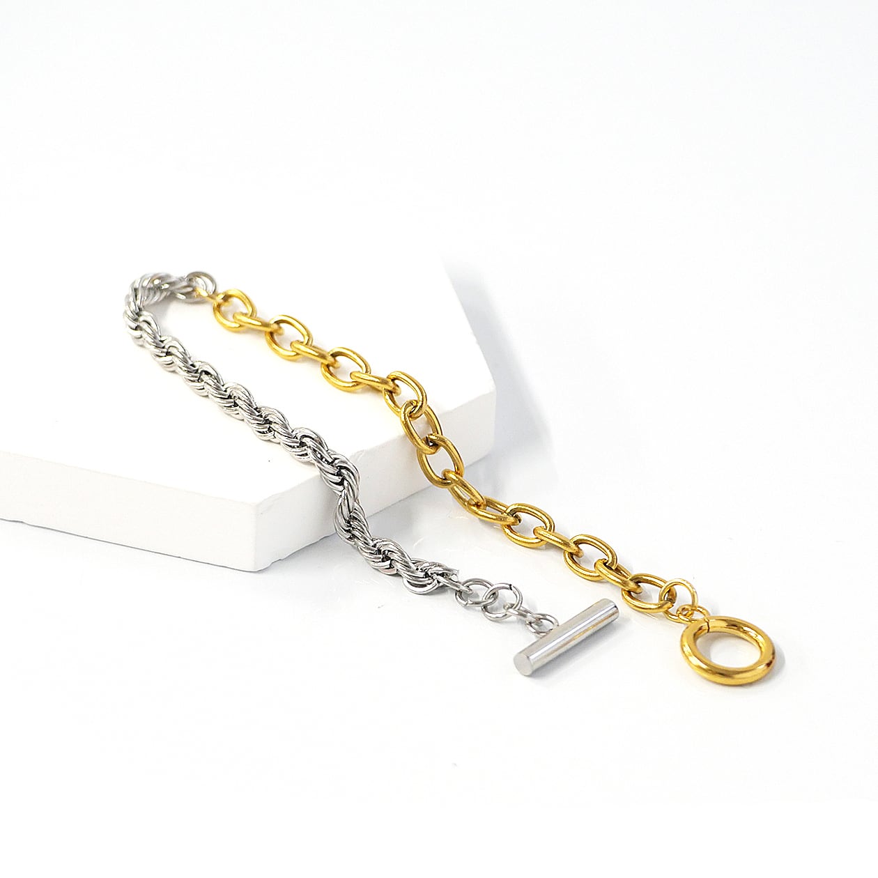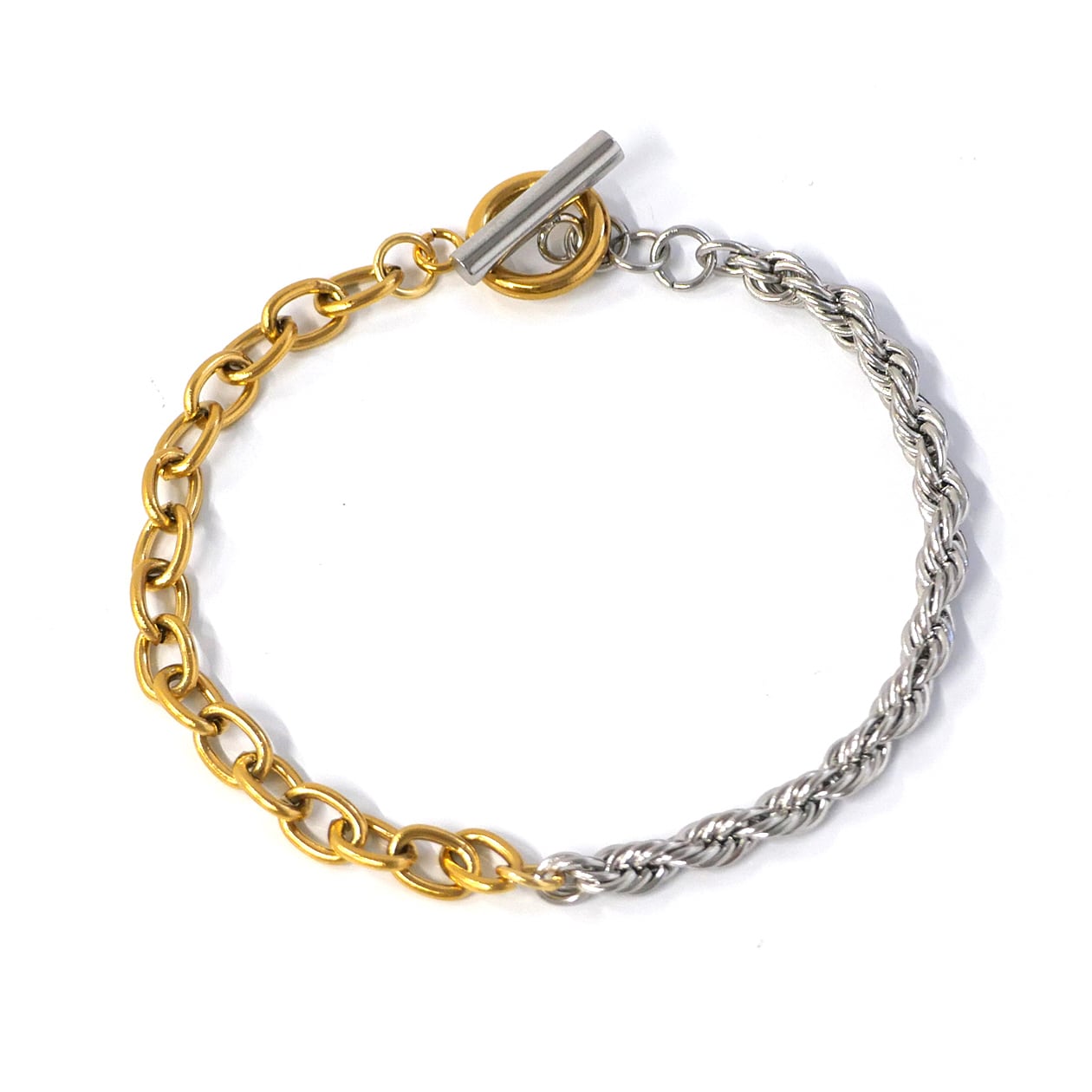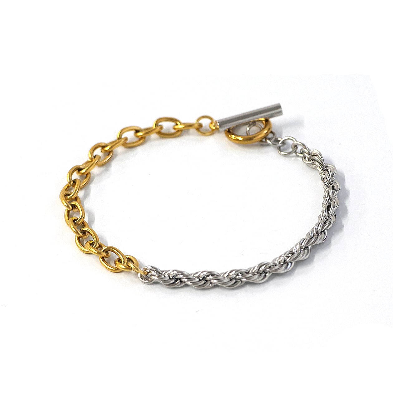 異素材のチェーンを組み合わせた、モードで立体感のあるツートーンブレスレット。