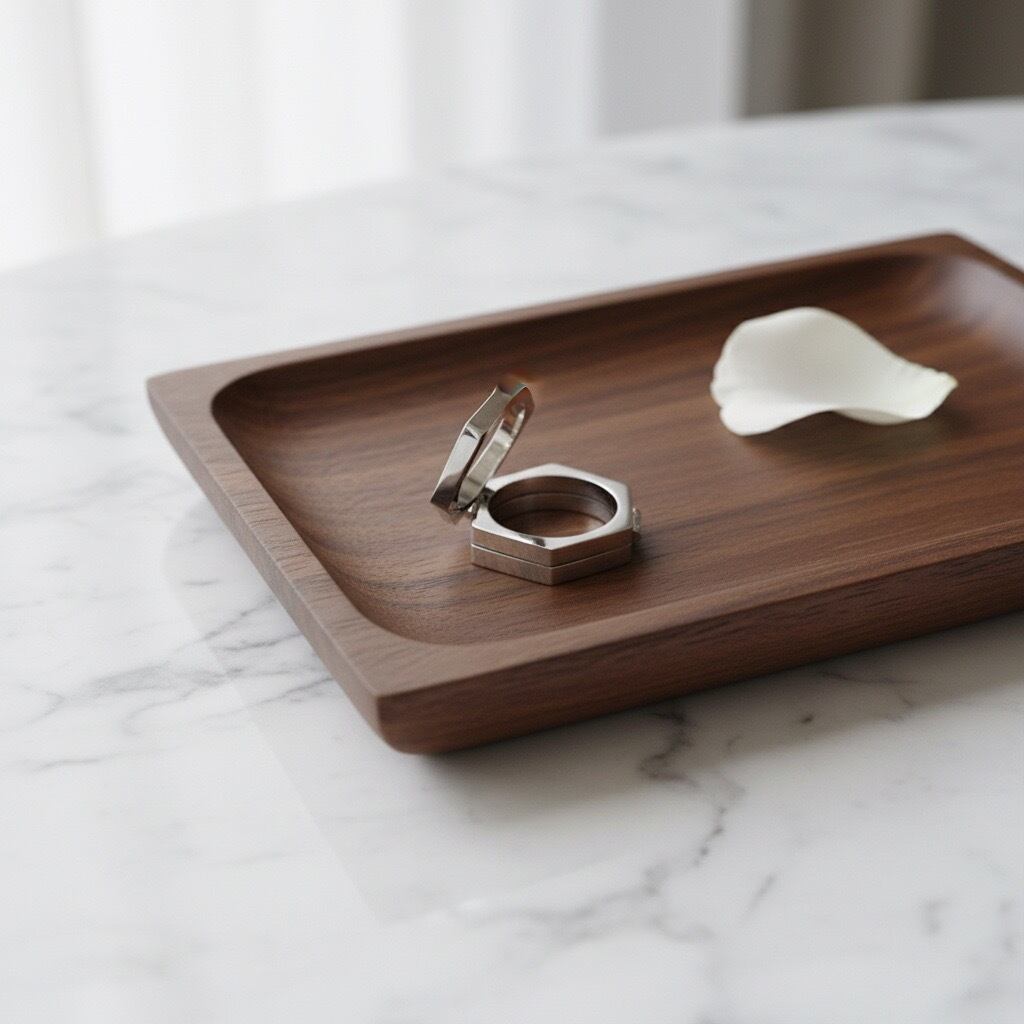 1本で存在感のあるフォルムながら、重ね付けのような奥行きを感じさせるアートピースのような仕上がり。滑らかな鏡面仕上げが指先に洗練された印象を添えます。