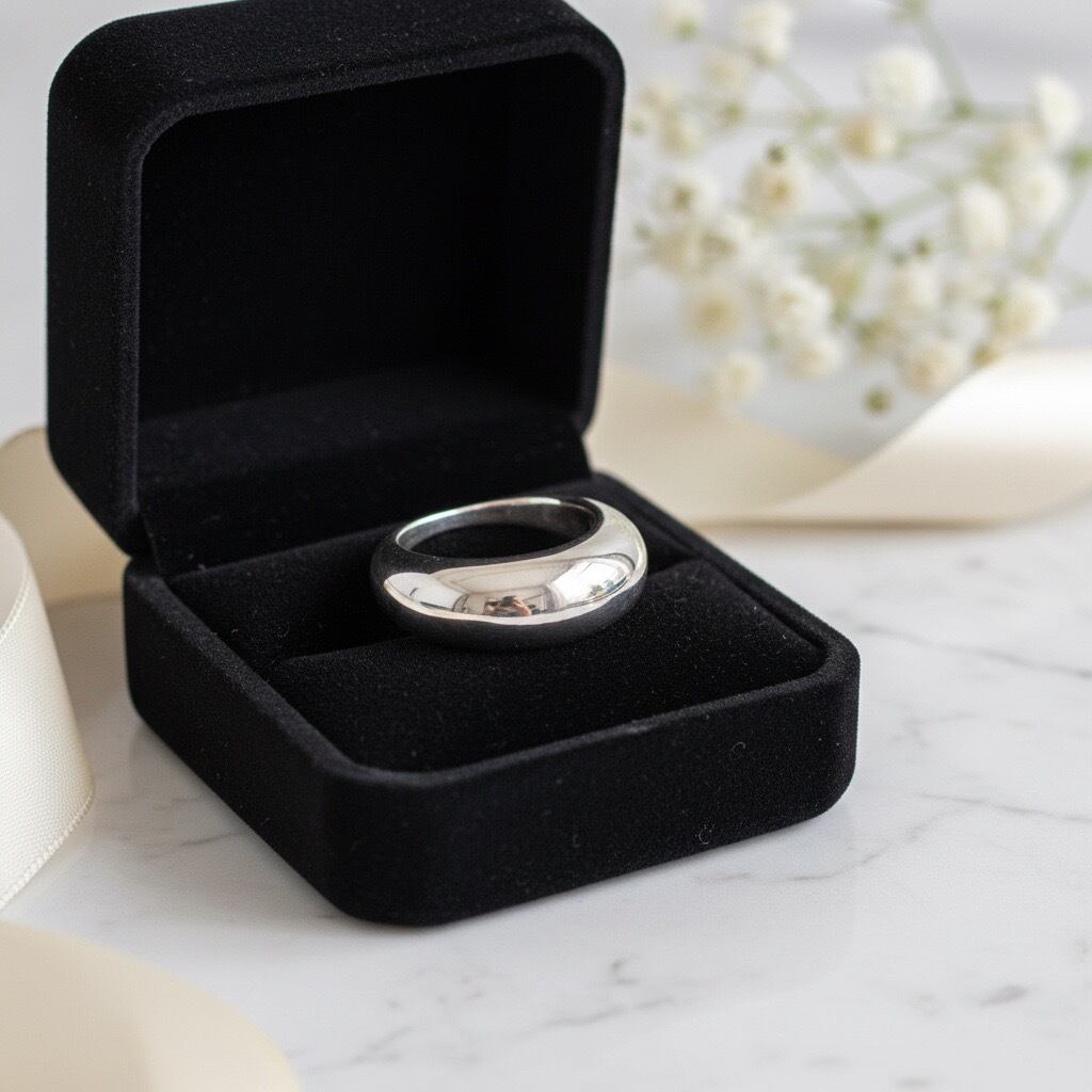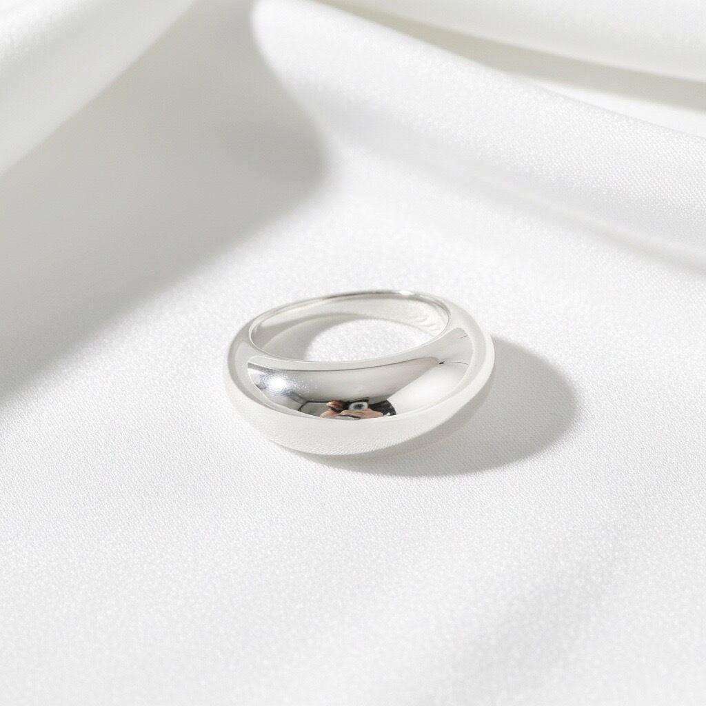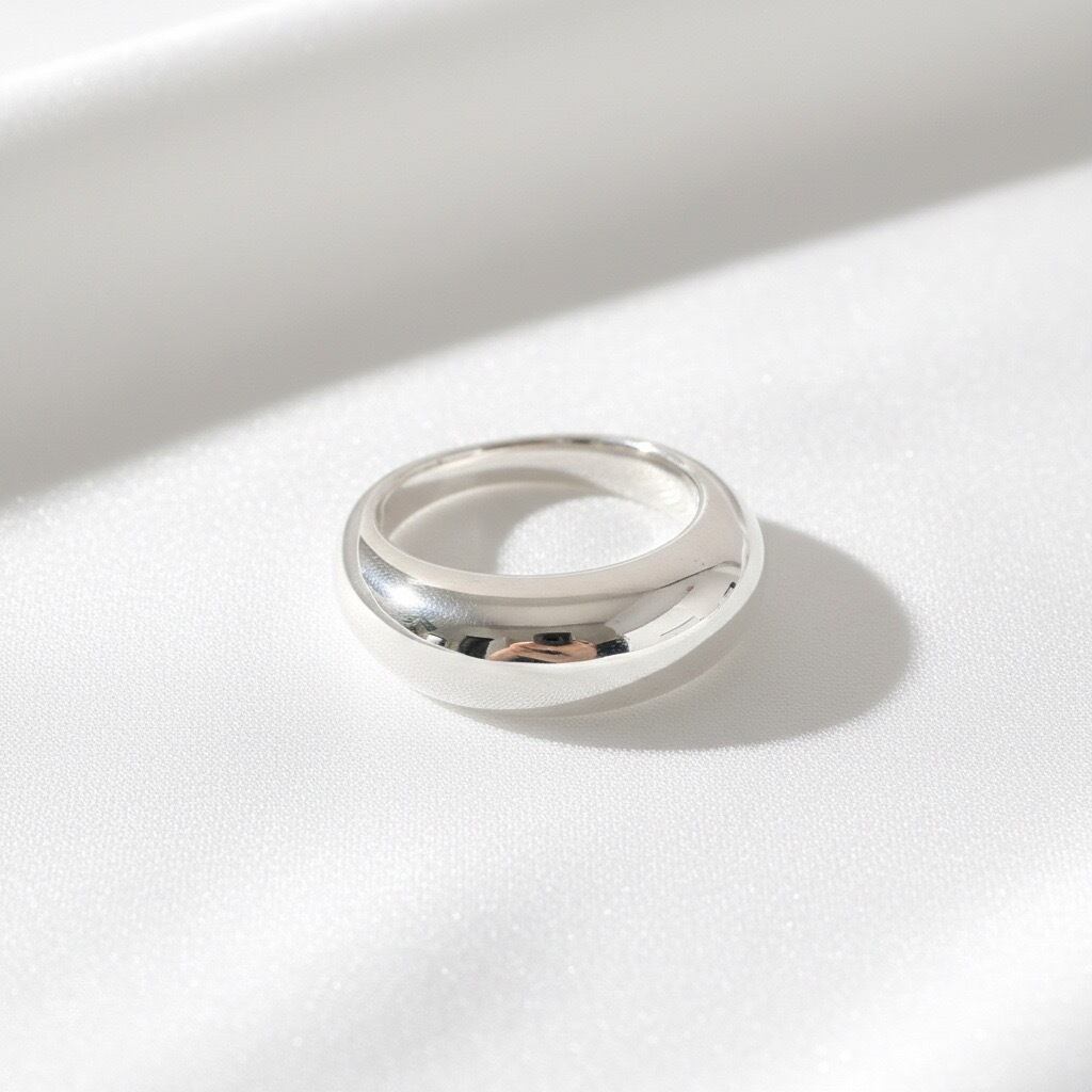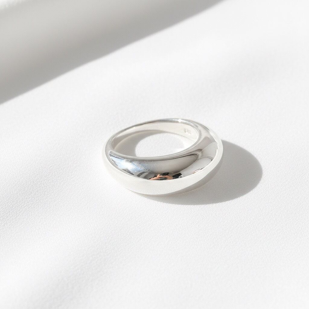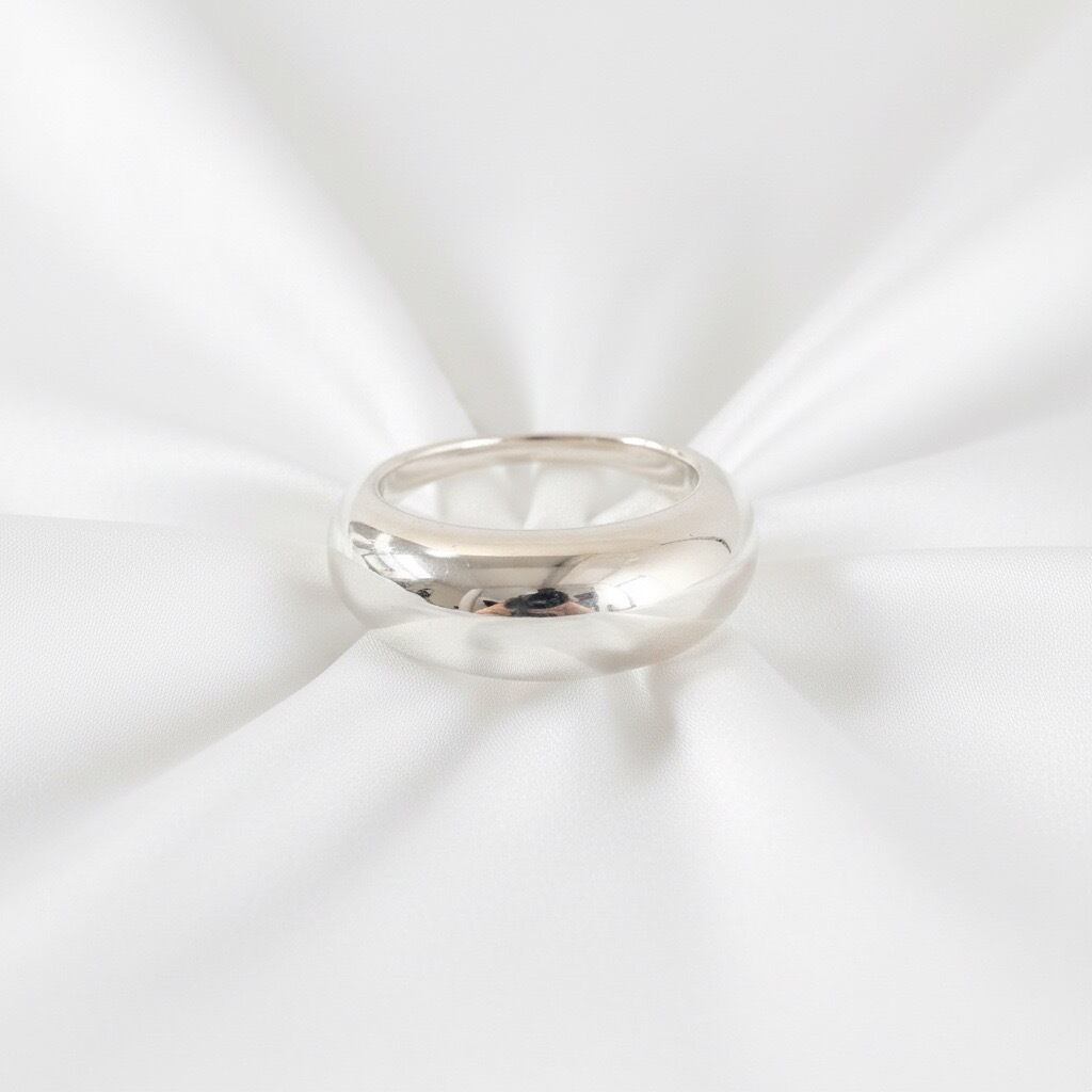 丸みのあるフォルムが指元に上品な存在感を添えるボリュームドームリング。なめらかに膨らんだシルエットが光を柔らかく反射し、シンプルでありながら印象的な手元を演出します。単体で主役として楽しめるほか、細身リングとの重ね付けでメリハリのあるスタイリングも叶います。ミニマルでモダンなデザインは性別を問わず使いやすく、長く愛用できるタフなシルバーリングをお探しの方におすすめの一品です。