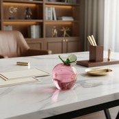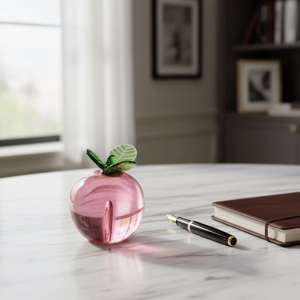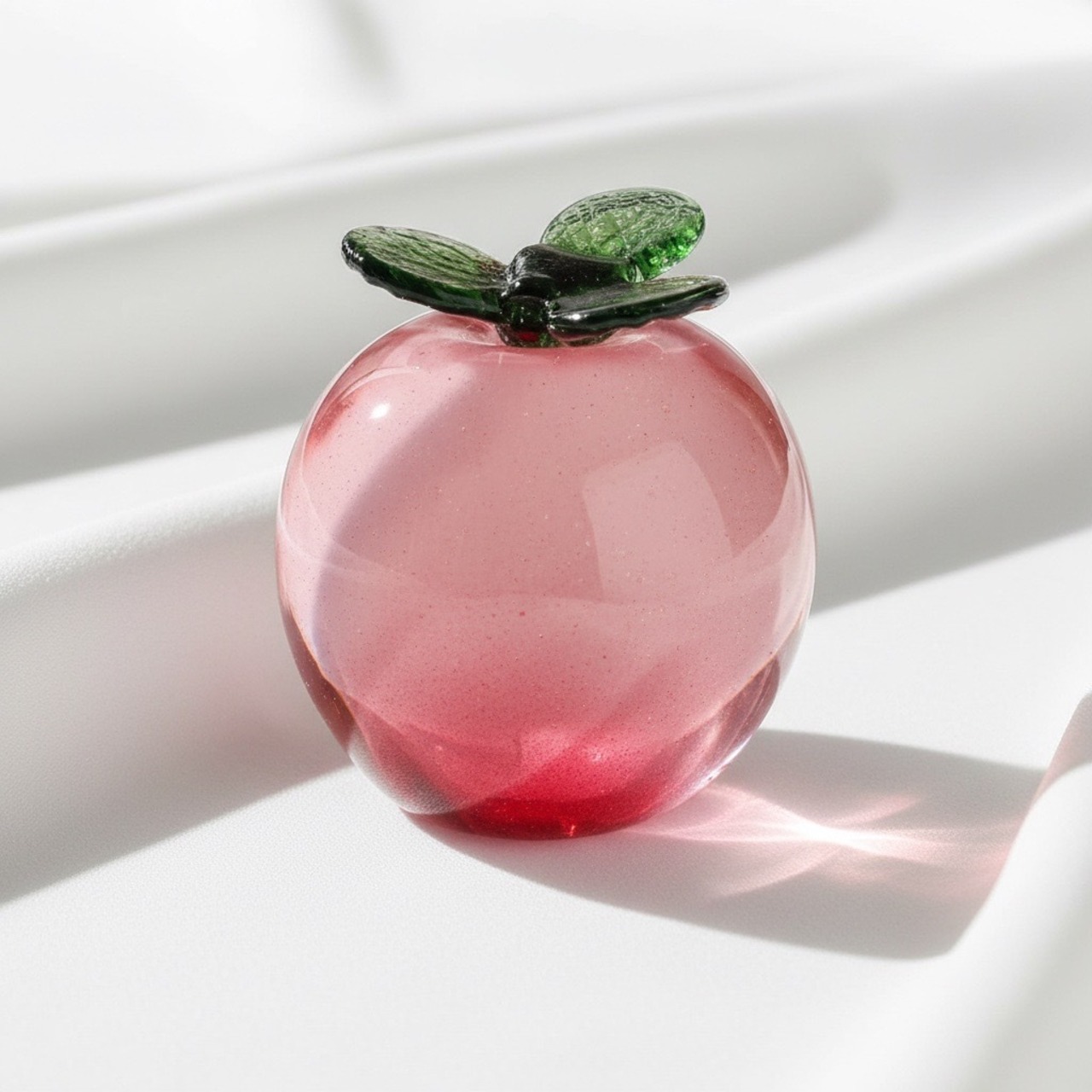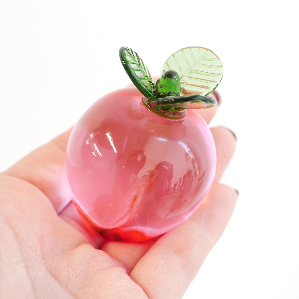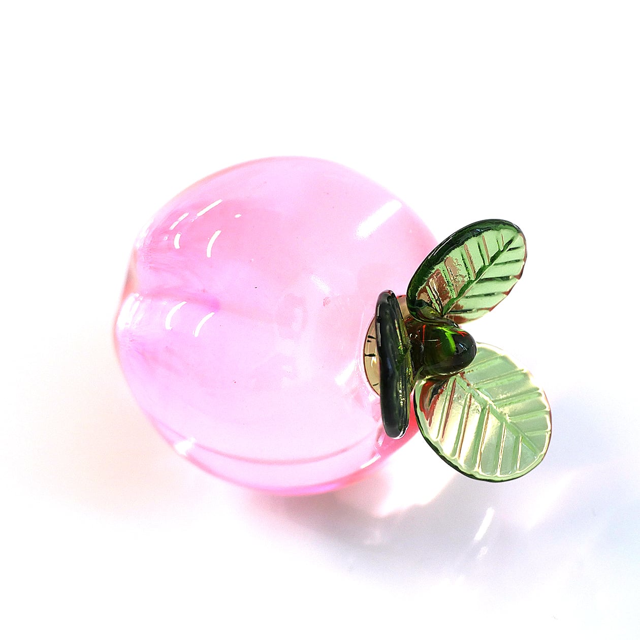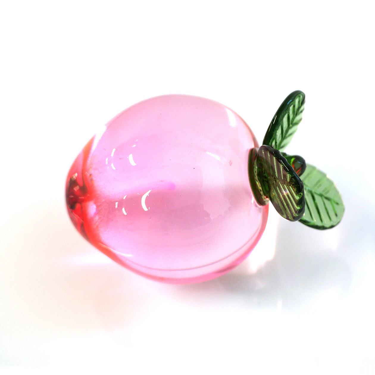 やわらかなピンクが可愛らしい、桃モチーフのガラスオブジェ。光を透かす透明感が美しく、眺める角度によって色の濃淡がゆらめき、まるで果実の瑞々しさを閉じ込めたような仕上がりです。手のひらサイズで飾りやすく、玄関やデスク、リビングのアクセントとして季節を問わず活躍します。可愛いフルーツ雑貨をお探しの方や、ガラスインテリアが好きな方におすすめです。
