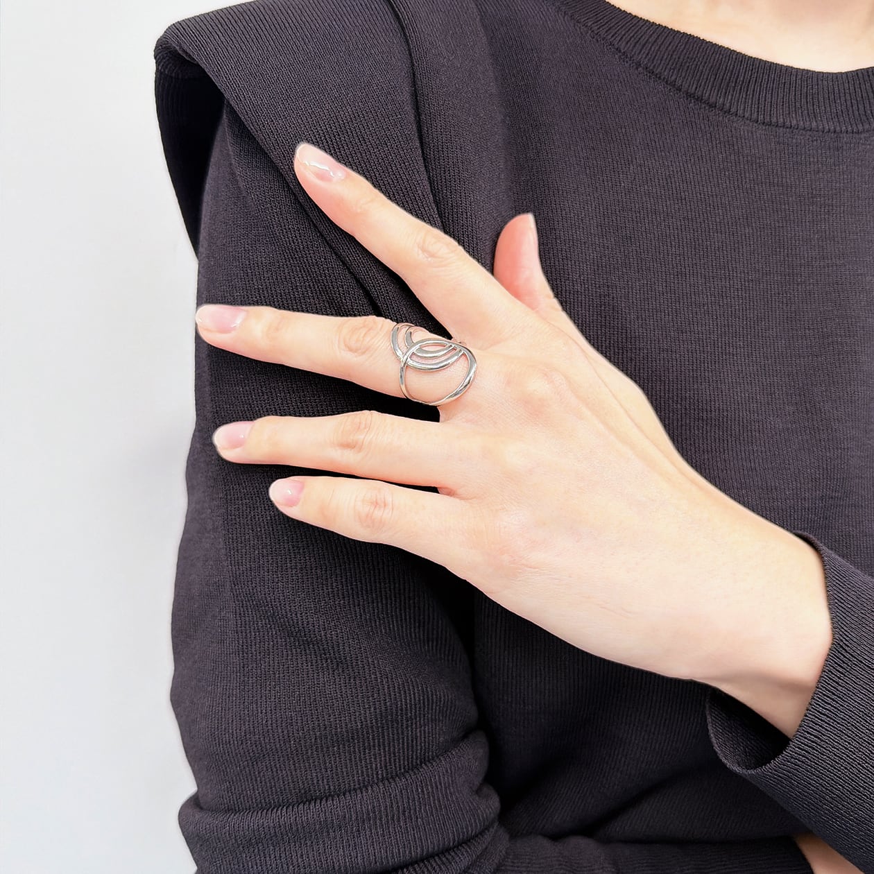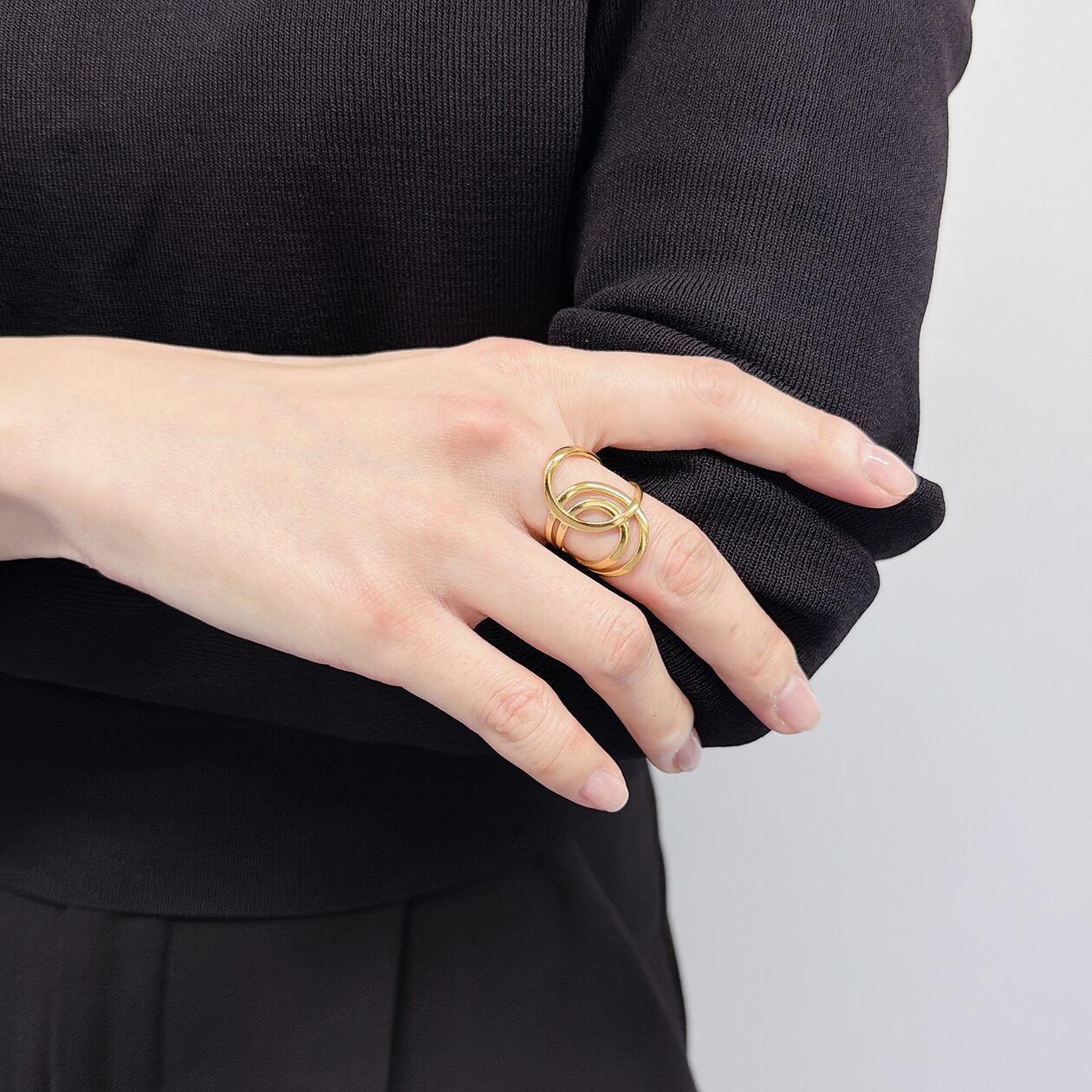 空間を描くように重なり合う3本のループが印象的な、立体フォルムのオープンリング。流れるようなカーブが指元に動きを生み、シンプルなコーディネートにもモードなアクセントを添えます。軽やかで抜け感のあるデザインは、ボリュームがありながらも繊細な印象を与え、手元を美しく見せてくれます。ゴールド・シルバーの2色展開で、雰囲気に合わせてお選びいただけます。重ね付けにも相性が良く、デイリーから特別な日まで幅広く活躍するアイテムです。
