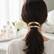 滑らかなカーブラインが上品に輝く、ミニマルデザインのヘアゴム。結んだ髪に添えるだけでスタイルを洗練させ、大人のシンプルコーデに自然なアクセントを与えてくれます。艶のあるステンレスチャームは傷や変色に強く、美しさが長く続くのも魅力。ゴールドとシルバーの2色展開で、デイリーからオフィスシーンまで幅広く活躍します。手首に着けても映えるほど程よい存在感があり、アクセサリー感覚で楽しめる一品です。