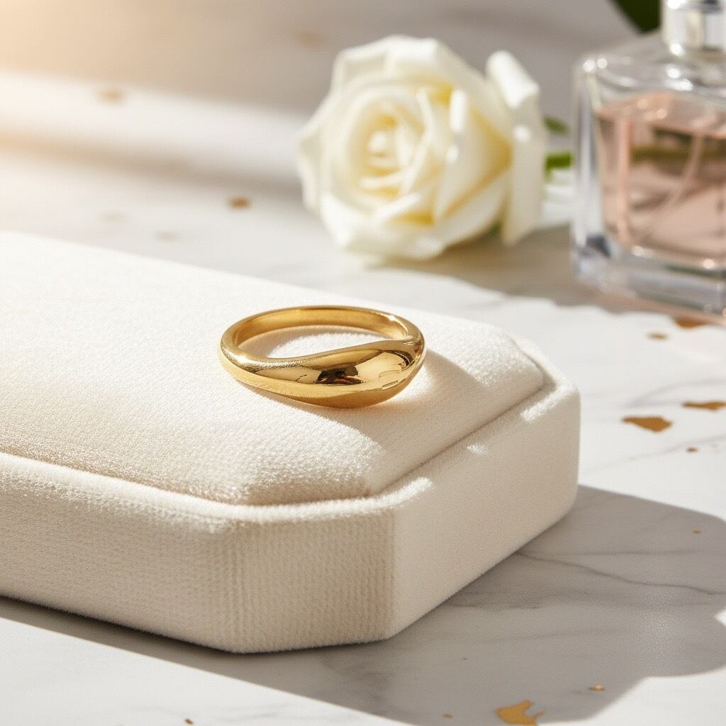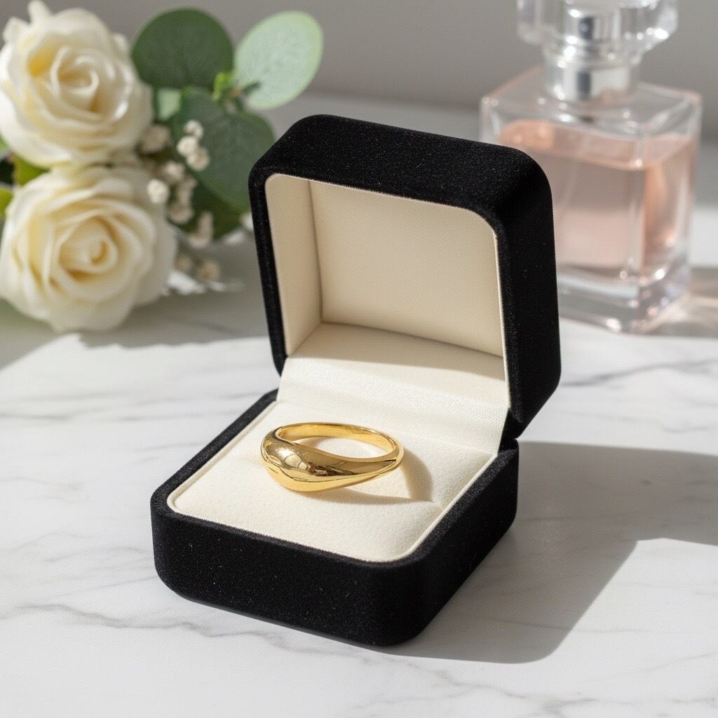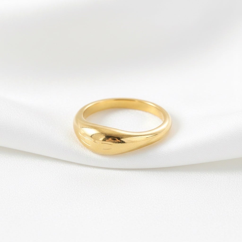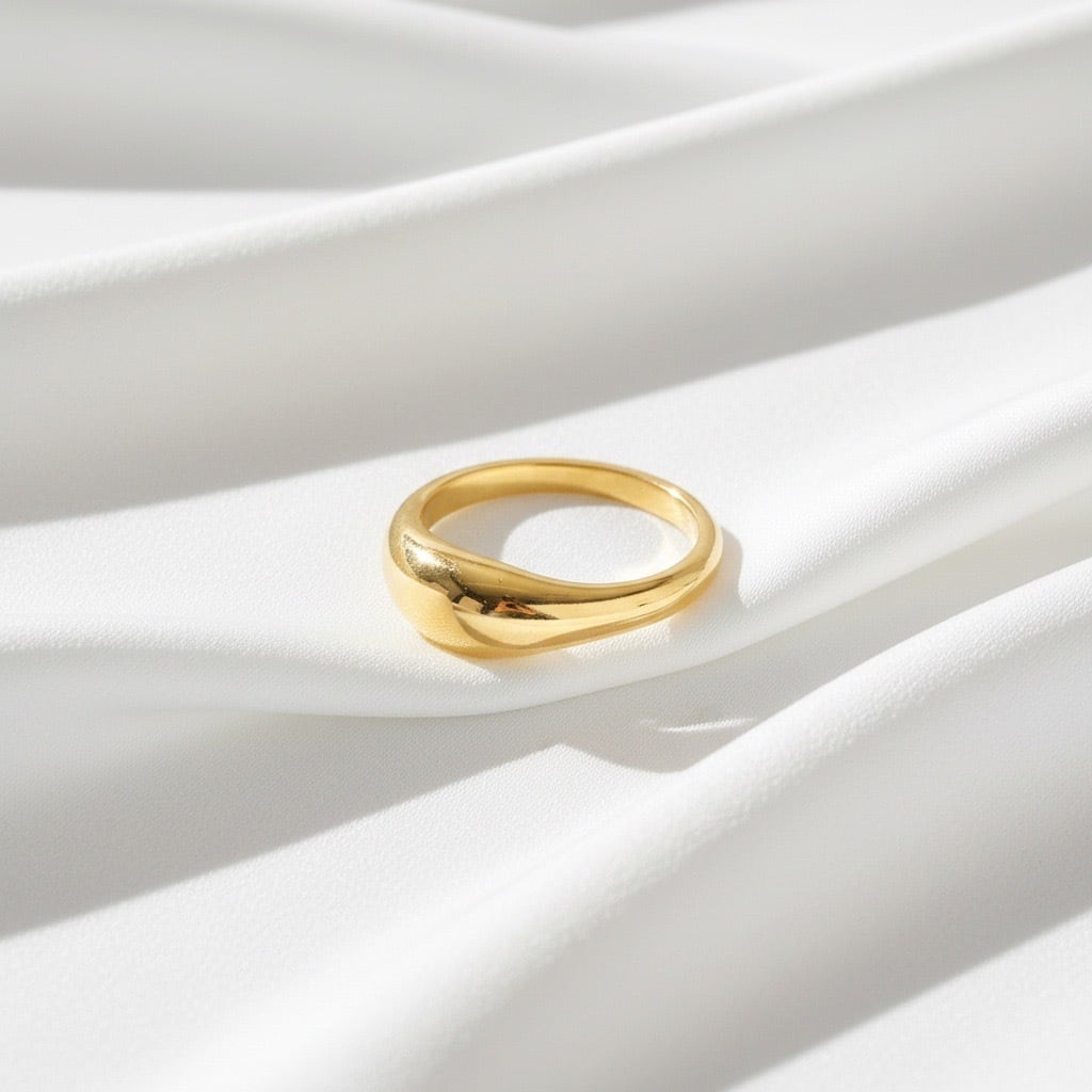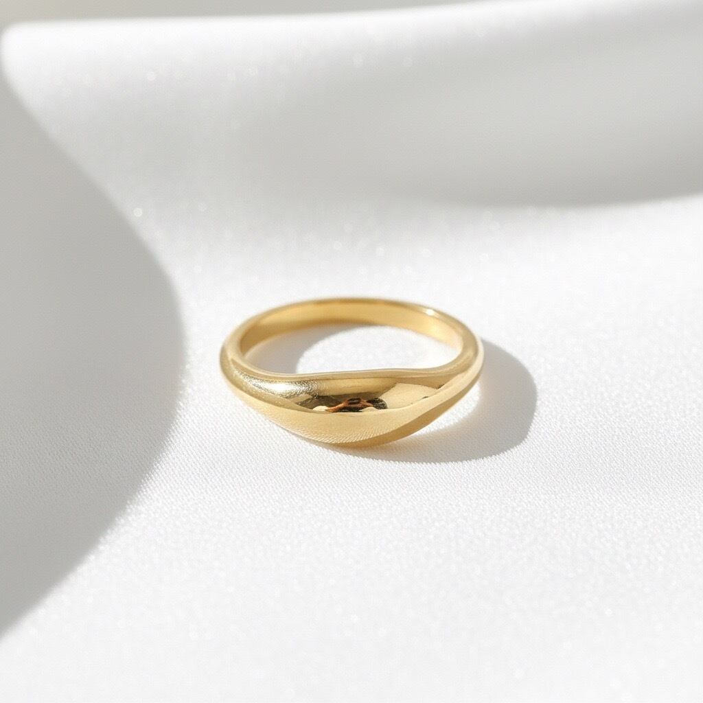 なめらかなカーブラインが指先に上品な立体感を添える、ミニマルデザインのカーブリング。ぽってりしすぎない程よいボリュームで、抜け感のあるシルエットが大人の手元に自然な輝きを与えます。シンプルでありながら存在感があり、単品ではもちろん、細身のリングとの重ね付けにも相性抜群。ゴールド・シルバーの2色展開で、どんなコーディネートにも合わせやすい万能アイテムです。