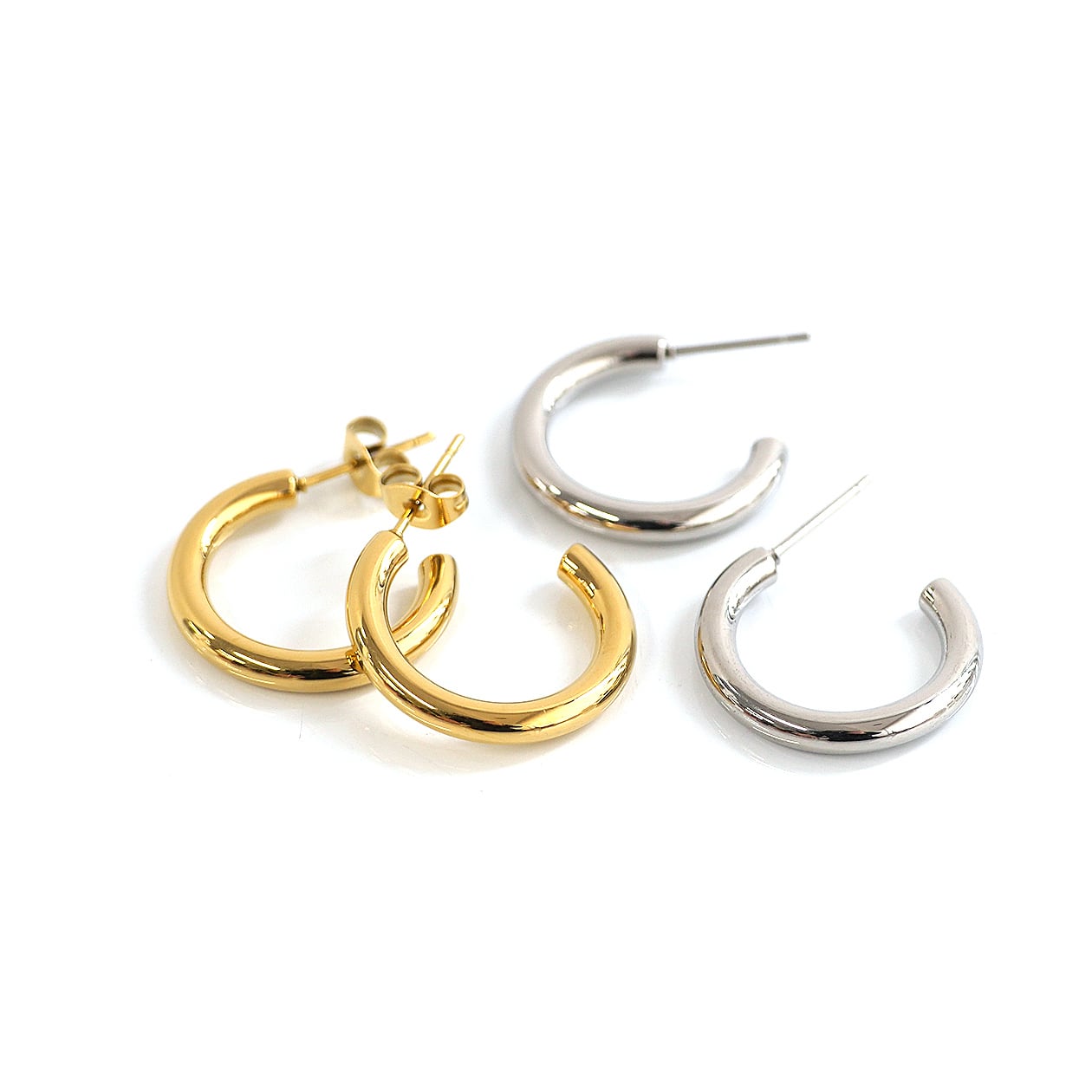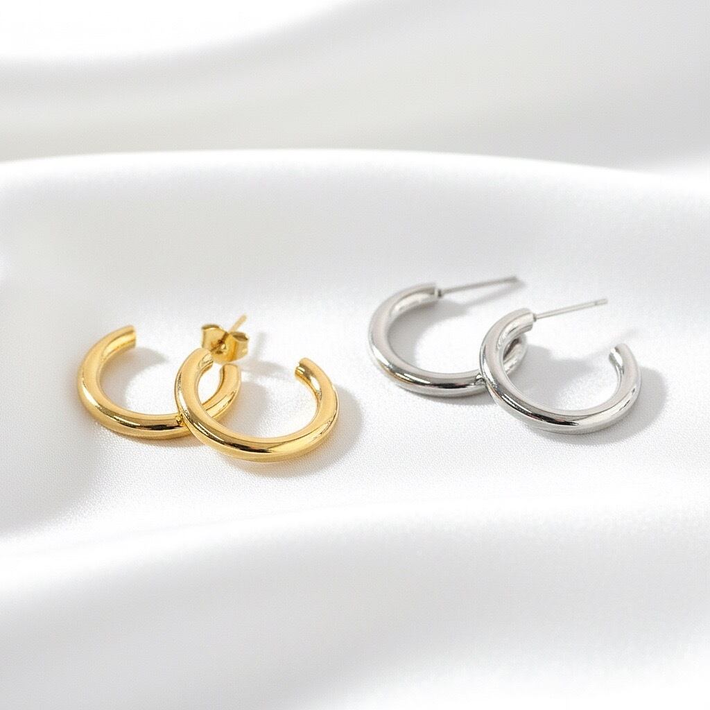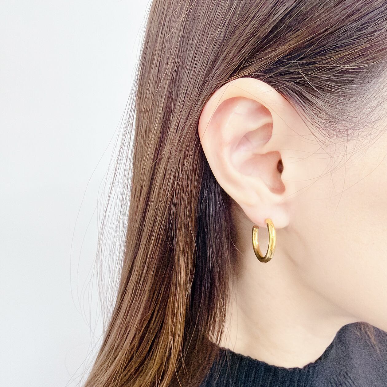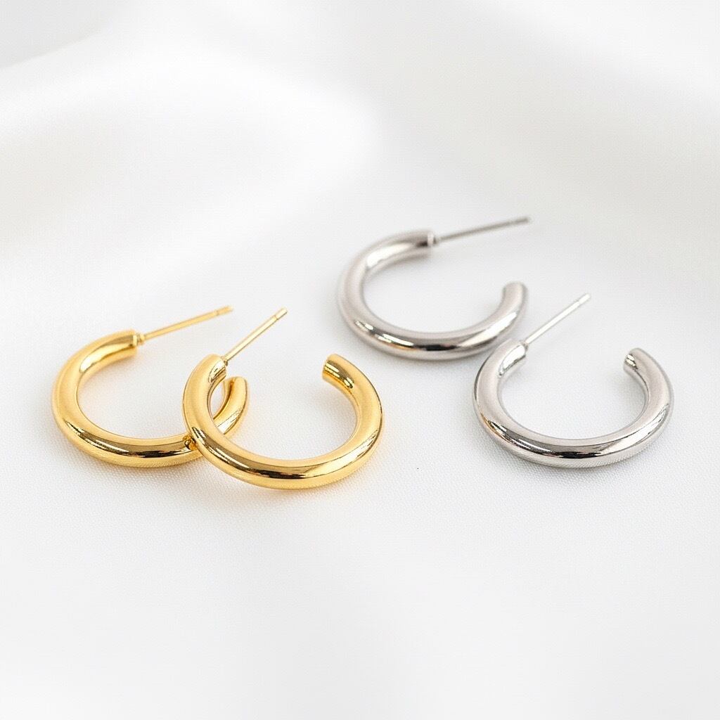 なめらかな丸みを帯びたラインが耳元を上品に彩る、シンプルなフープピアス。太さ約3mmのフープは軽やかな印象ながら程よい存在感があり、デイリーコーデにさりげないアクセントを添えてくれます。無駄のないミニマルデザインは、カジュアルからきれいめスタイルまで幅広くマッチ。カラーはゴールドとシルバーの2色展開です。