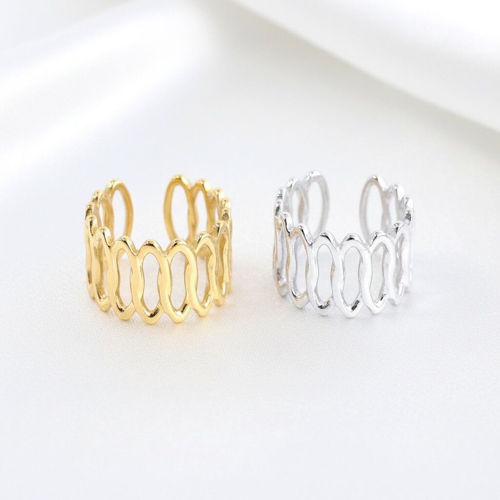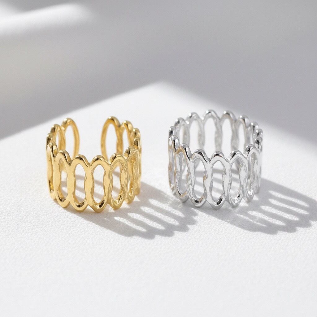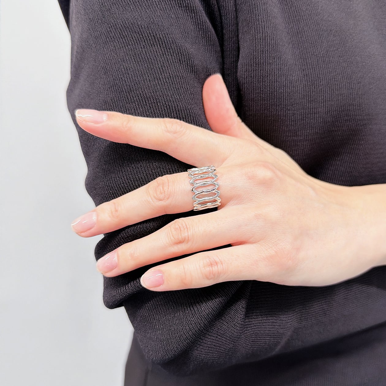 オーバルリングが連なるように配置された、軽やかで抜け感のあるニュアンスデザインリング。柔らかく波打つオーバルシルエットが指元に立体感を生み、ミニマルでありながら印象的な存在感を放ちます。単品使いはもちろん、他のリングとの重ね付けでもバランスよく馴染み、こなれたスタイリングに仕上がります。