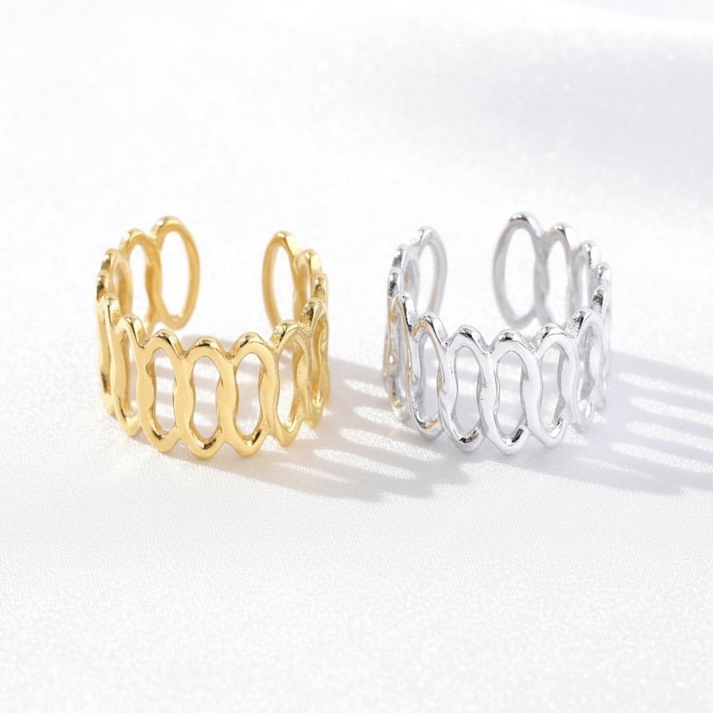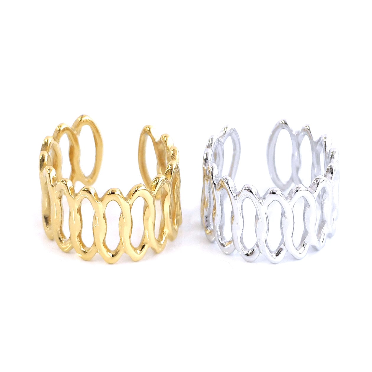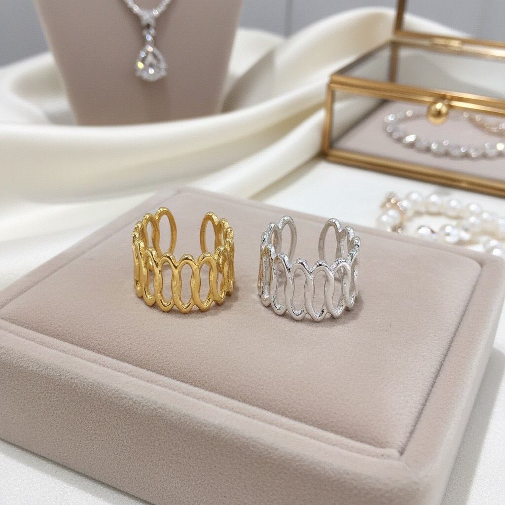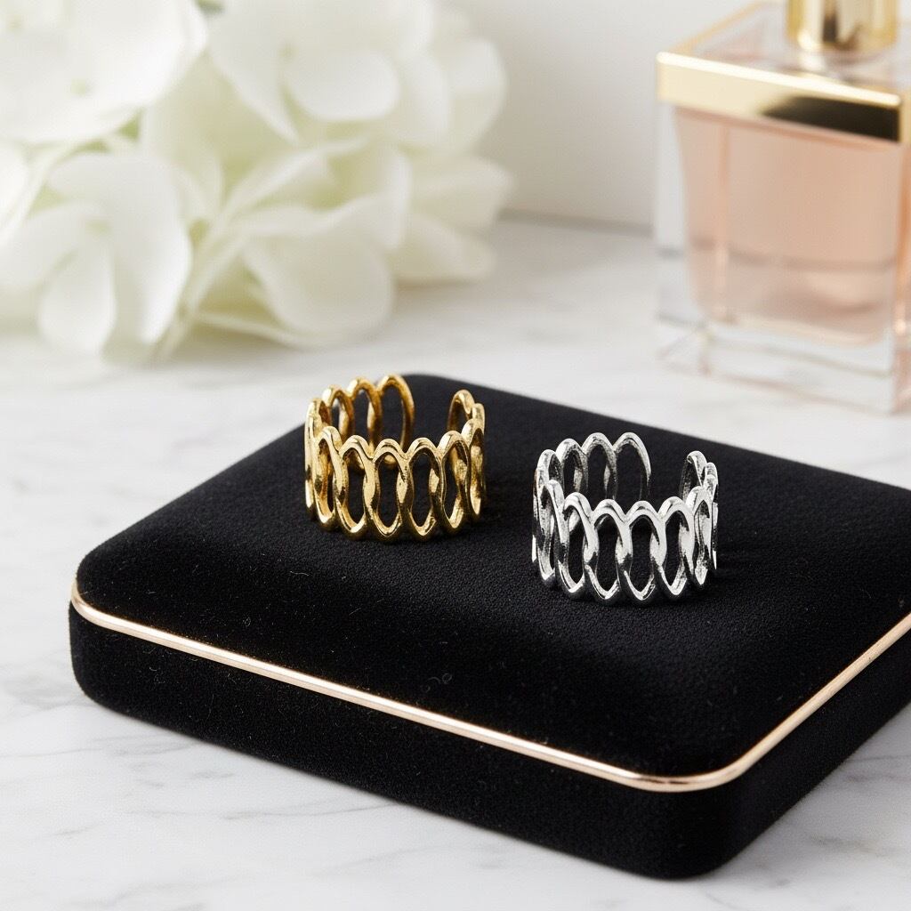 オーバルリングが連なるように配置された、軽やかで抜け感のあるニュアンスデザインリング。柔らかく波打つオーバルシルエットが指元に立体感を生み、ミニマルでありながら印象的な存在感を放ちます。単品使いはもちろん、他のリングとの重ね付けでもバランスよく馴染み、こなれたスタイリングに仕上がります。