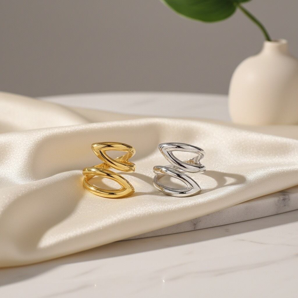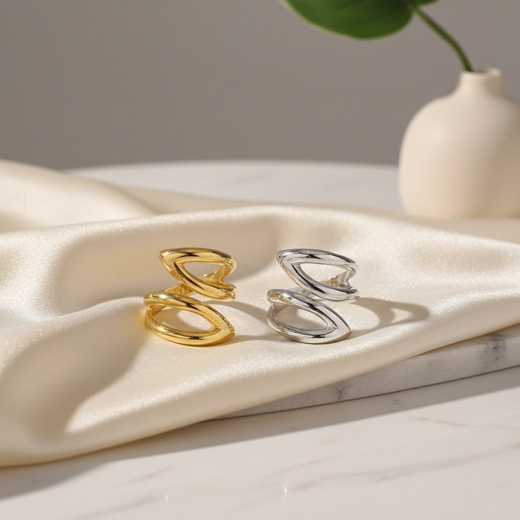 流れるようなツイストラインが指元を立体的に彩る、モダンなニュアンスデザインリング。緩やかなカーブが重なり合うフォルムは、角度によって表情が変わり、手元を美しく魅せてくれます。シンプルながら存在感のあるデザインで、カジュアルにもフォーマルにも馴染む万能アイテムです。