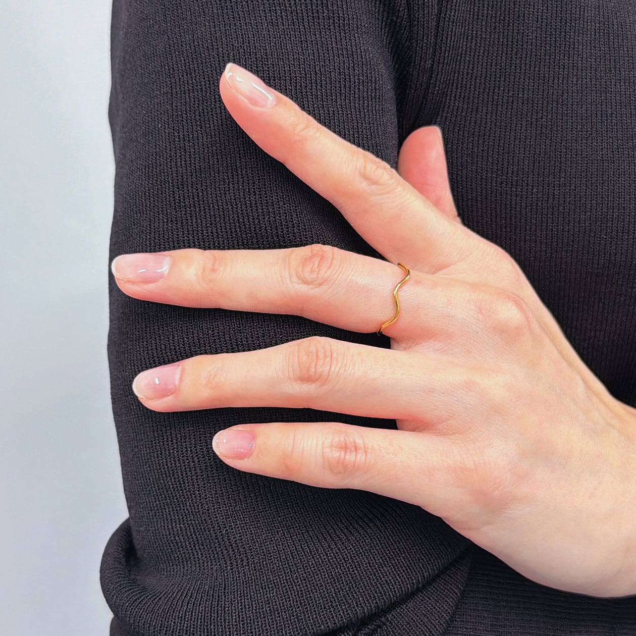 柔らかく波打つようなラインが指先にさりげない表情を添える、ニュアンスウェーブリング。主張しすぎない細身のフォルムが上品さを引き立て、1本使いはもちろん重ね付けにも相性抜群です。指に自然と沿うようなカーブが、美しいシルエットを演出。ミニマルで洗練されたデザインは、デイリーコーデに取り入れやすく、どんなスタイルにも溶け込みます。シンプルながらも女性らしいニュアンスを感じる万能リングです。