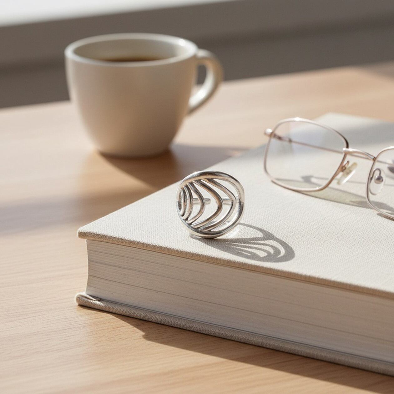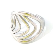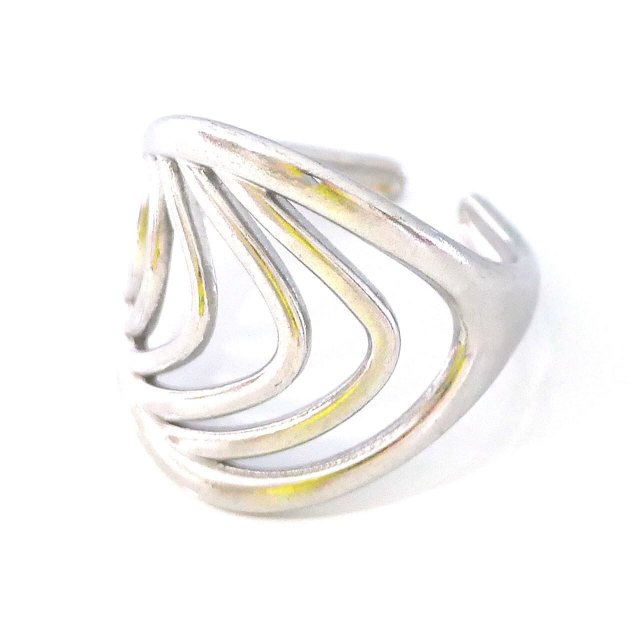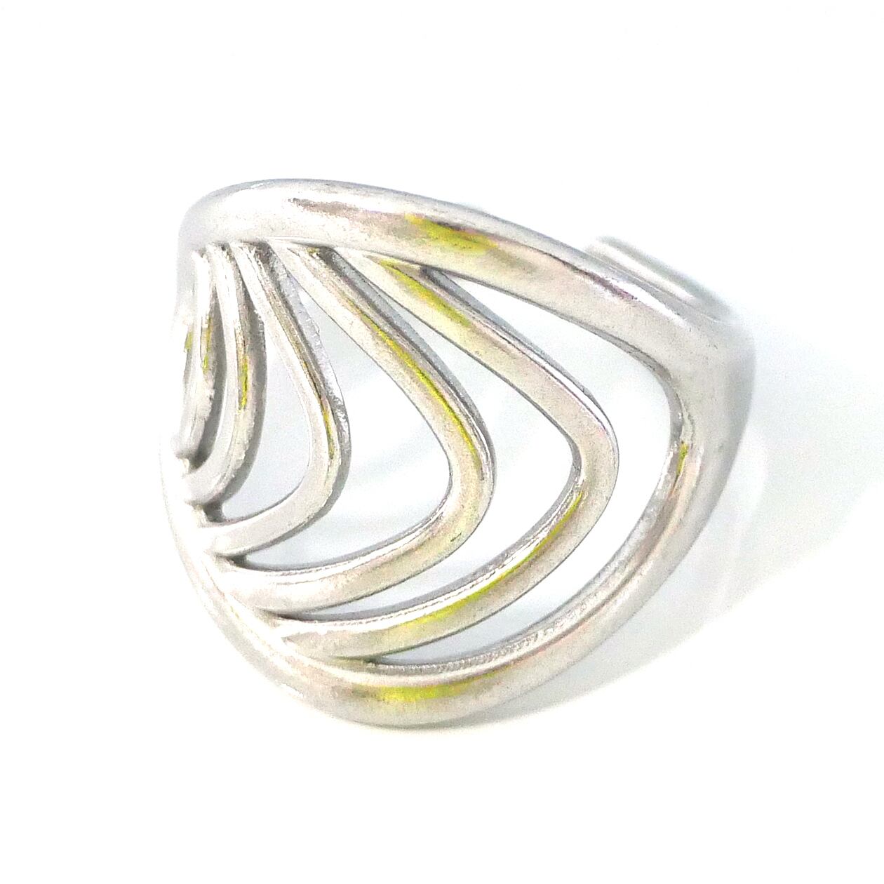 オーバルラインが連なるように配置された、立体感のあるニュアンスデザインリング。流れるような曲線が指元に自然な動きを与え、シンプルながらも印象に残るモダンな佇まいが魅力です。直線的すぎない柔らかなフォルムは、カジュアルからきれいめスタイルまで幅広くマッチ。存在感がありつつも抜け感のあるデザインのため、単品使いはもちろん、他のリングとのコーディネートにも取り入れやすい一本です。