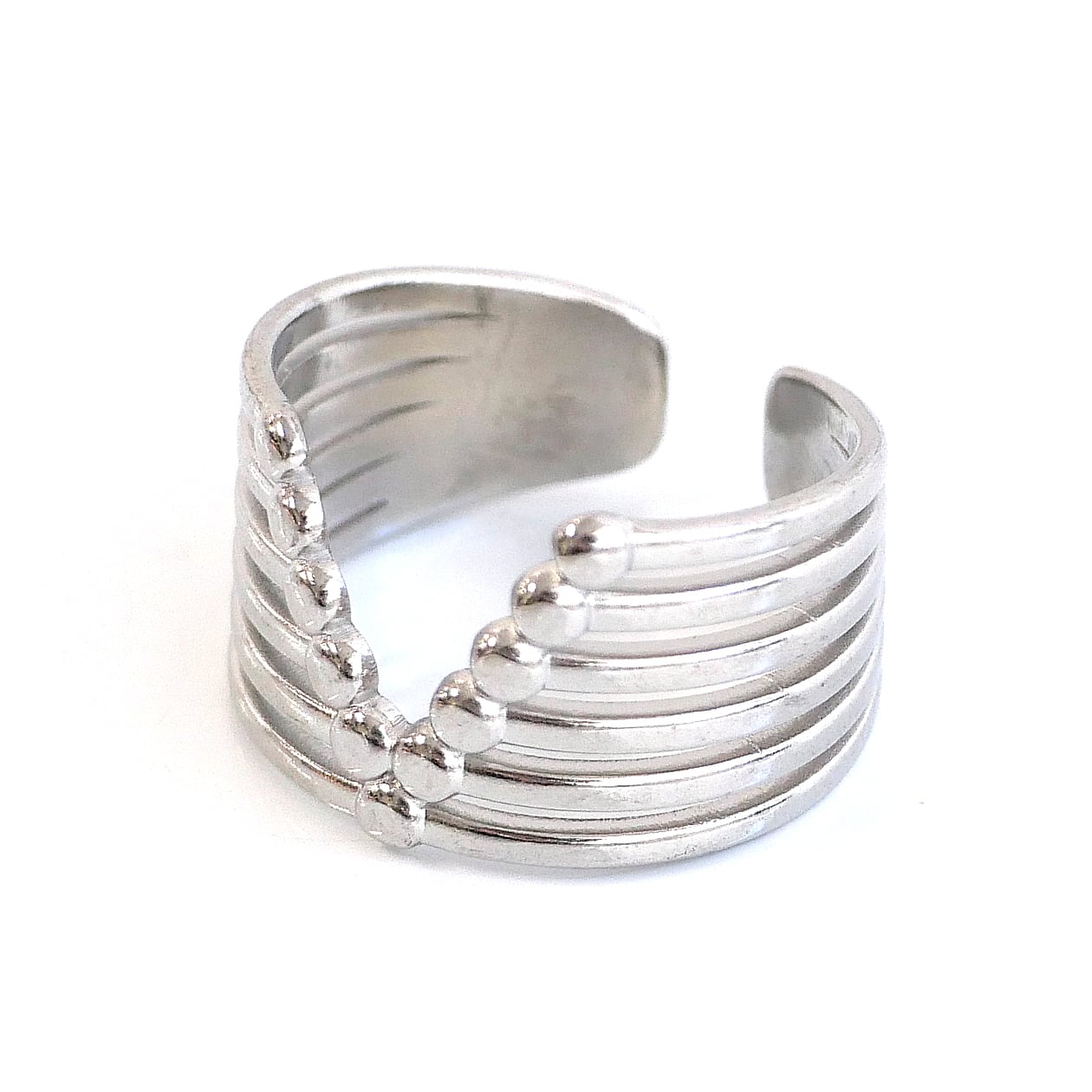 複数の細身ラインを重ねたような立体構造が印象的な、サージカルステンレス316L製のオープンリング。指元に沿って並ぶ小さなビーズモチーフが、リズム感のある輝きを添え、シンプルでありながら存在感のあるデザインに仕上げました。