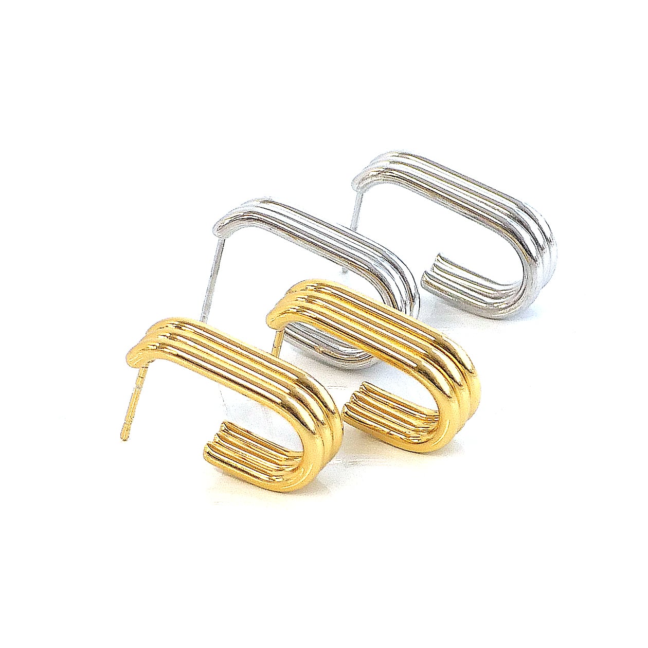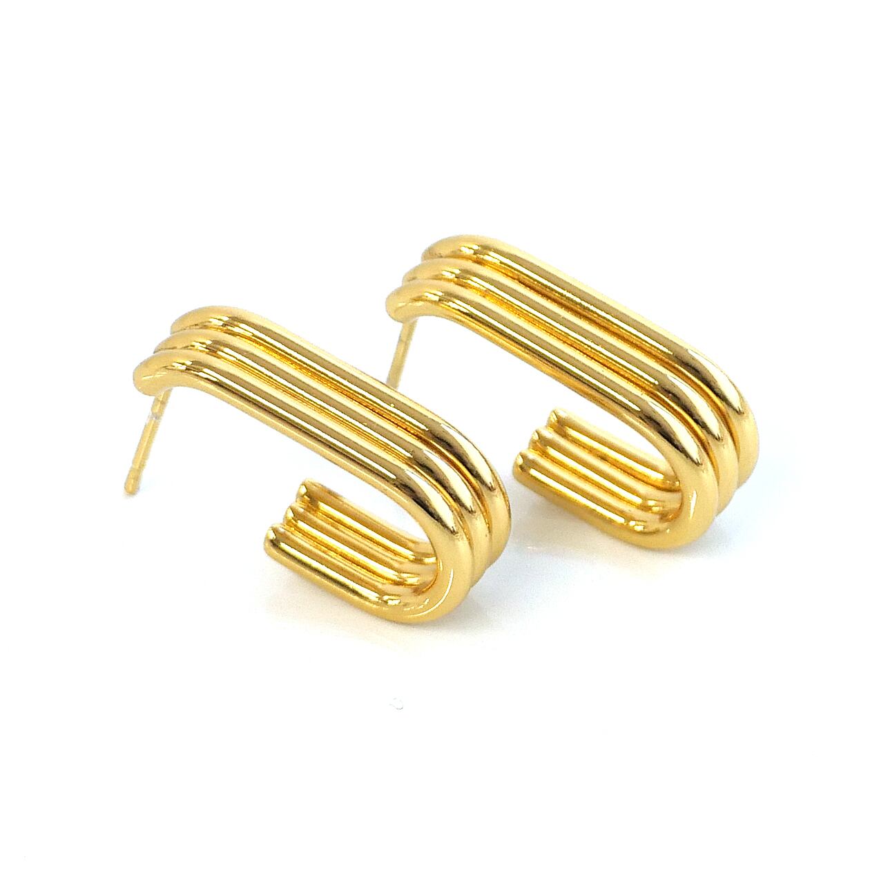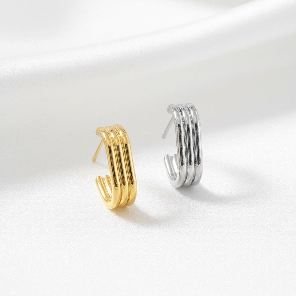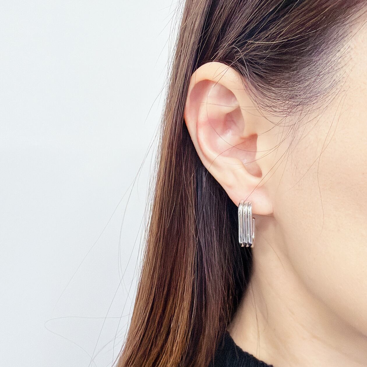 3本のラインが緩やかにカーブしながら重なり合う、立体感のあるレイヤードデザインのピアス。流れるような曲線が耳元に奥行きと動きを与え、シンプルでありながら印象に残るフォルムに仕上げました。程よいボリューム感がありつつ、主張しすぎないバランスで、カジュアルからきれいめ、モードなスタイルまで幅広くマッチ。コーディネートに自然に馴染みながら、さりげなく洗練された印象を演出します。