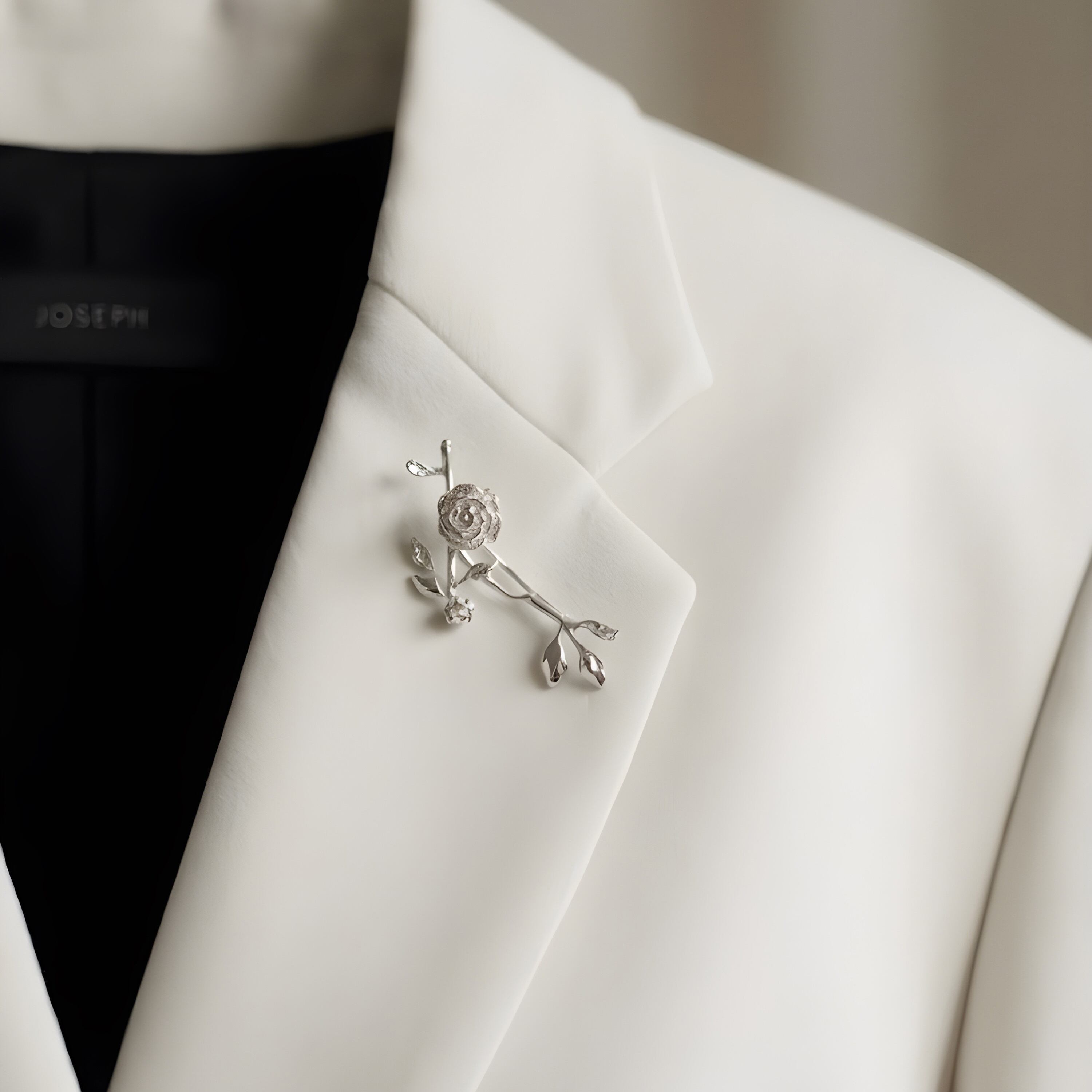 繊細に咲くローズと枝葉のラインを立体的に表現した、上品なローズモチーフブローチ。しなやかに伸びるブランチデザインが、胸元やストールに自然な動きを添え、コーディネートをさりげなく格上げしてくれます。ジャケットやニット、ワンピースはもちろん、帽子やバッグのアクセントとしてもおすすめです。派手すぎず上品な存在感で、日常使いからセレモニー、ギフトまで幅広く活躍するフラワーブローチ。植物モチーフがお好きな方や、大人の装いにさりげない華を添えたい方におすすめの一点です。専用ボックス付きでお届けします。