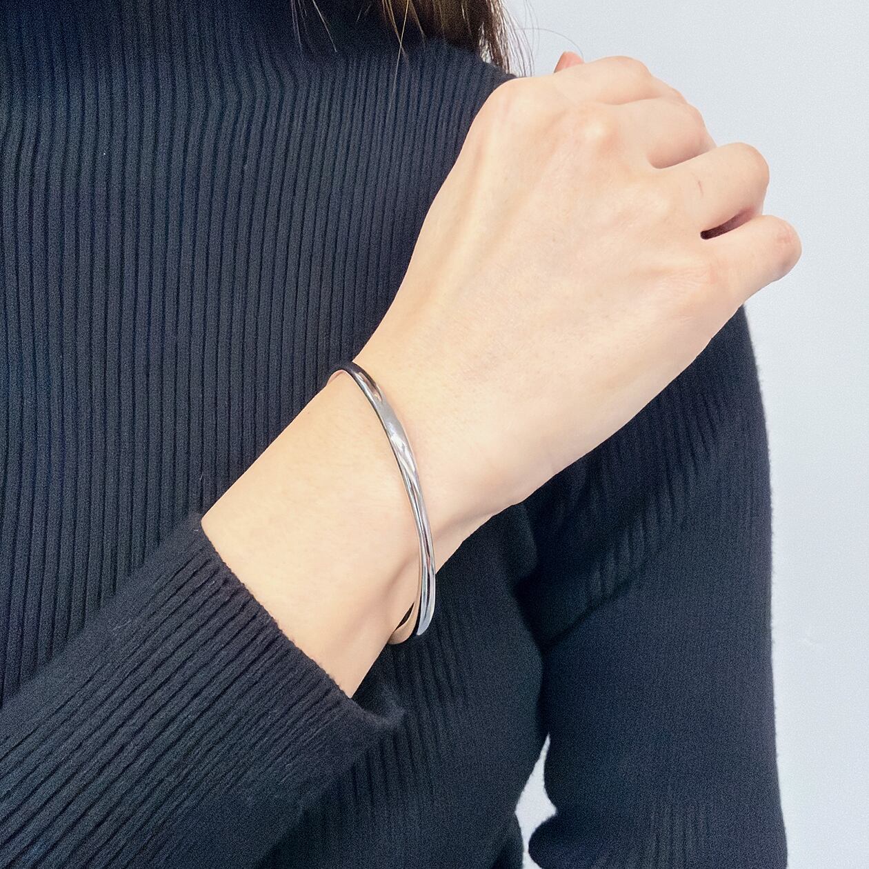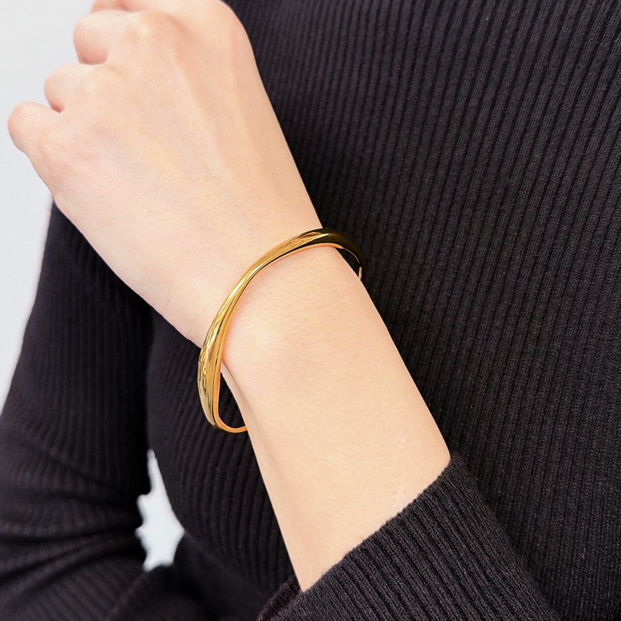 程よい太さと立体感がありつつ、主張しすぎないバランスで、カジュアルからきれいめ、モードなスタイルまで幅広くマッチ。単品使いはもちろん、他のバングルやブレスレットとの重ね付けにもおすすめで、コーディネートにさりげない洗練を添えてくれます。
