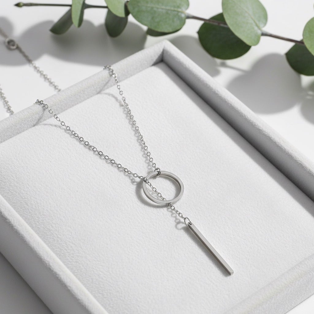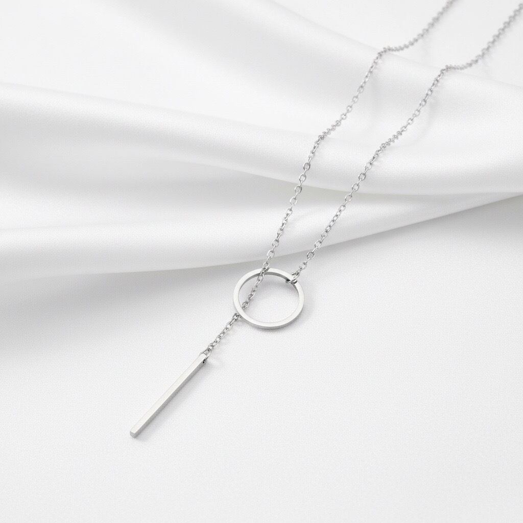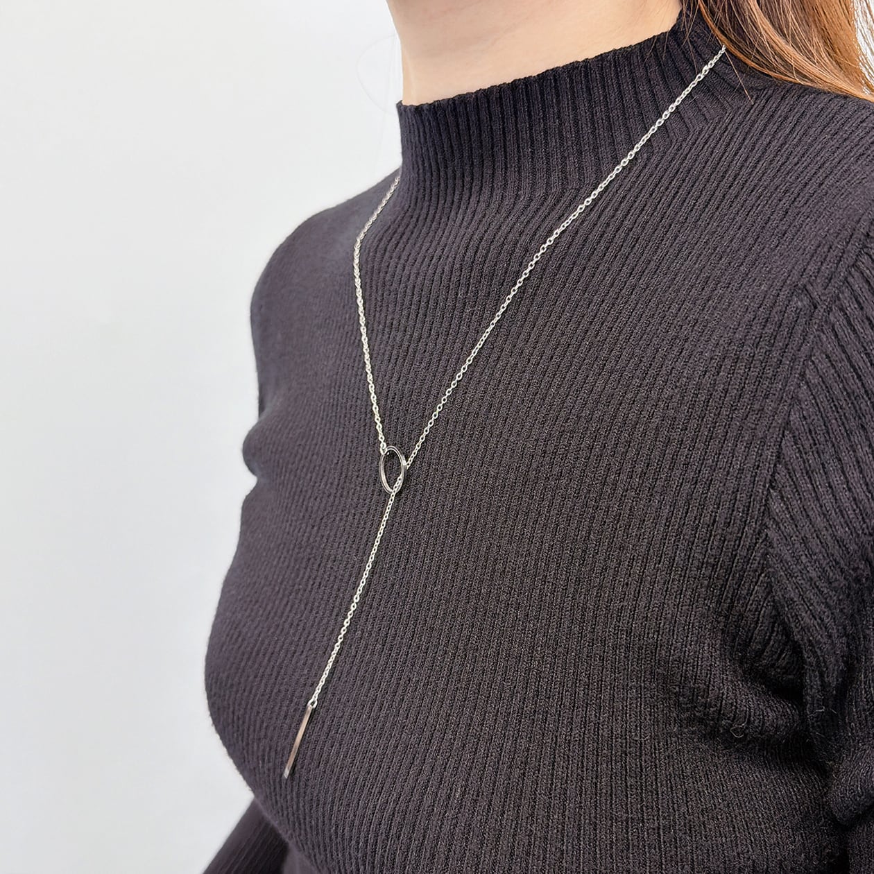 シンプルなサークルモチーフに、縦ラインのバーモチーフを組み合わせた、洗練されたY字デザインのネックレス。直線と円が織りなすミニマルなフォルムが、胸元にすっきりとした縦のラインを生み、スタイルを美しく引き立てます。