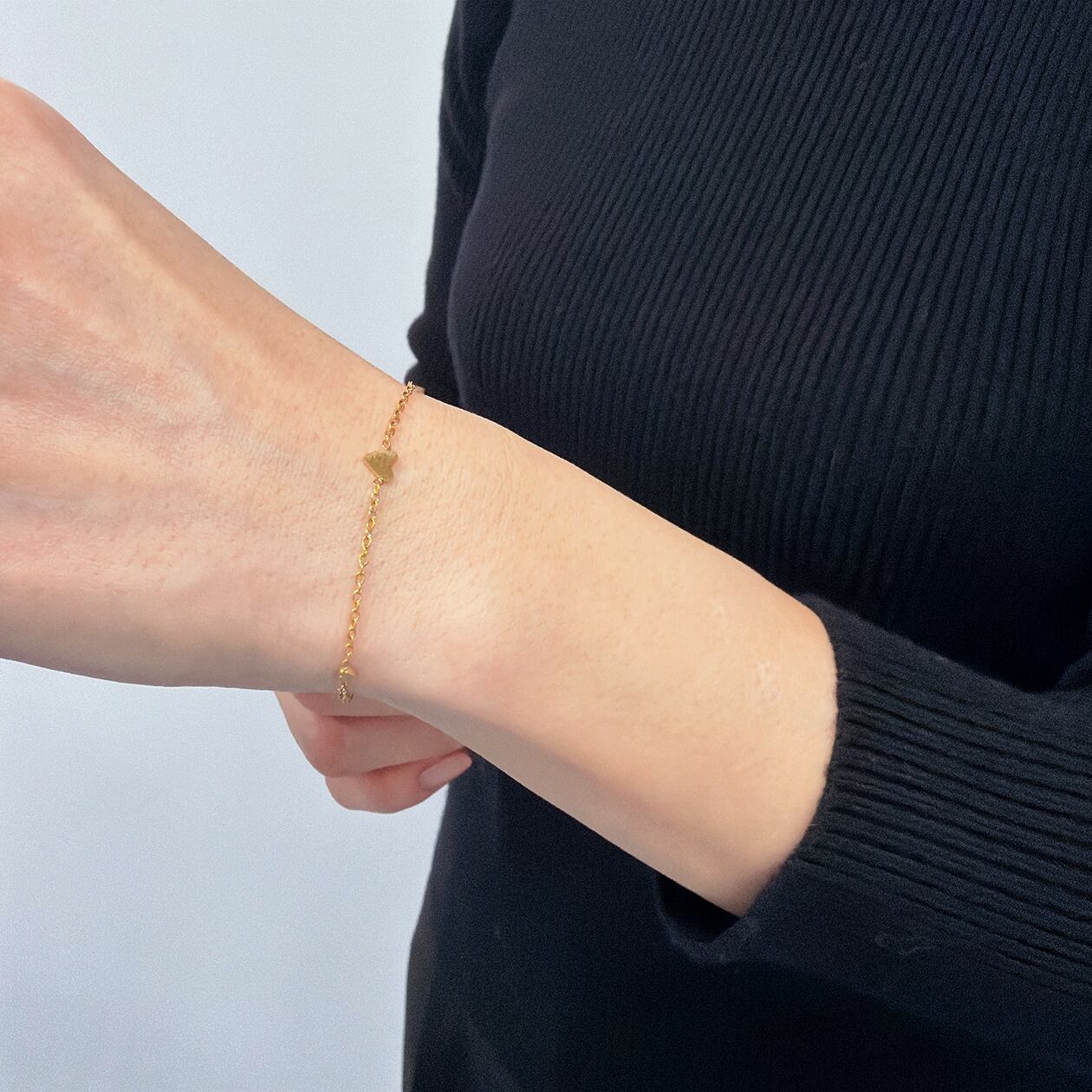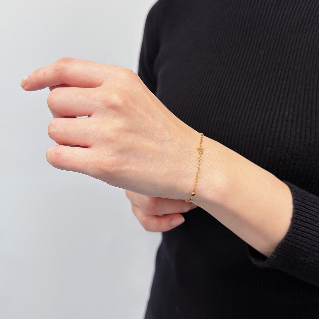 小ぶりなハートモチーフを等間隔にあしらった、繊細で上品なデザインのブレスレット。華奢なチェーンに立体感のあるハートをバランスよく配置し、手元にさりげない輝きと女性らしさを添えてくれます。ゴールドとシルバーの2色展開で、普段使いからきれいめスタイル、ギフトシーンまで幅広く活躍。軽やかな着け心地で、重ね付けにもおすすめです。