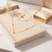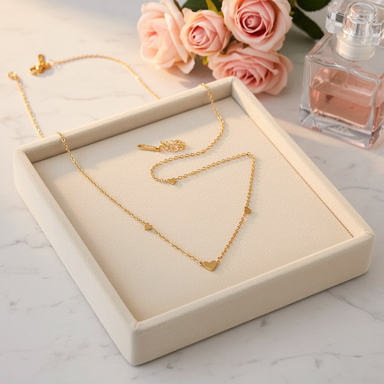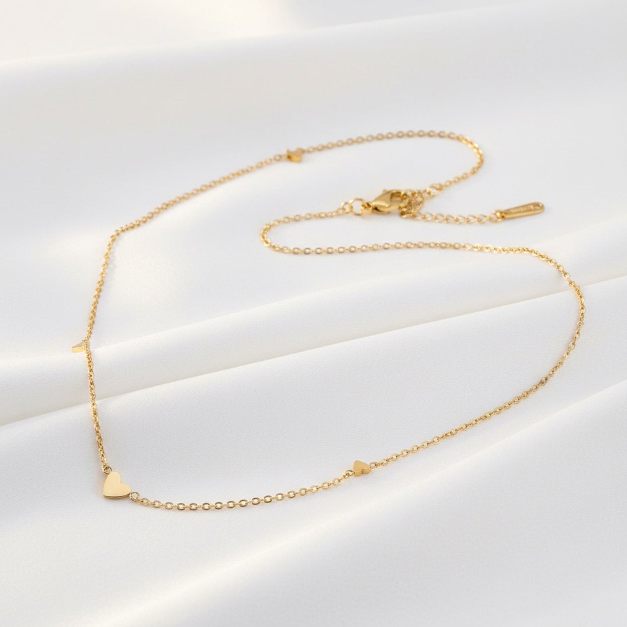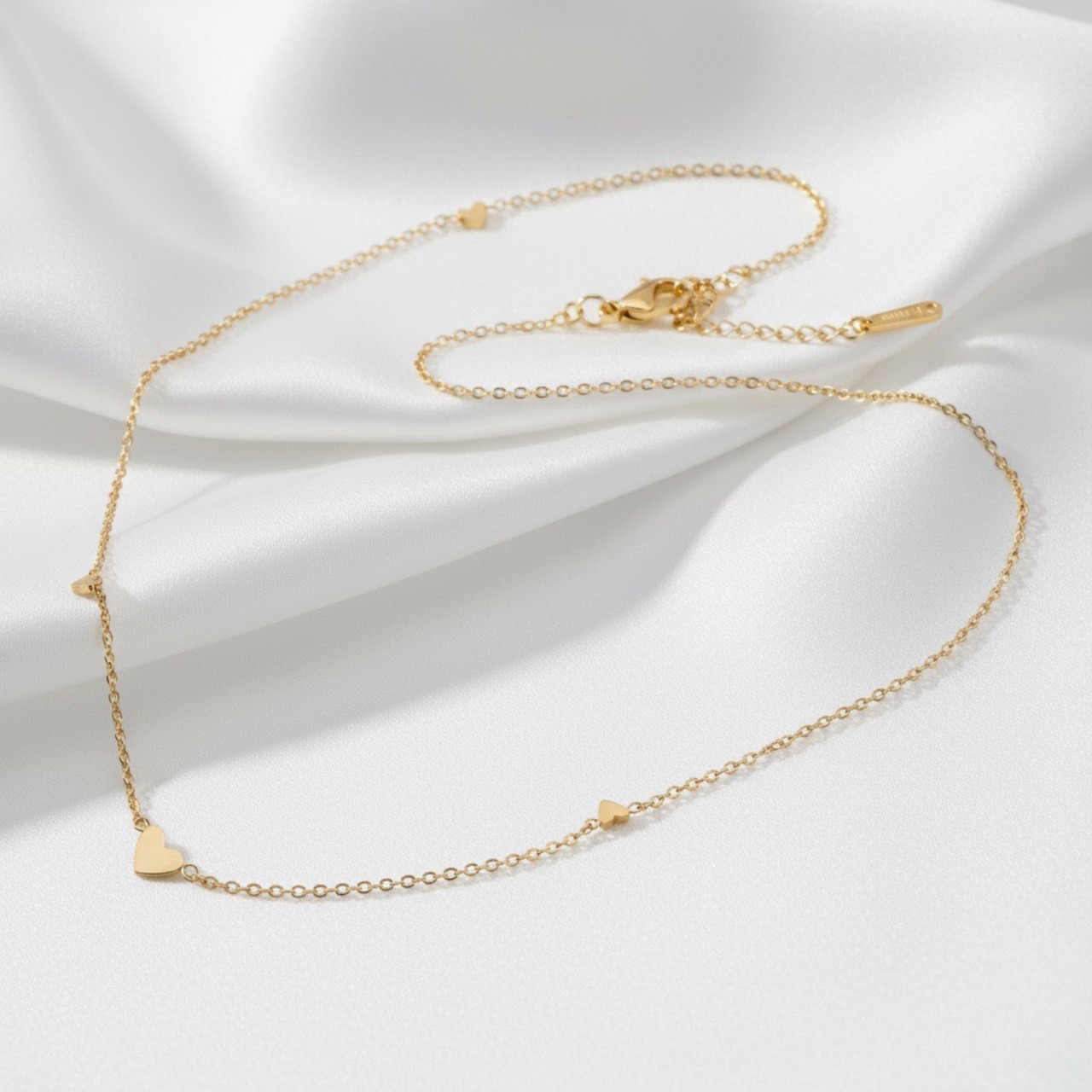 華奢なチェーンに沿って並ぶハートは主張しすぎず、デイリーコーデに自然に溶け込むデザイン。首元にやさしいアクセントを添え、カジュアルからきれいめスタイルまで幅広く活躍します。