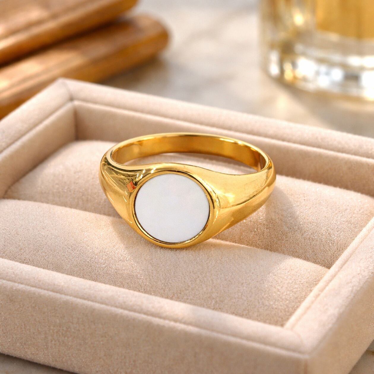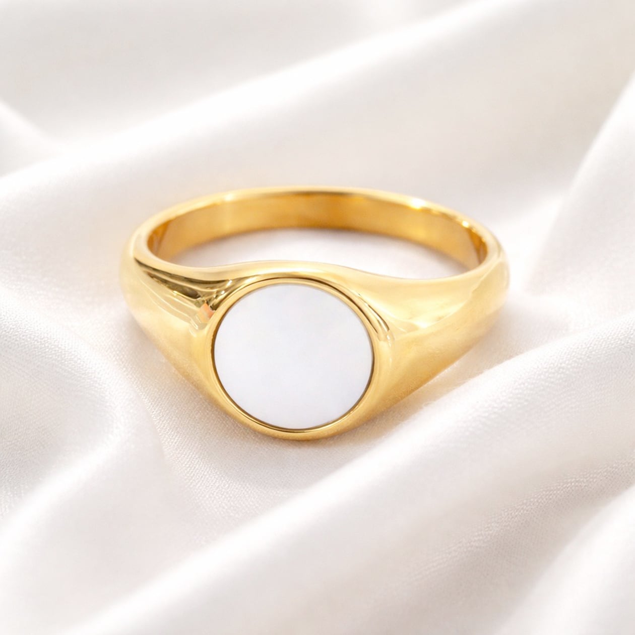 丸みのあるフェイスにやわらかく艶めくホワイトオパールをセットし、手元に上品なアクセントを添えます。スタイルやコーディネートに合わせた組み合わせが可能。傷や水、汗に強く、変色しにくいためデイリー使いにも最適です。ユニセックスで取り入れやすく、単体では程よい存在感を、他のリングとの重ね付けでは洗練された表情を楽しめます。
