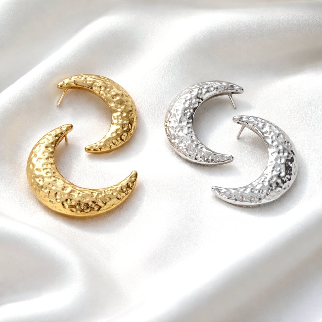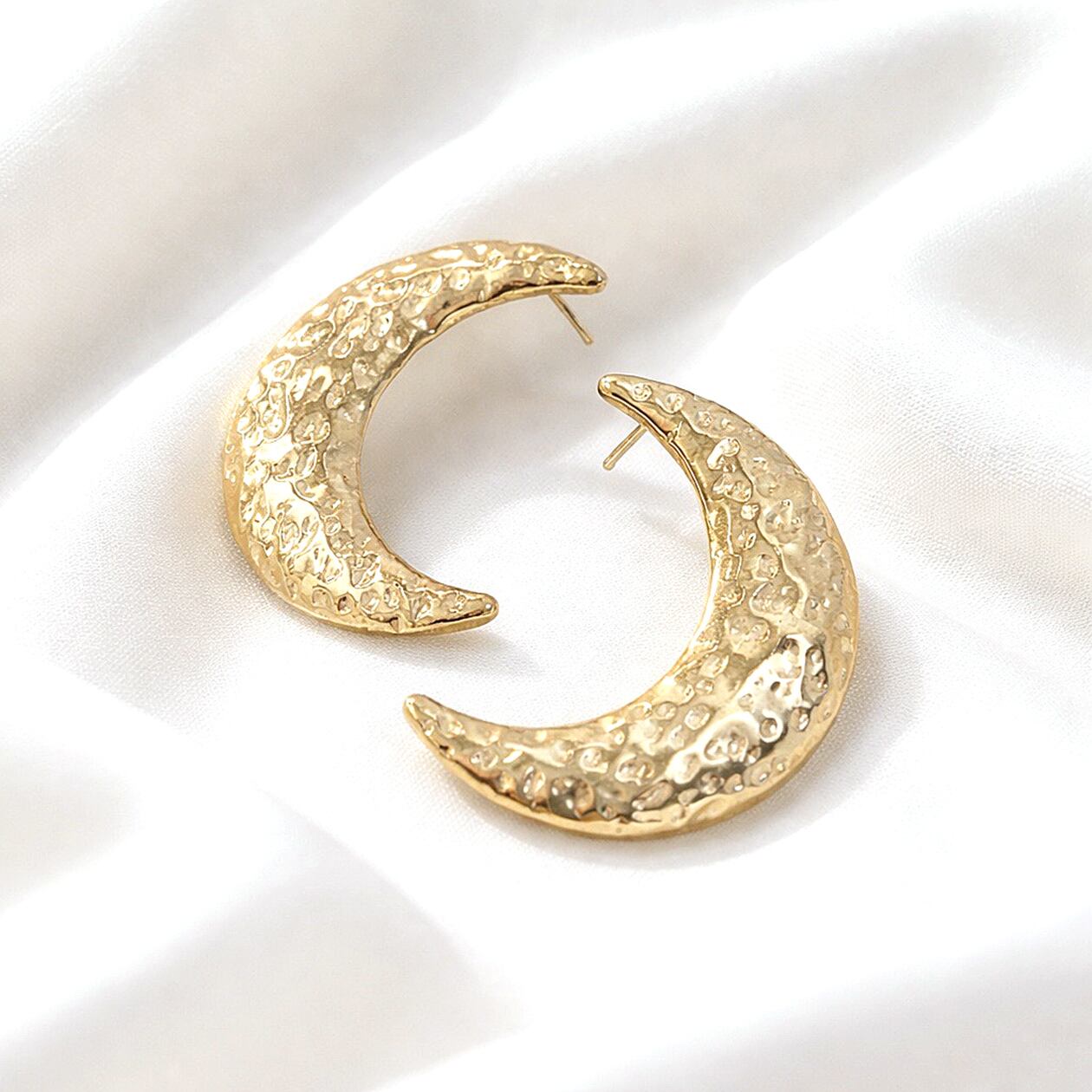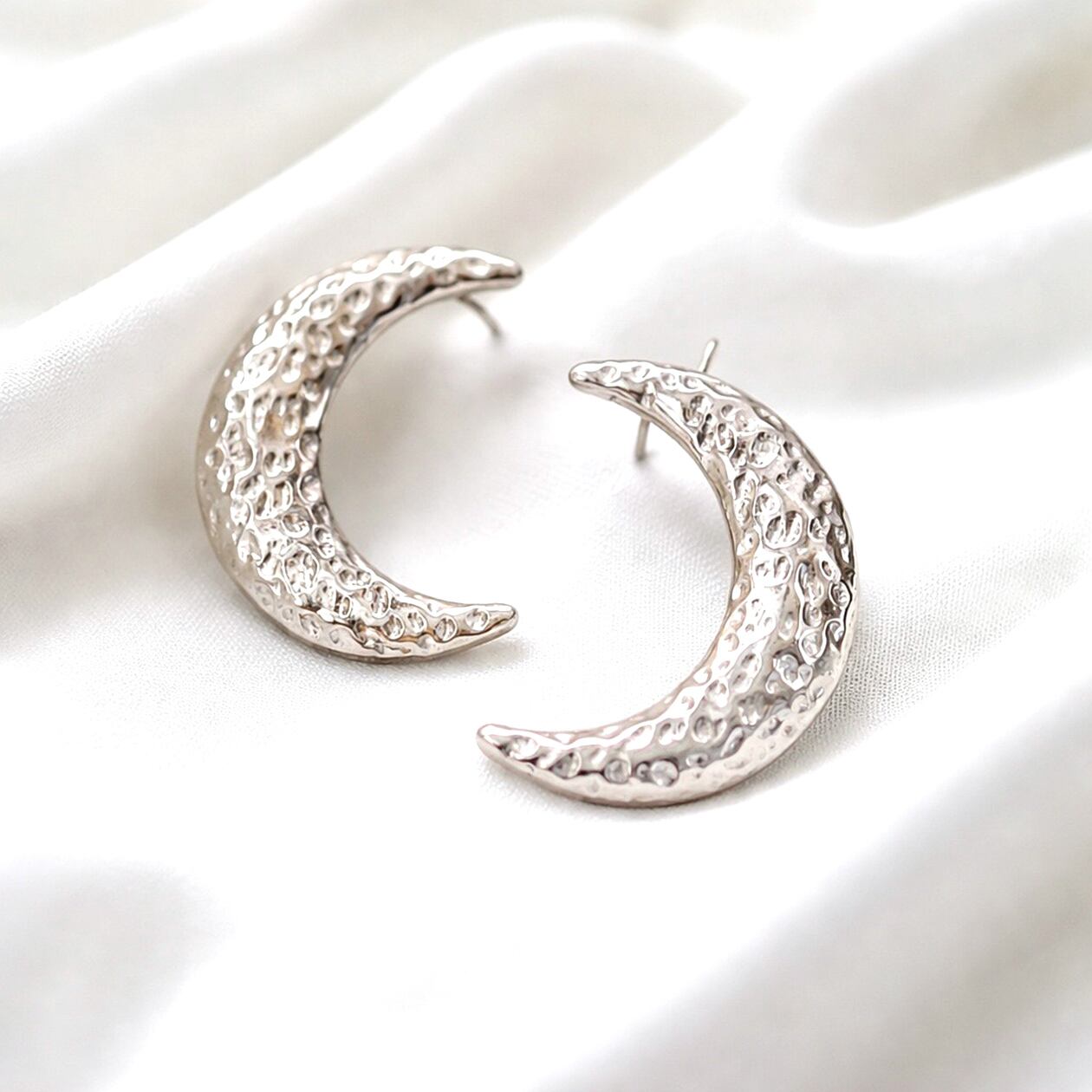 #ムーンピアス #月モチーフピアス #サージカルステンレス316L #槌目テクスチャー #ゴールドピアス #シルバーピアス #大人アクセサリー #存在感ピアス #ギフトにおすすめ #AtelierBEcudes