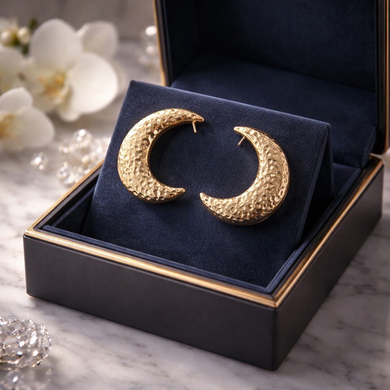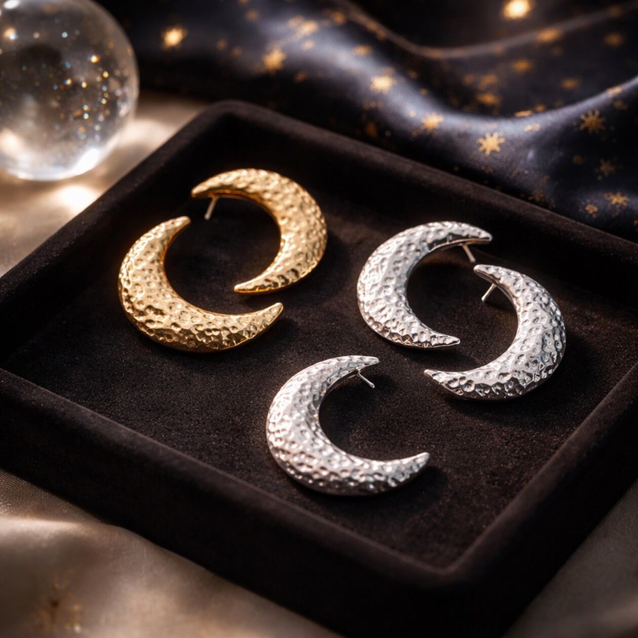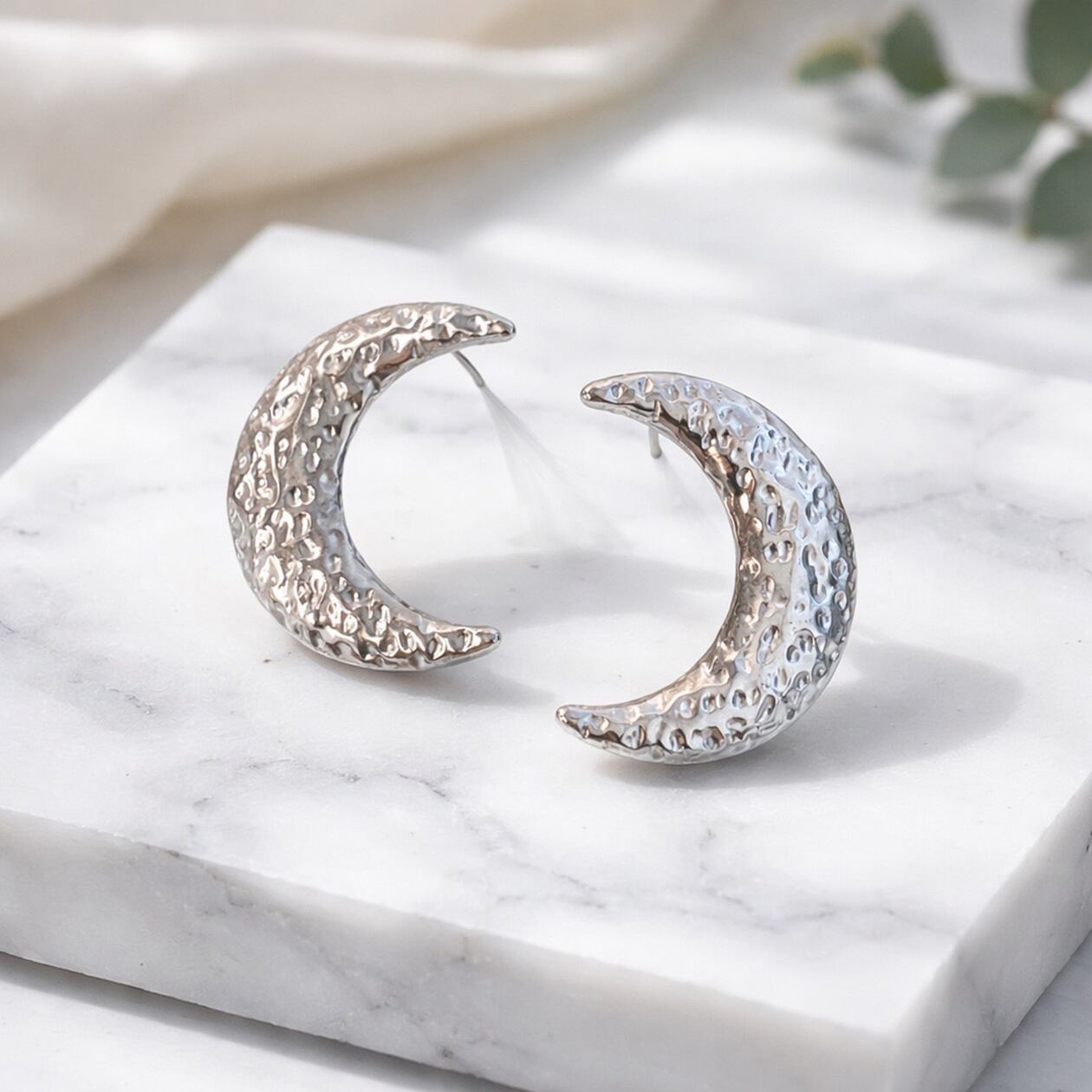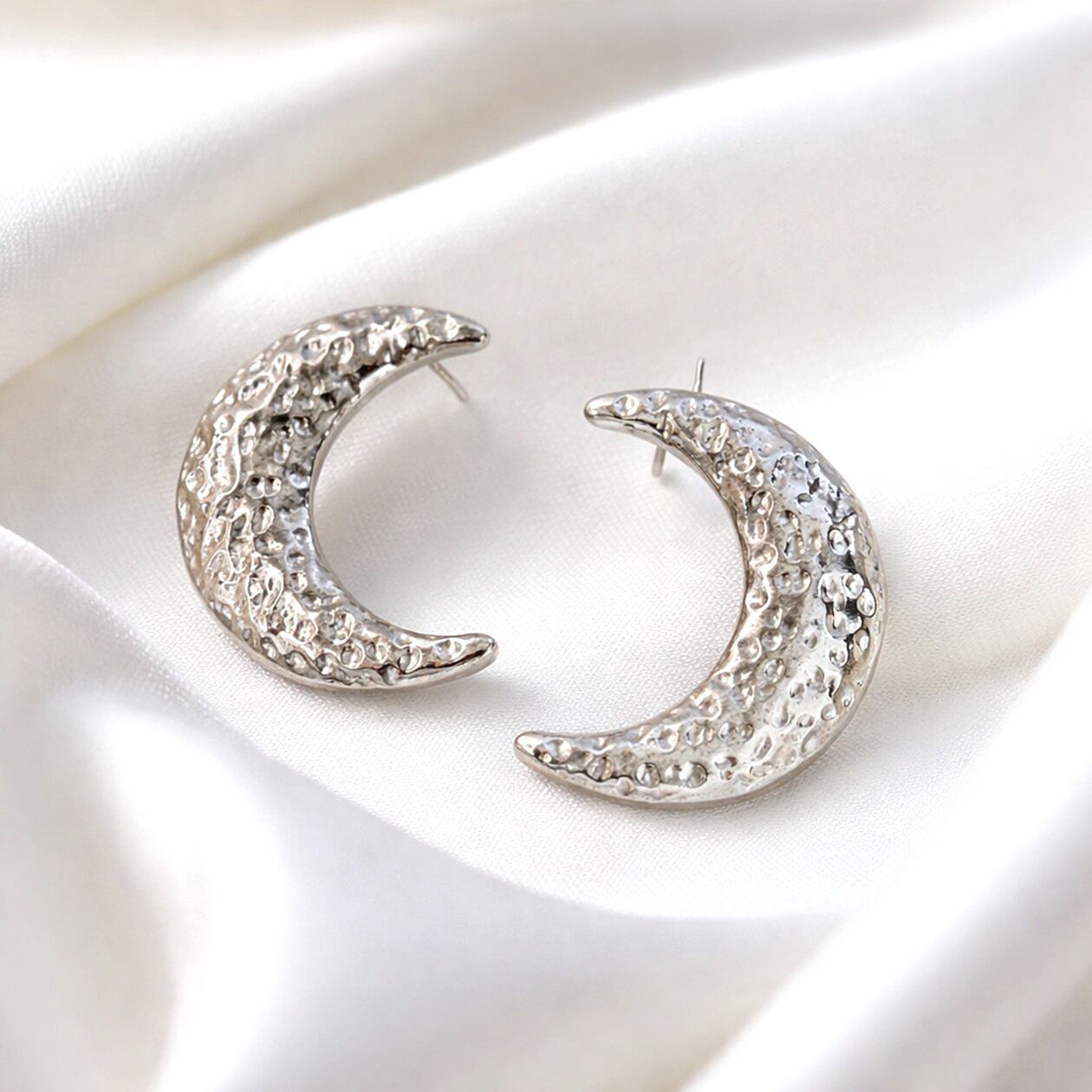 #ムーンピアス #月モチーフピアス #サージカルステンレス316L #槌目テクスチャー #ゴールドピアス #シルバーピアス #大人アクセサリー #存在感ピアス #ギフトにおすすめ #AtelierBEcudes