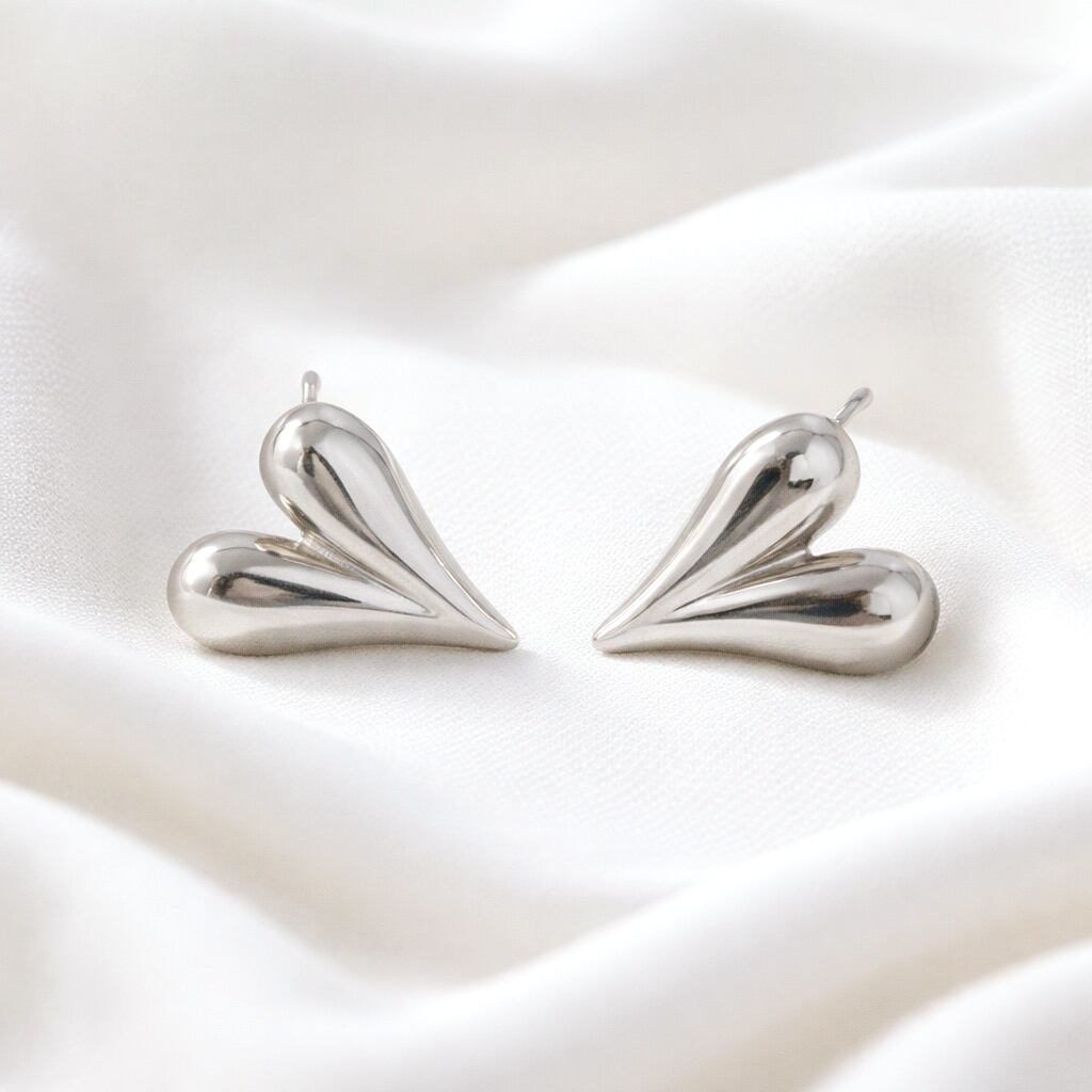 やわらかな曲線で描かれた立体的なハートモチーフが印象的な、サージカルステンレス316L製ピアス。シンプルながら奥行きのあるフォルムが、耳元にさりげない存在感と上品な輝きを添えます。甘くなりすぎない洗練されたデザインで、カジュアルからきれいめまで幅広いスタイリングにマッチ。ゴールドとシルバーの2色展開で、季節やコーディネートを選ばず活躍します。