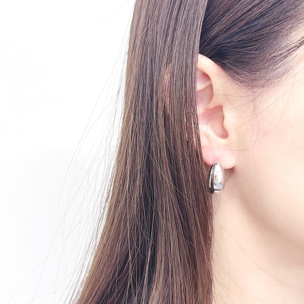 なめらかな曲線が美しく、雫を思わせる立体フォルムのピアス。丸みのあるシルエットと艶やかなシルバーカラーが、耳元に上品な存在感を添えます。無駄のないミニマルなデザインは、カジュアルからきれいめまで幅広いスタイリングに自然と馴染み、デイリー使いにもおすすめです。