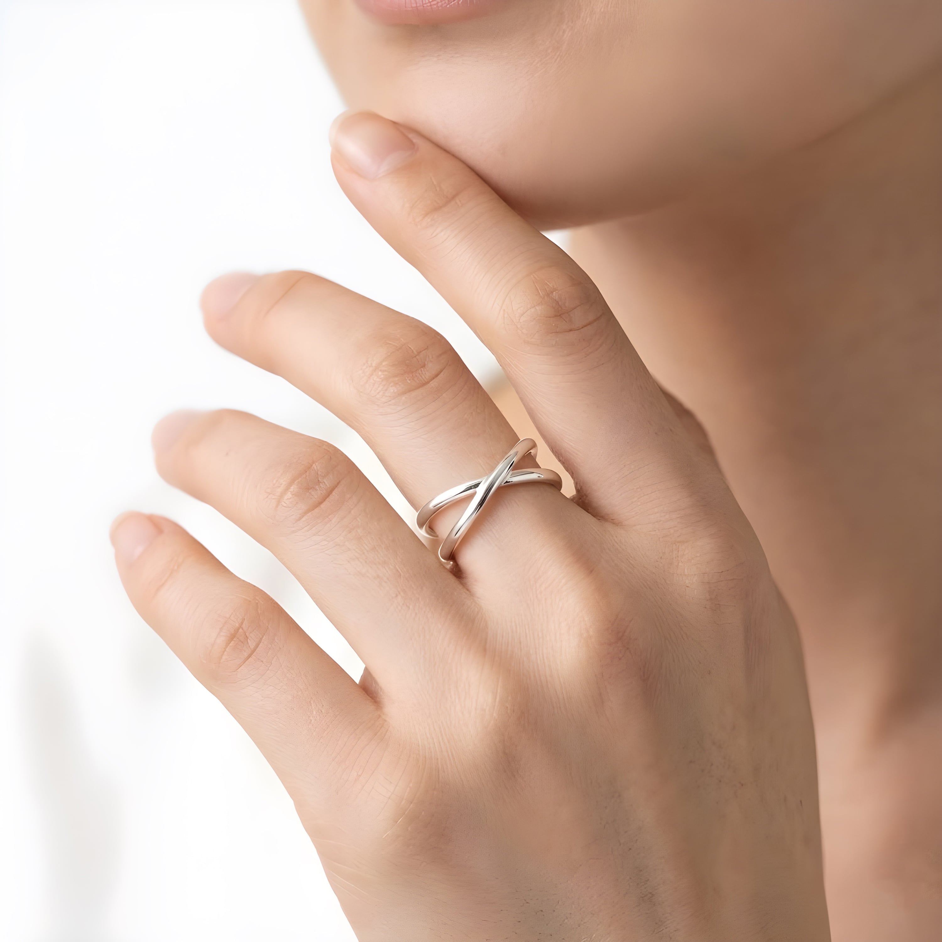 流れるように交差する2本のラインが印象的な、クロスデザインのリング。艶のある仕上げが指元に上品な輝きを与え、シンプルでありながら程よい存在感を放つデザインです。立体的に重なり合うラインが、指をすっきりと美しく見せてくれます。ゴールドとシルバーの2色展開で、カジュアルからきれいめまで幅広いコーディネートに馴染みます。