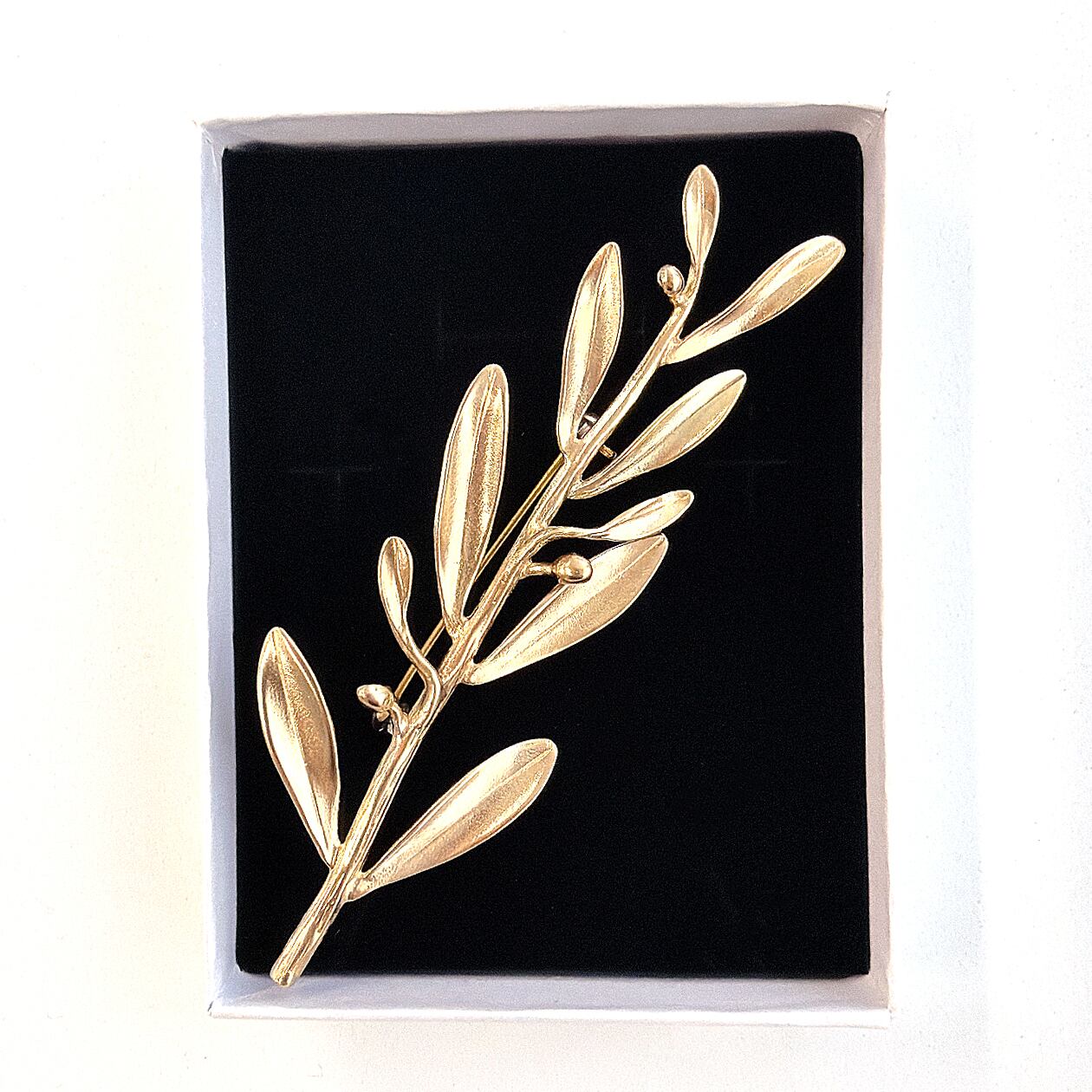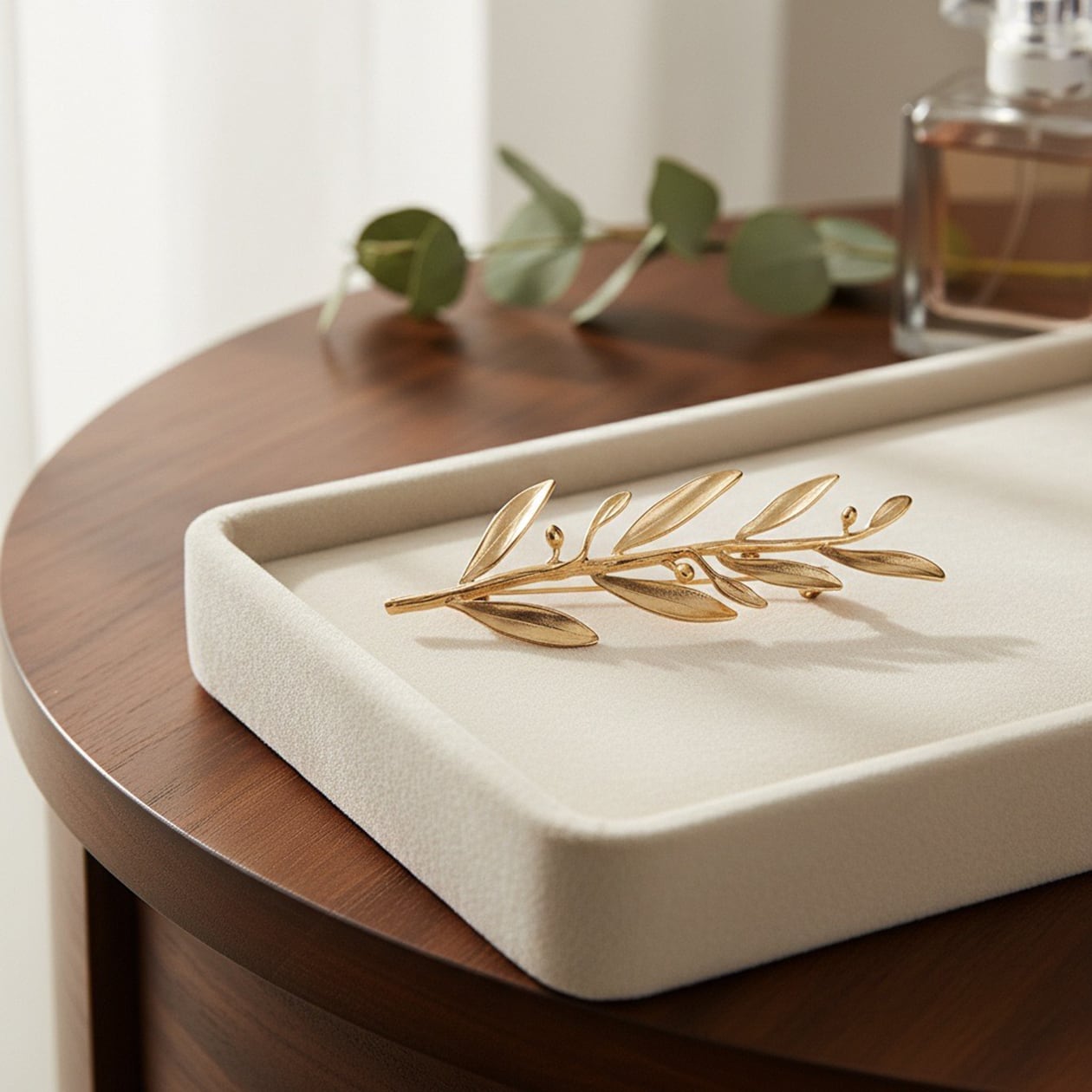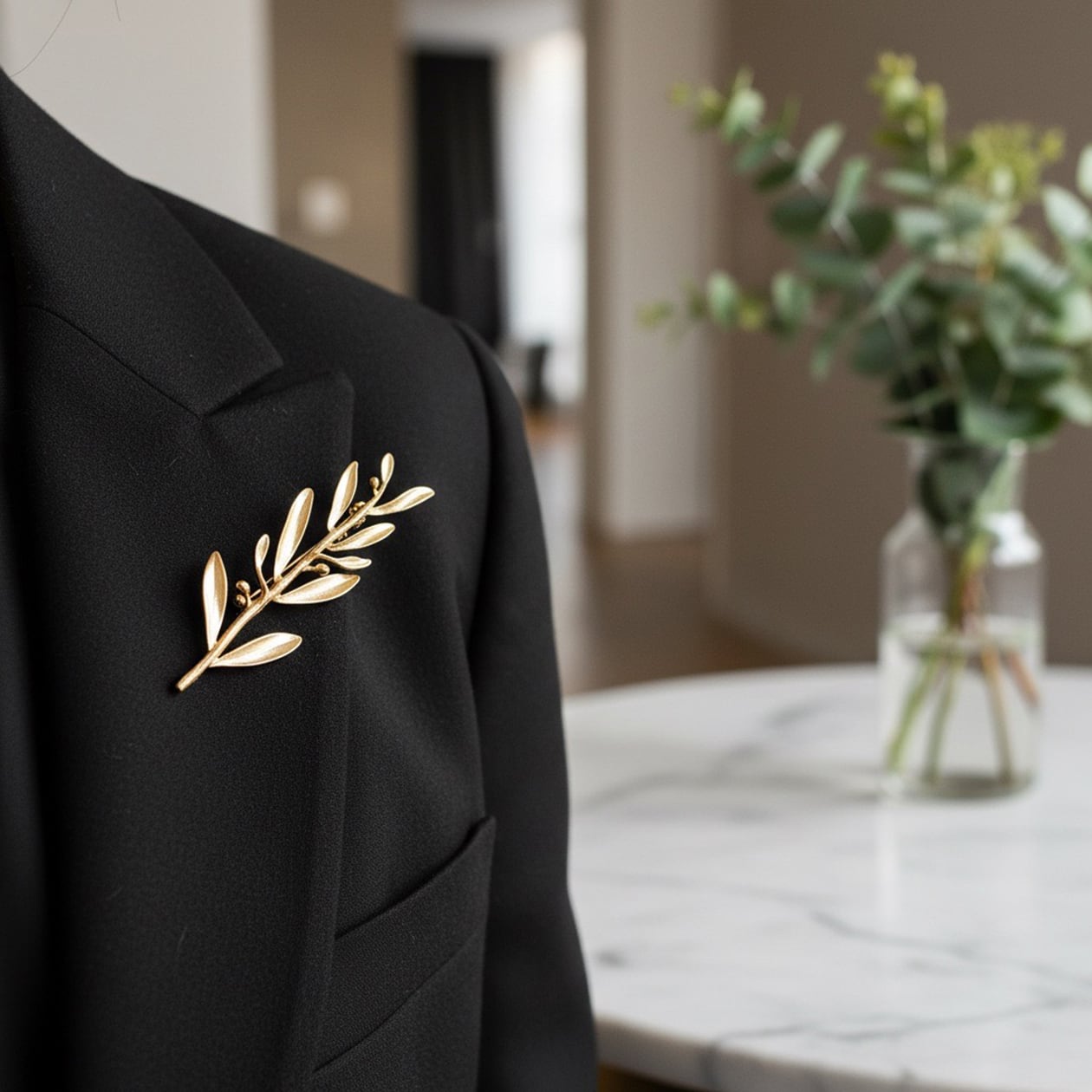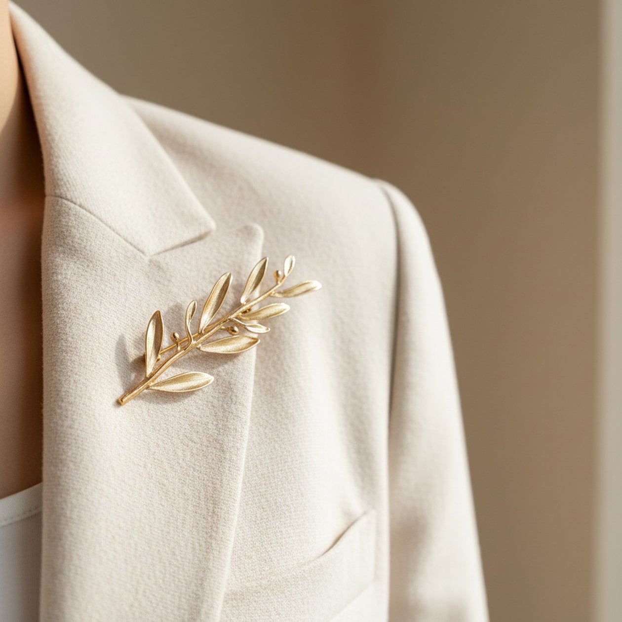 植物の枝葉をモチーフにした、アンティーク調の真鍮製ブローチ。繊細に伸びるリーフデザインと、落ち着きのあるゴールドカラーが上品な存在感を演出します。程よい立体感とマットな質感が、ジャケットやコート、ニット、ワンピースなど幅広いスタイルに自然に馴染み、装いにさりげない華やかさを添えてくれます。