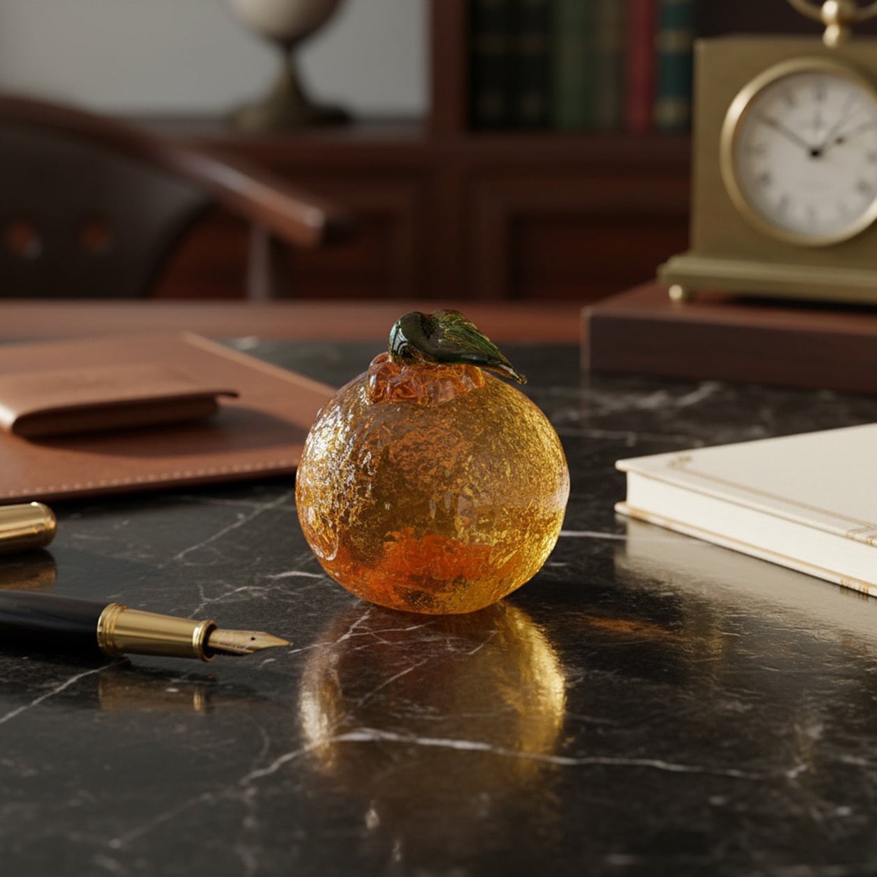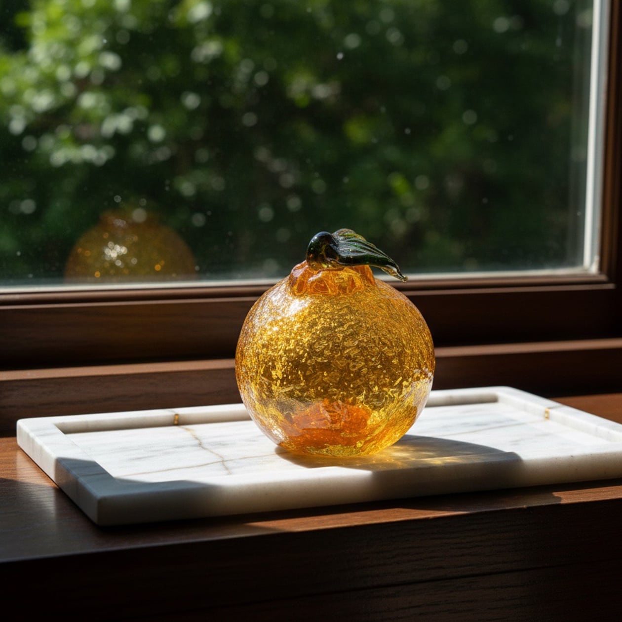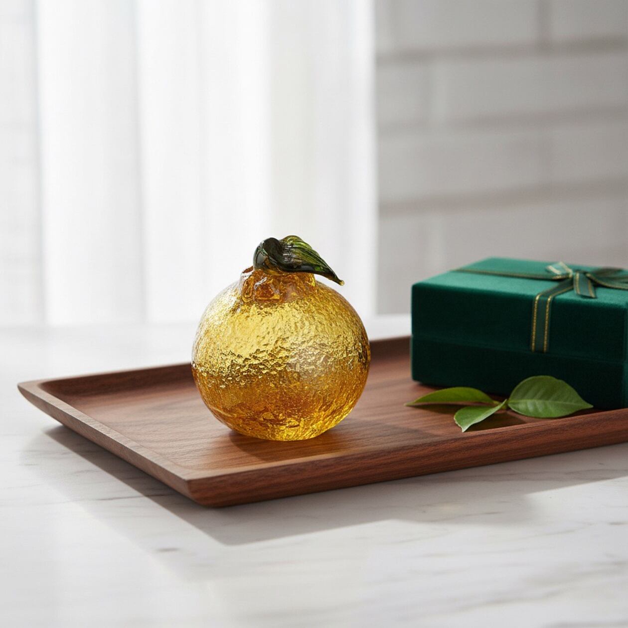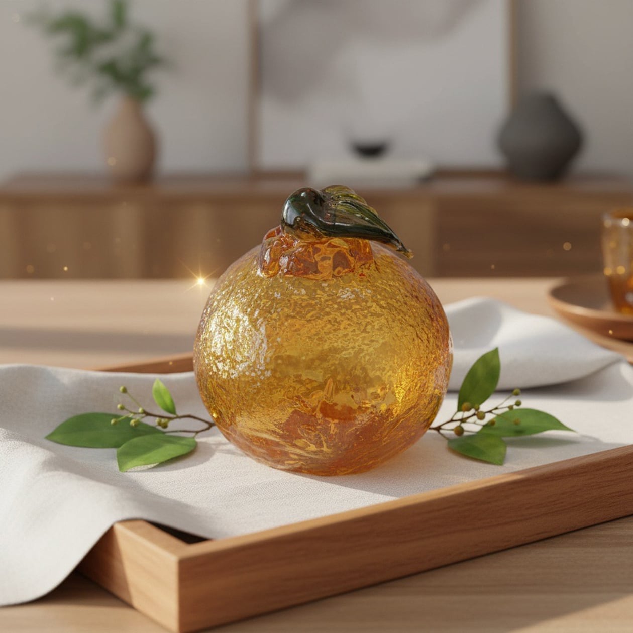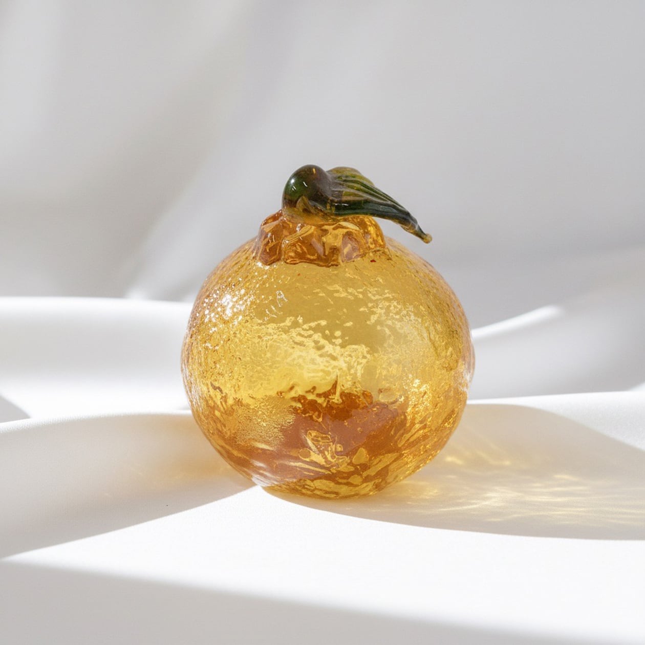 透明感のあるガラスで仕上げた、南国フルーツ「みかん」をモチーフにしたインテリアオブジェです。葉付きのデザインでリアルな印象を演出。窓辺や棚に置くだけで光を受けて美しくきらめき、お部屋に華やかさと遊び心を添えます。ギフトとしてもおすすめです。