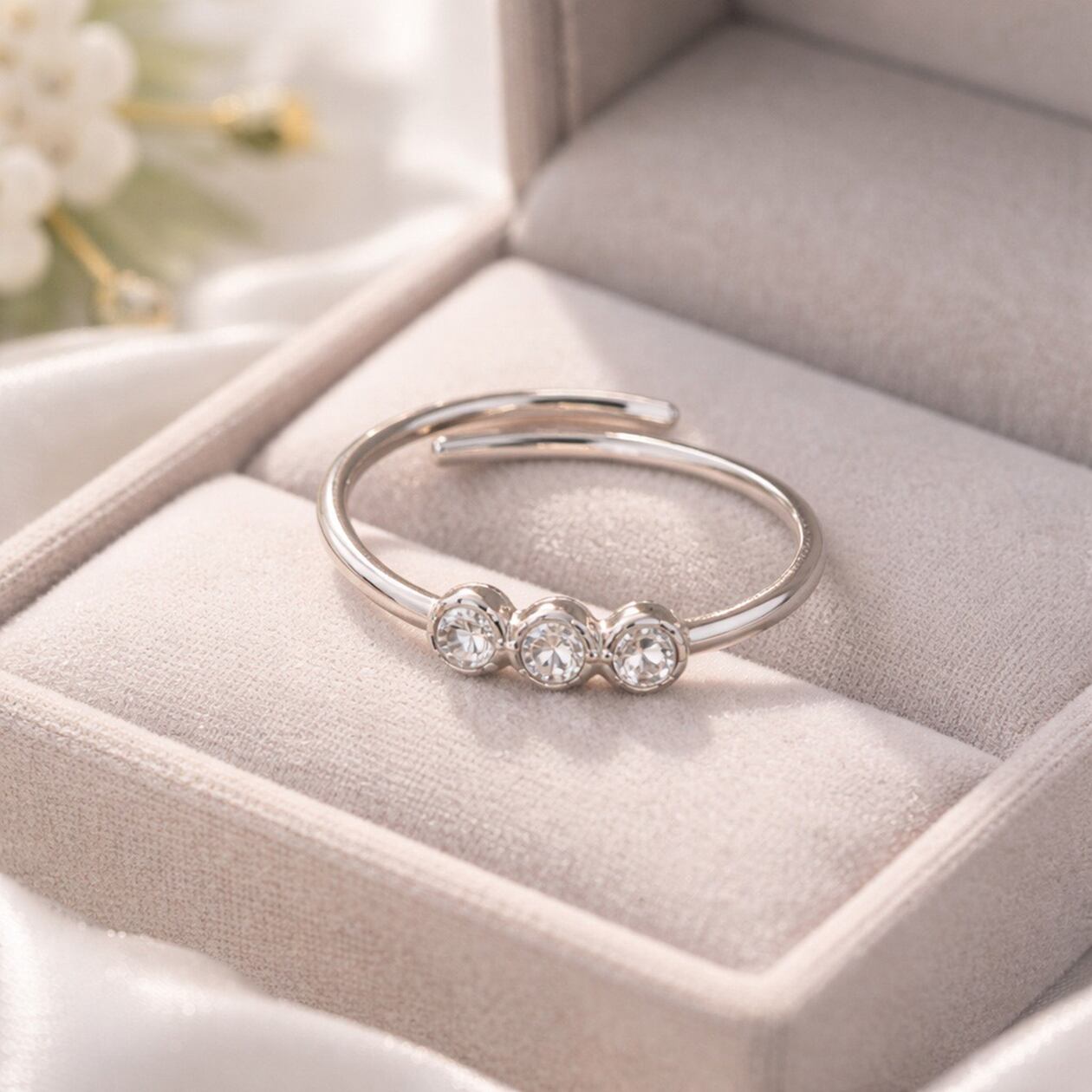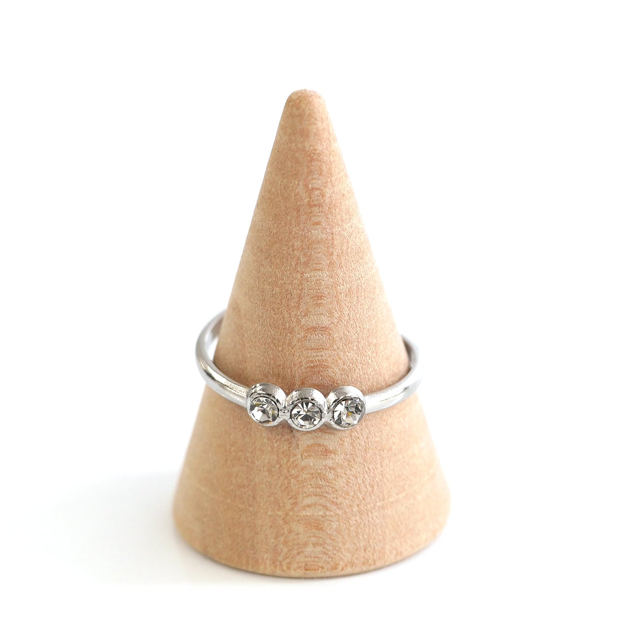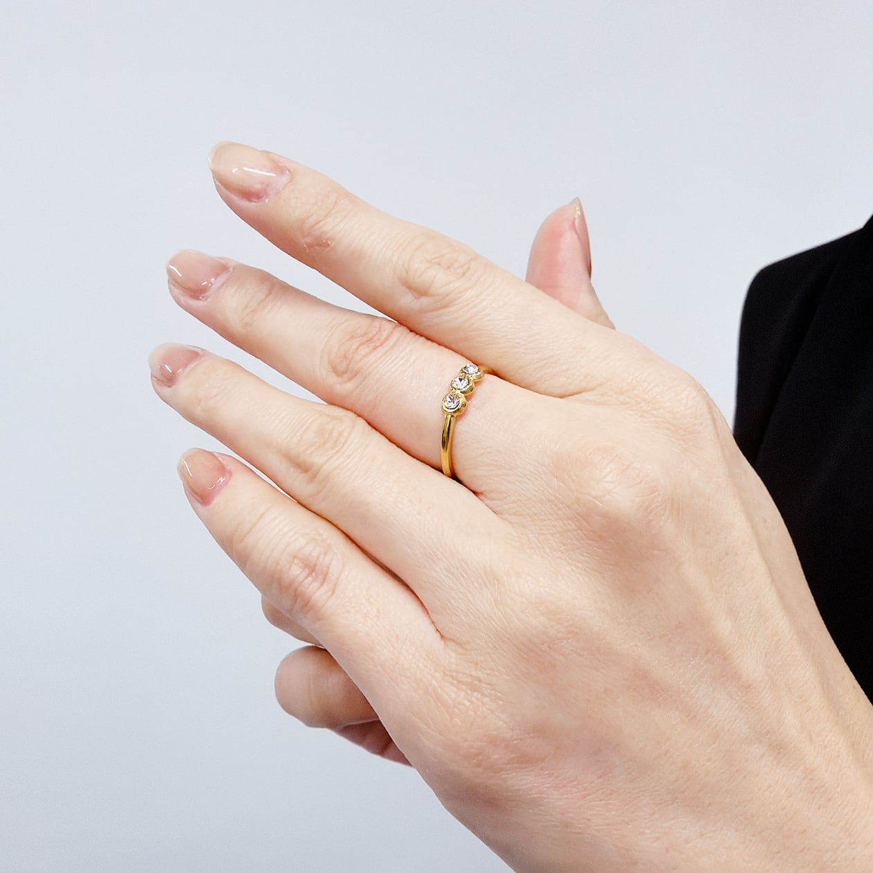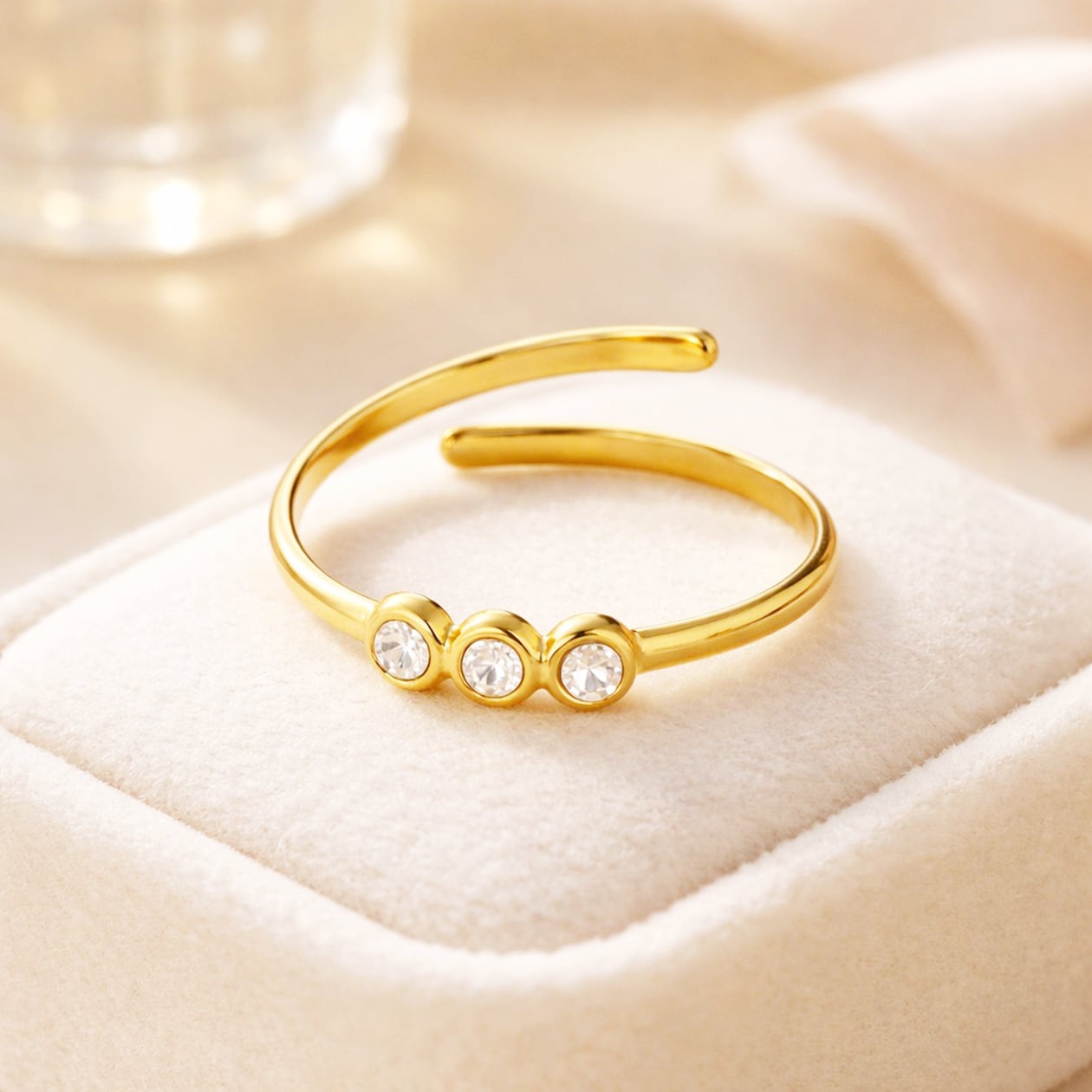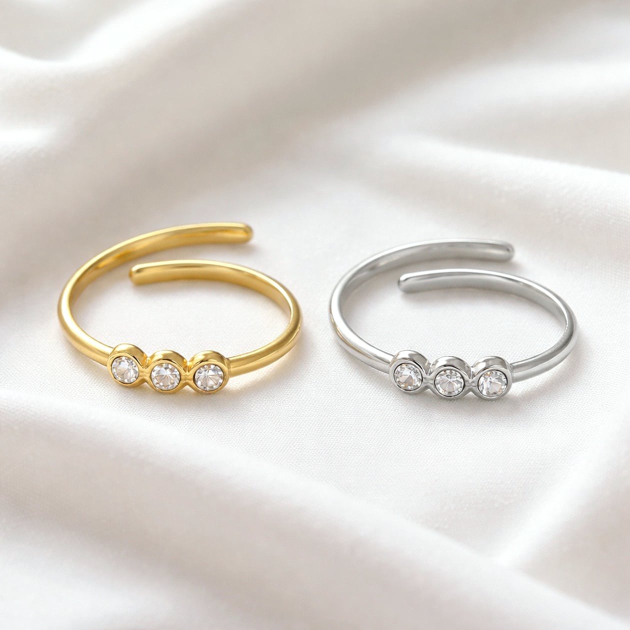3粒のキュービックジルコニアを横一列に配した、ミニマルで上品なオープンリング。