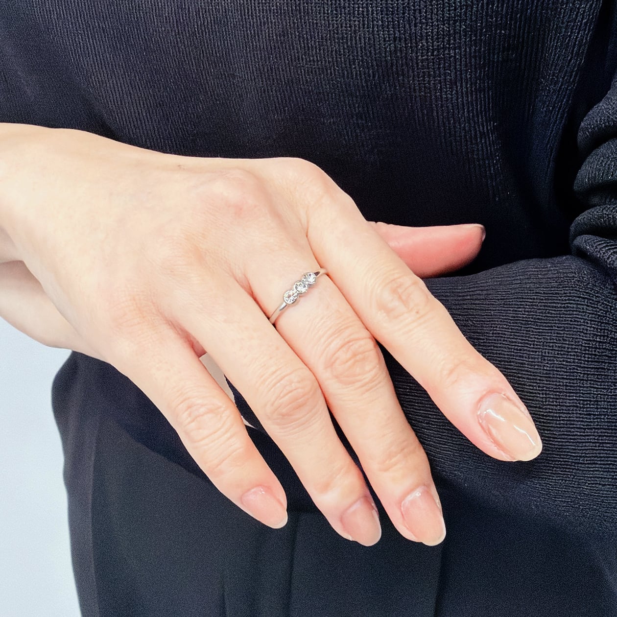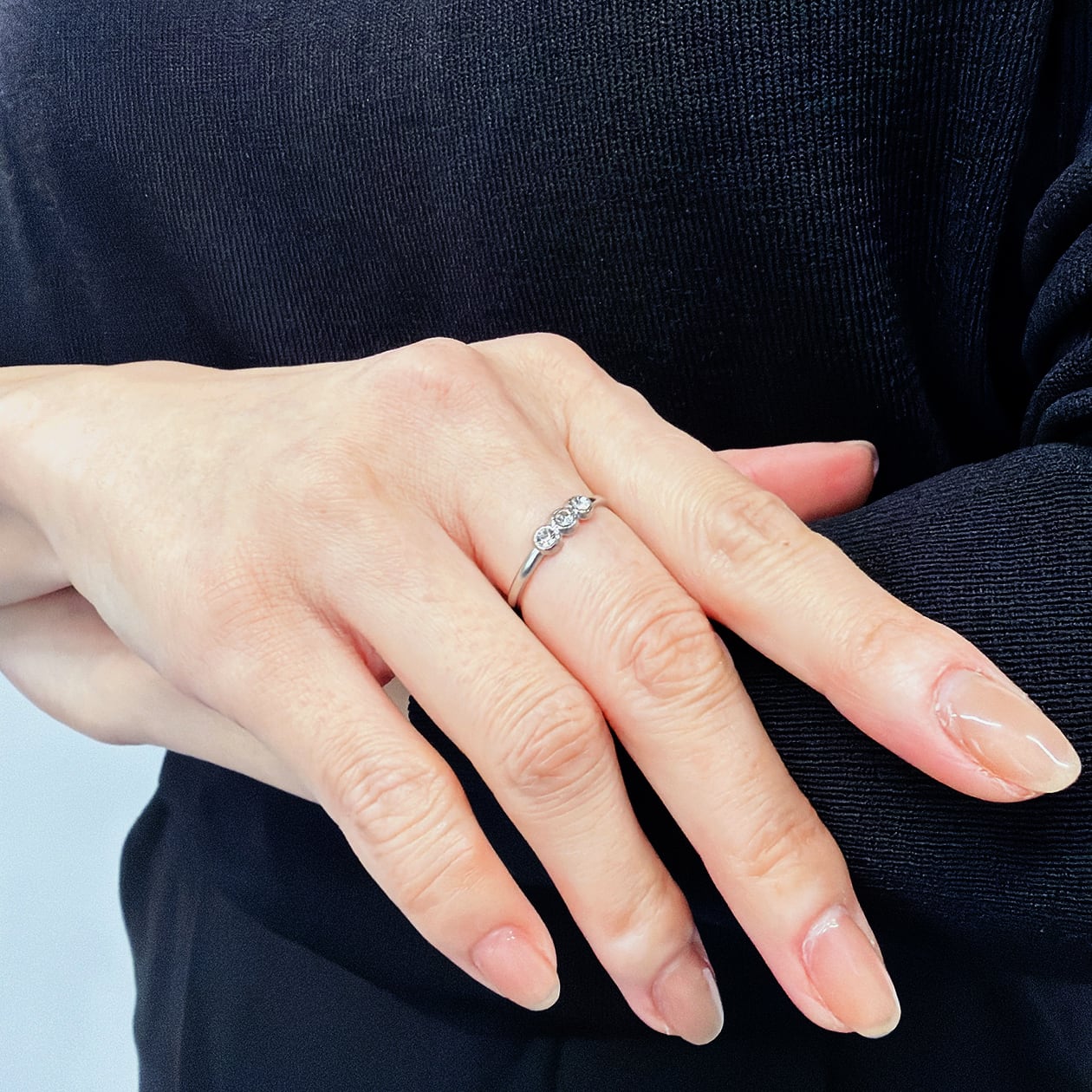 無駄を削ぎ落とした細身のフォルムに、さりげない輝きを添えることで、指元をすっきりと美しく演出します。シンプルながらも程よい存在感があり、デイリーからきれいめスタイルまで幅広く活躍するデザインです。