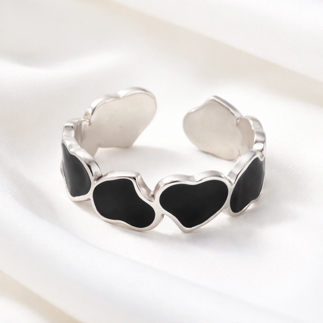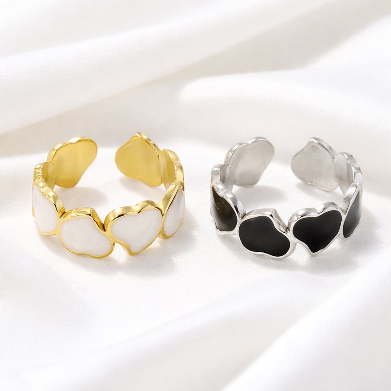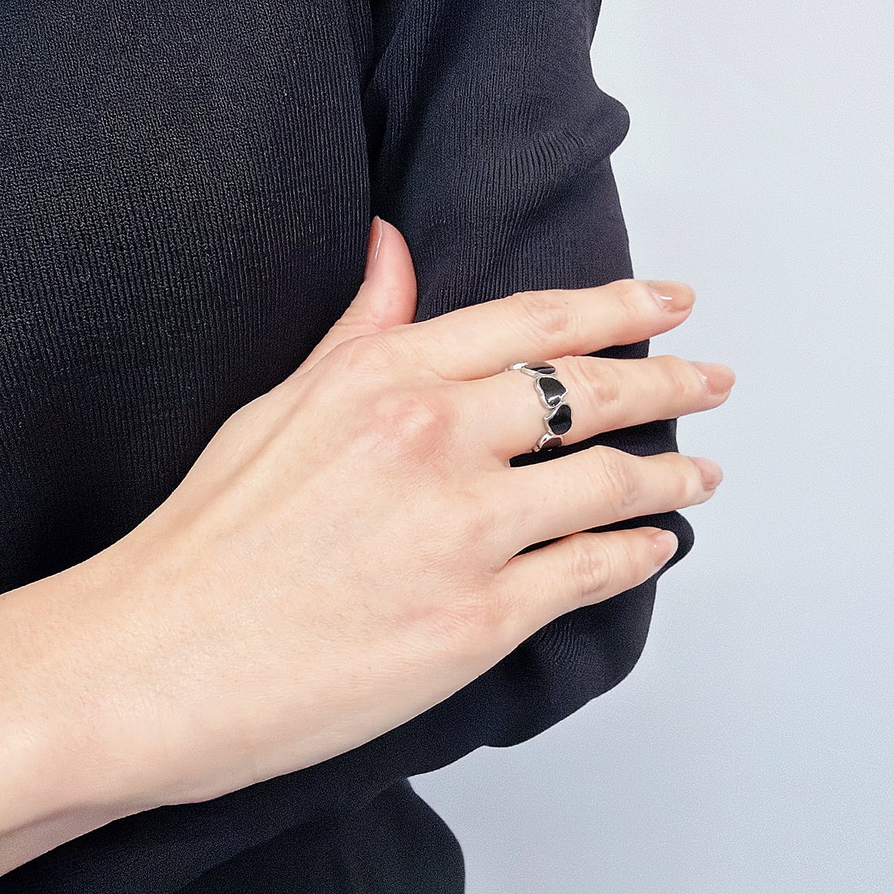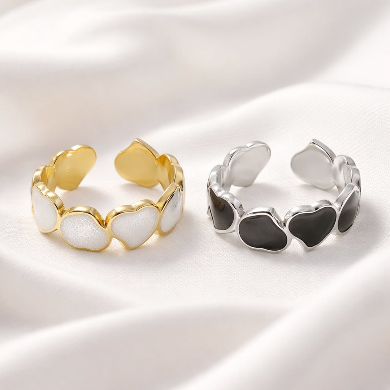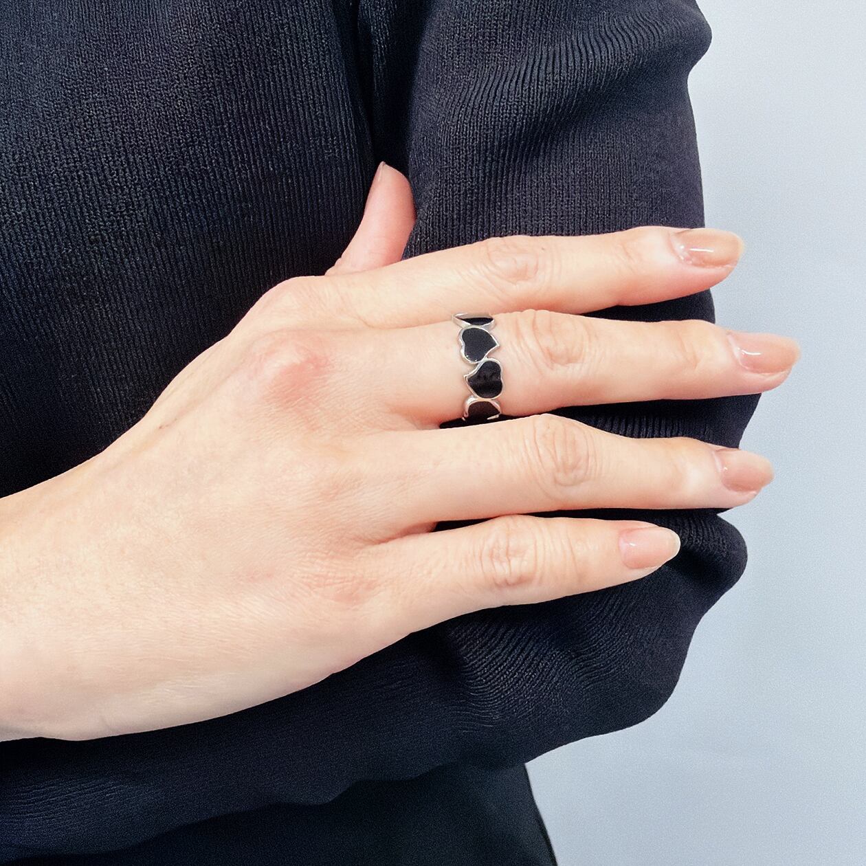 連なるハートモチーフをリング全体に配した、程よい存在感のオープンリング。丸みのあるフォルムとすっきりとしたラインが指元に自然になじみ、甘さを抑えた大人のスタイリングにも合わせやすいデザインです。ゴールド・シルバーそれぞれのカラーに、ブラック/ホワイトのコントラストがさりげないアクセントとなり、シンプルな装いにも自然に溶け込みます。