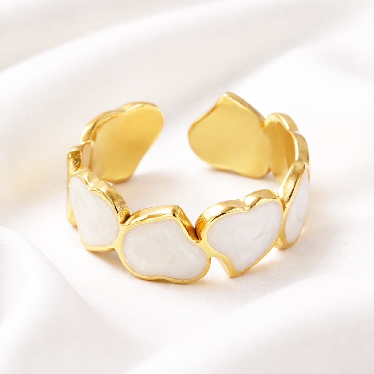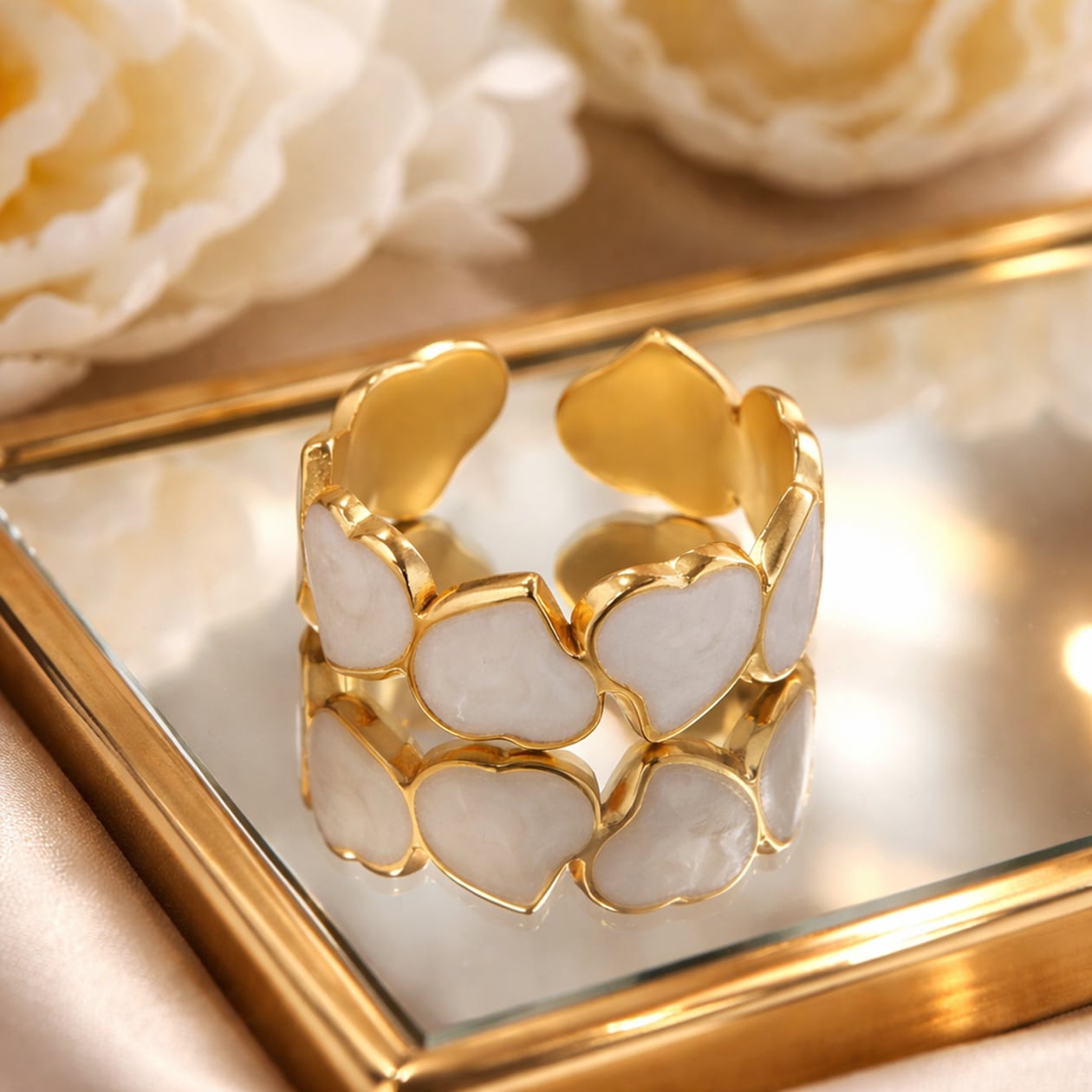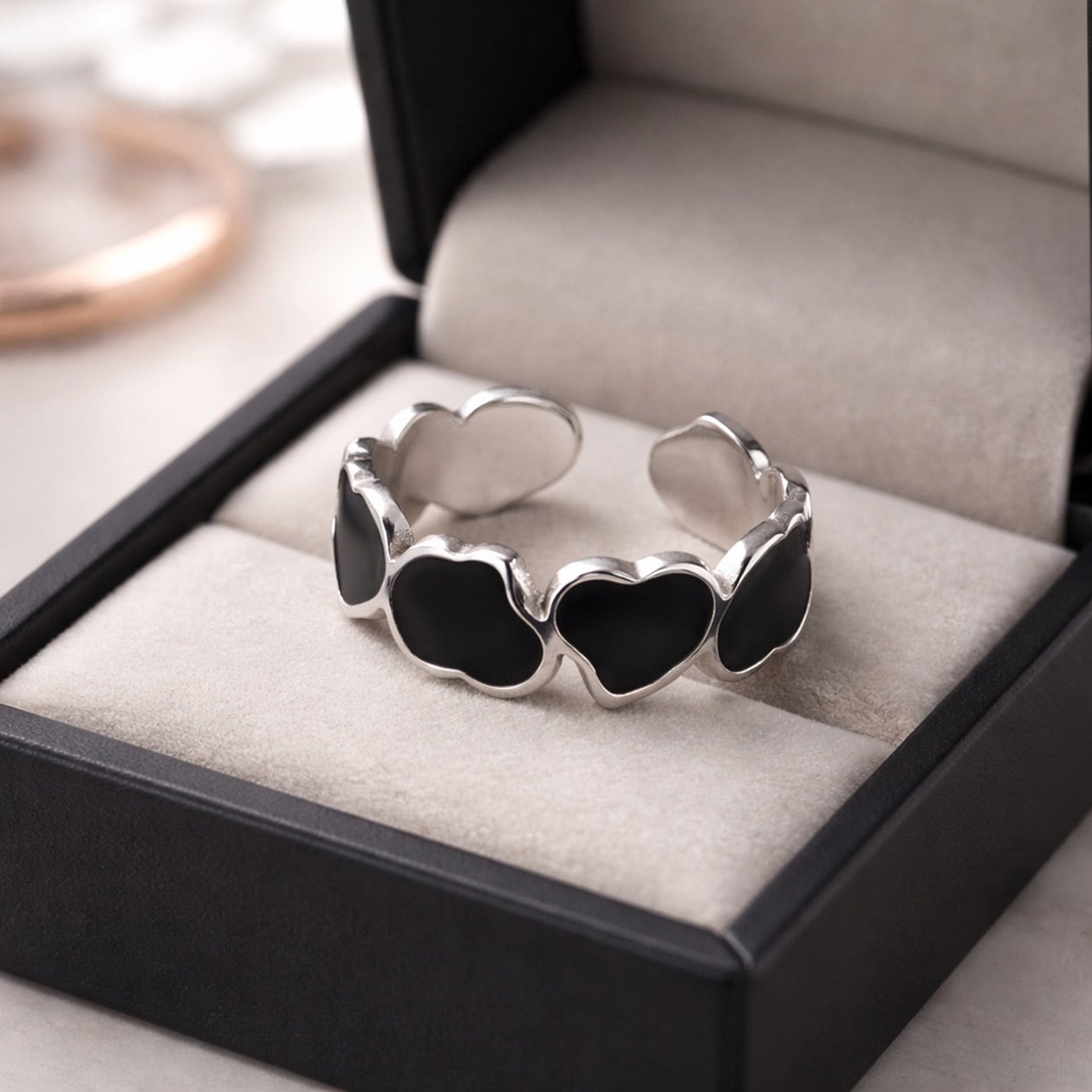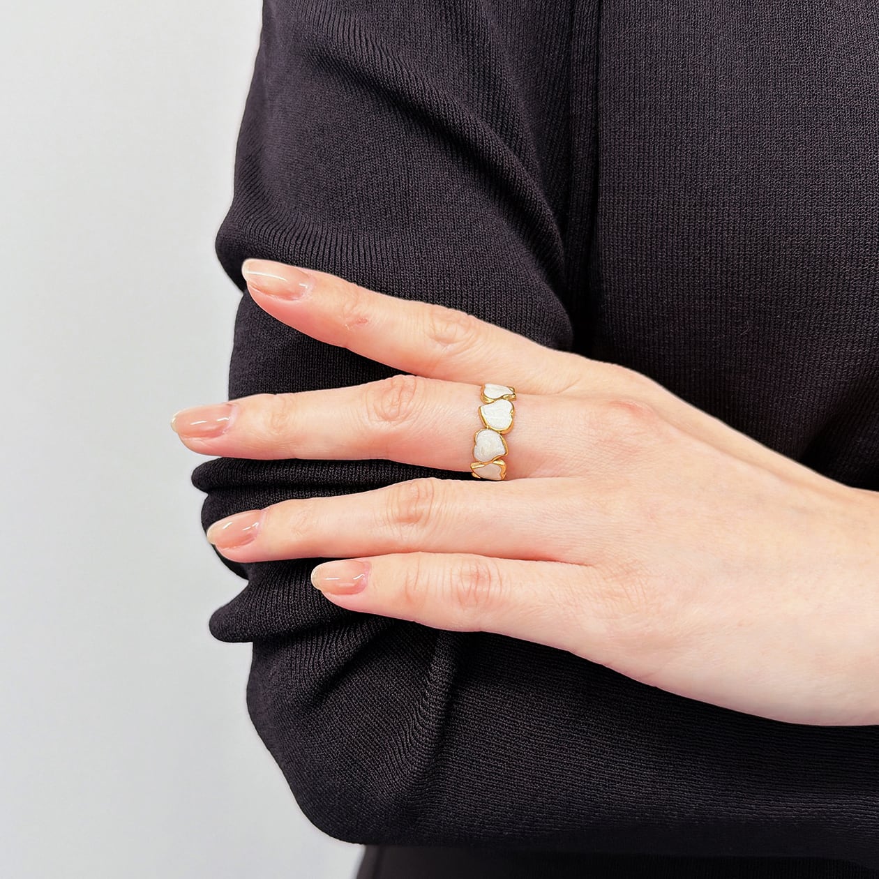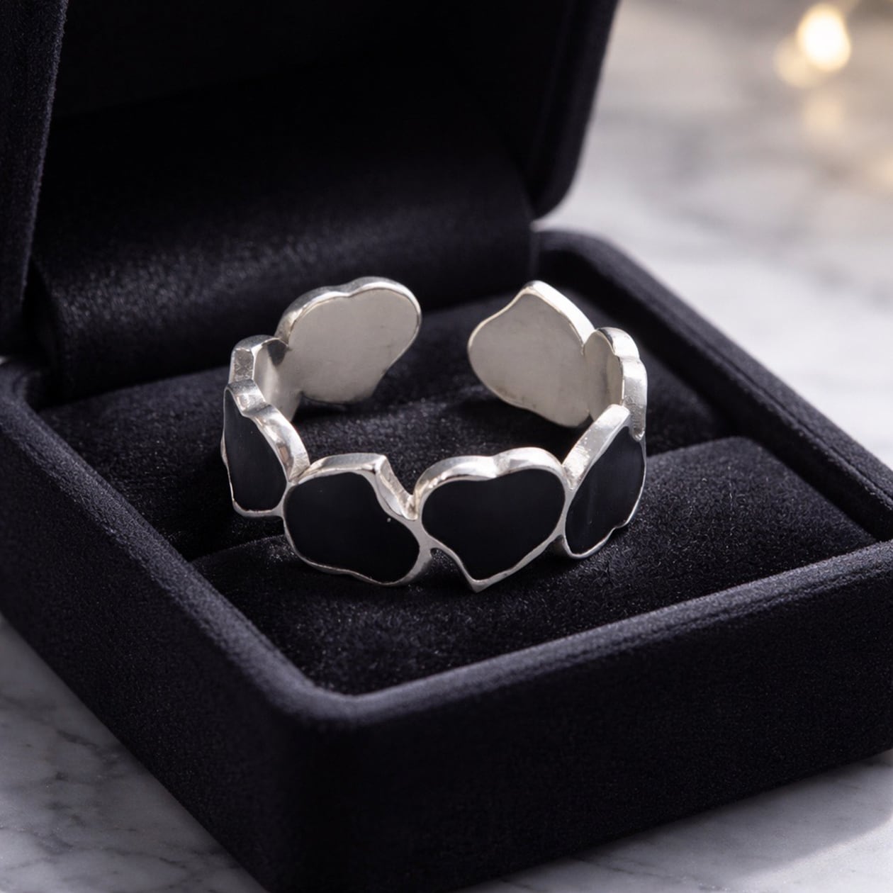 連なるハートモチーフをリング全体に配した、程よい存在感のオープンリング。丸みのあるフォルムとすっきりとしたラインが指元に自然になじみ、甘さを抑えた大人のスタイリングにも合わせやすいデザインです。ゴールド・シルバーそれぞれのカラーに、ブラック/ホワイトのコントラストがさりげないアクセントとなり、シンプルな装いにも自然に溶け込みます。