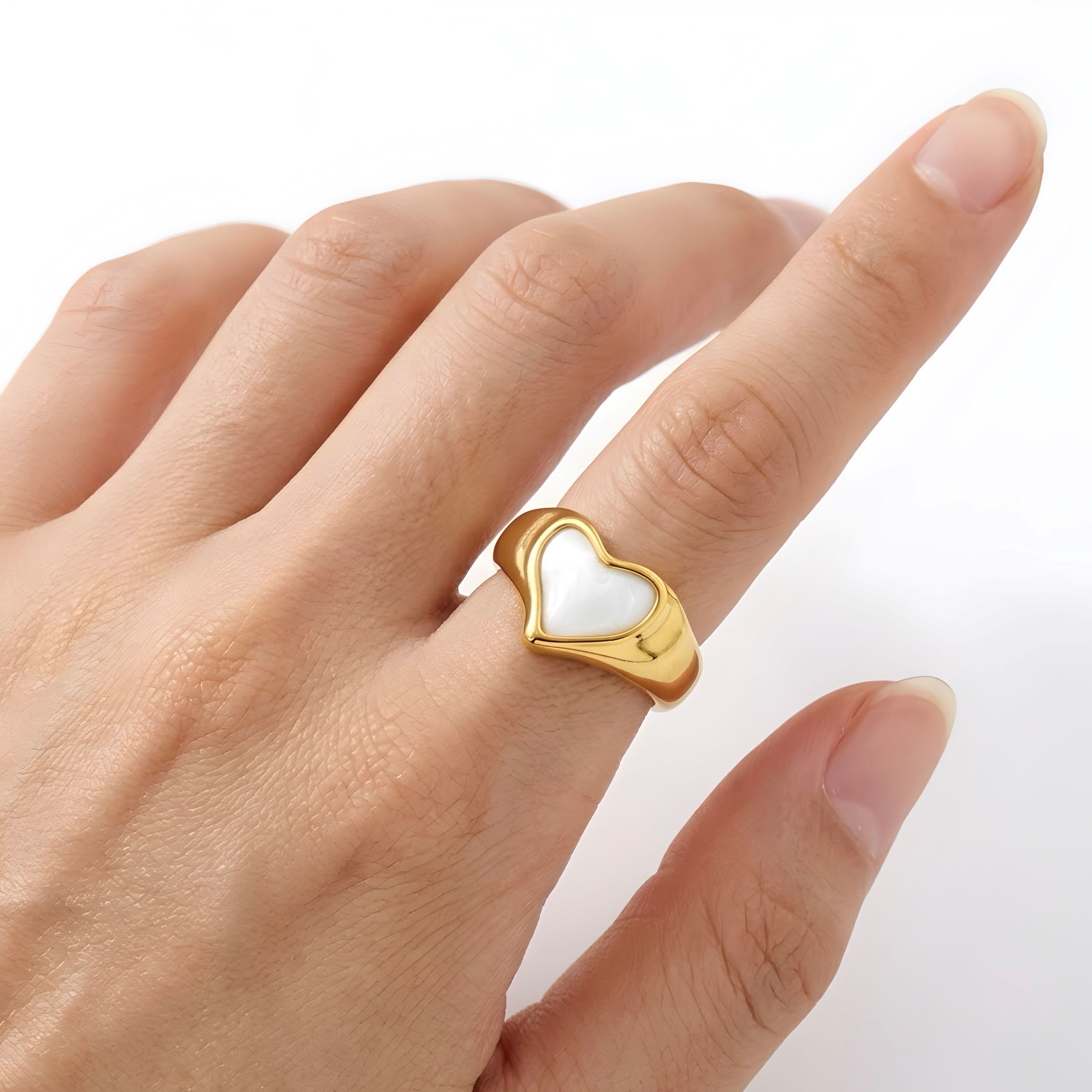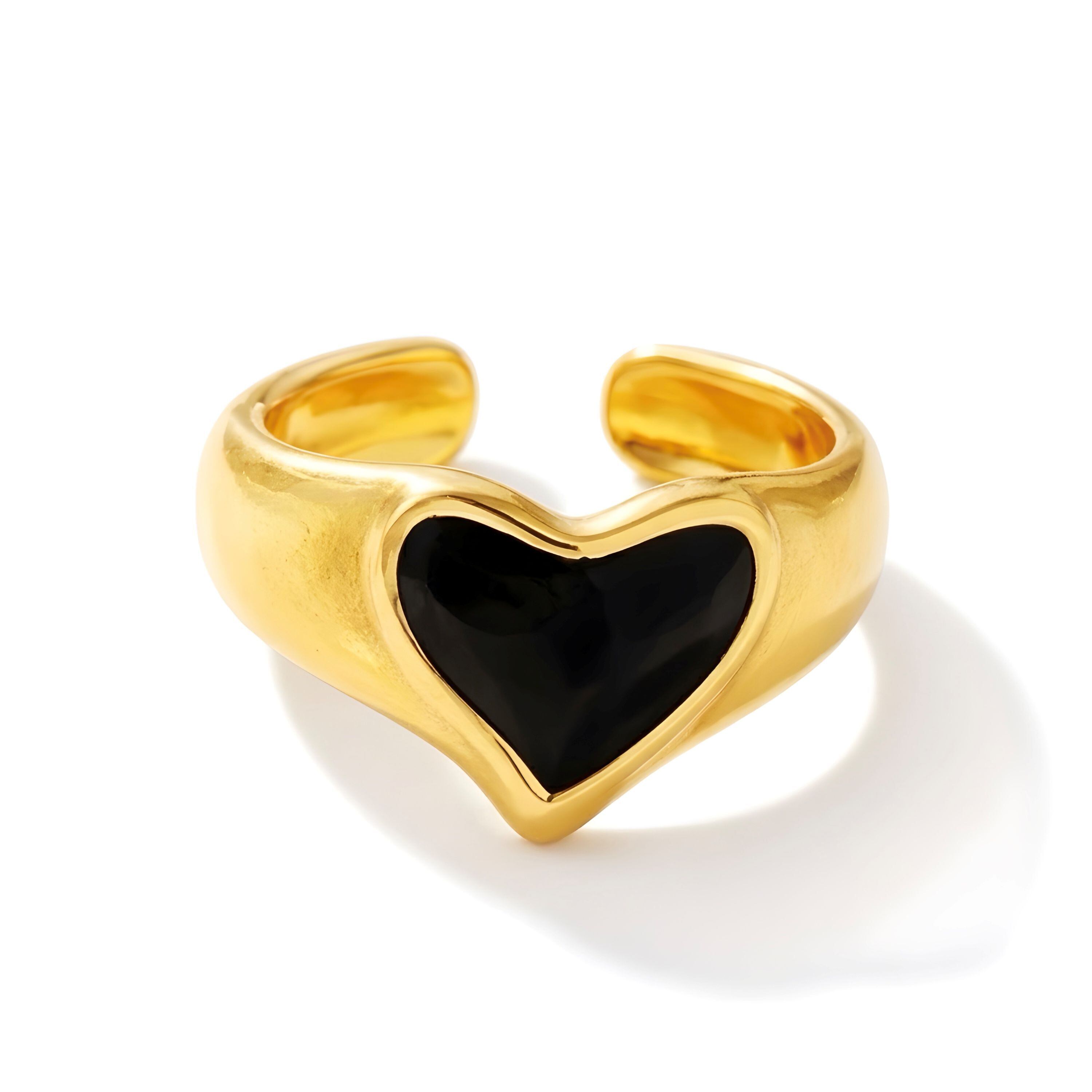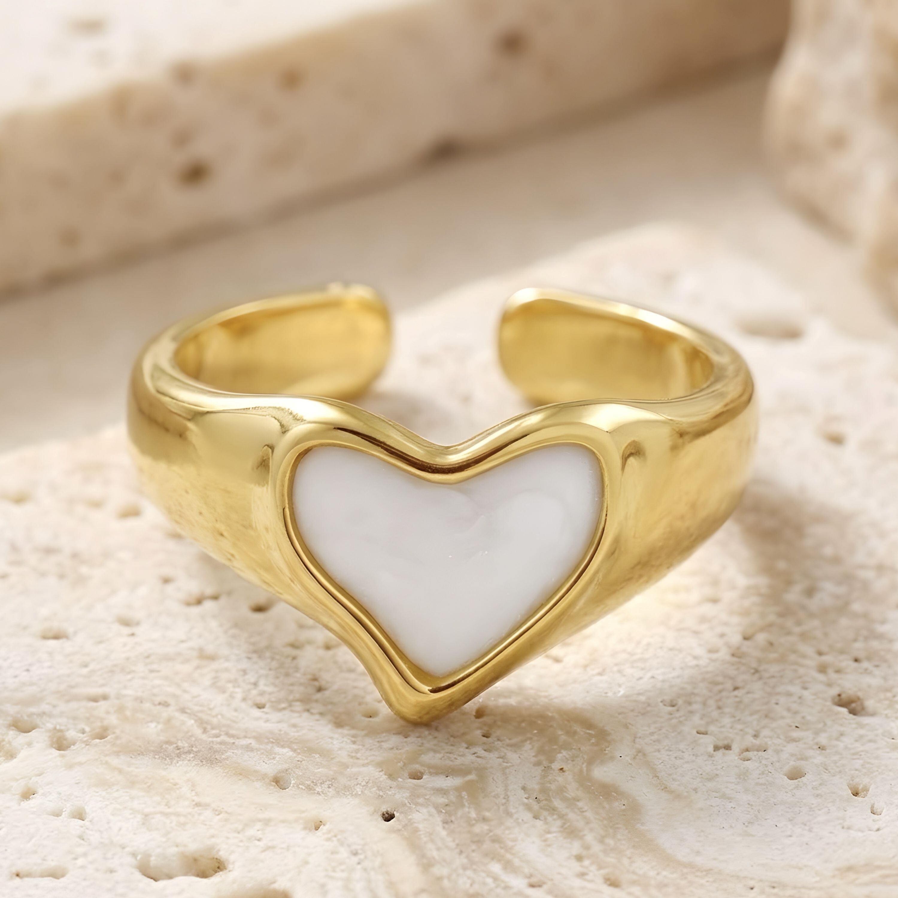なめらかなフォルムのハートモチーフが指元にやさしく馴染む、サージカルステンレス316L製のオープンリング。程よい厚みのゴールドベースに、艶のある表情が特徴のデザインで、甘くなりすぎず大人のスタイリングに自然に溶け込みます。